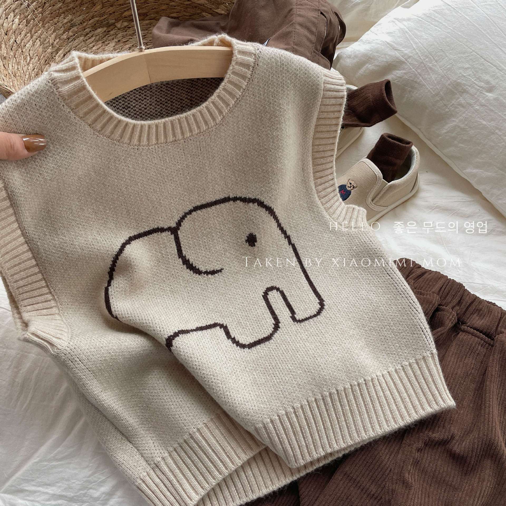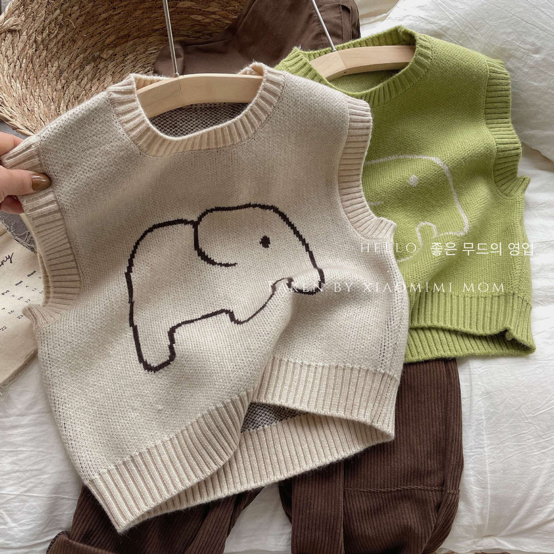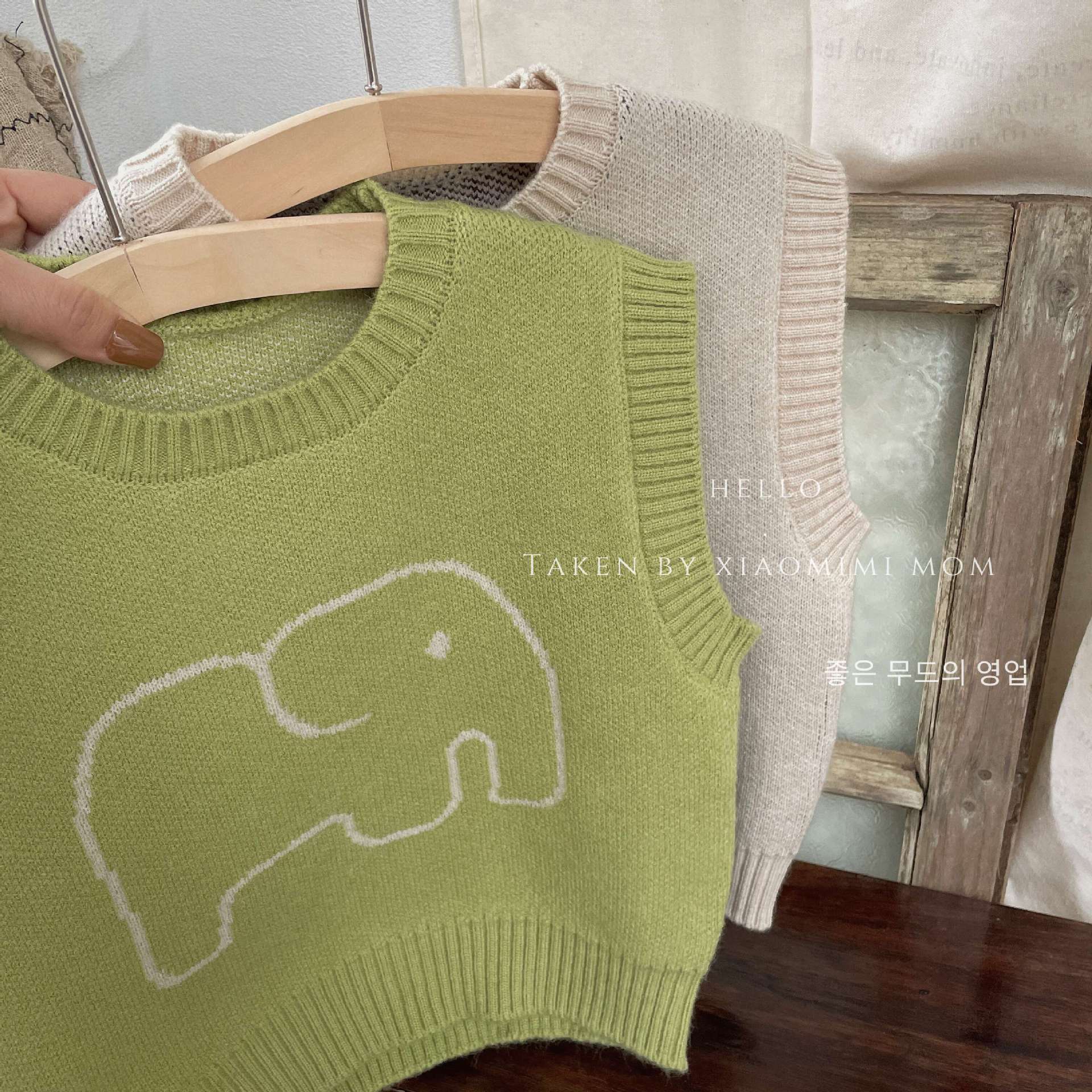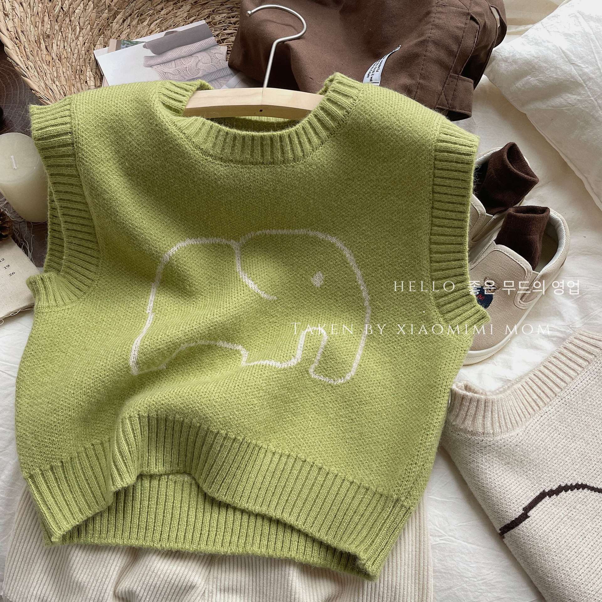 2025 한국 어린이 만화 코끼리 자카드 니트 조끼 봄 가을 신상 남녀 공용 라운드넥 풀오버 스웨터스토어 가기