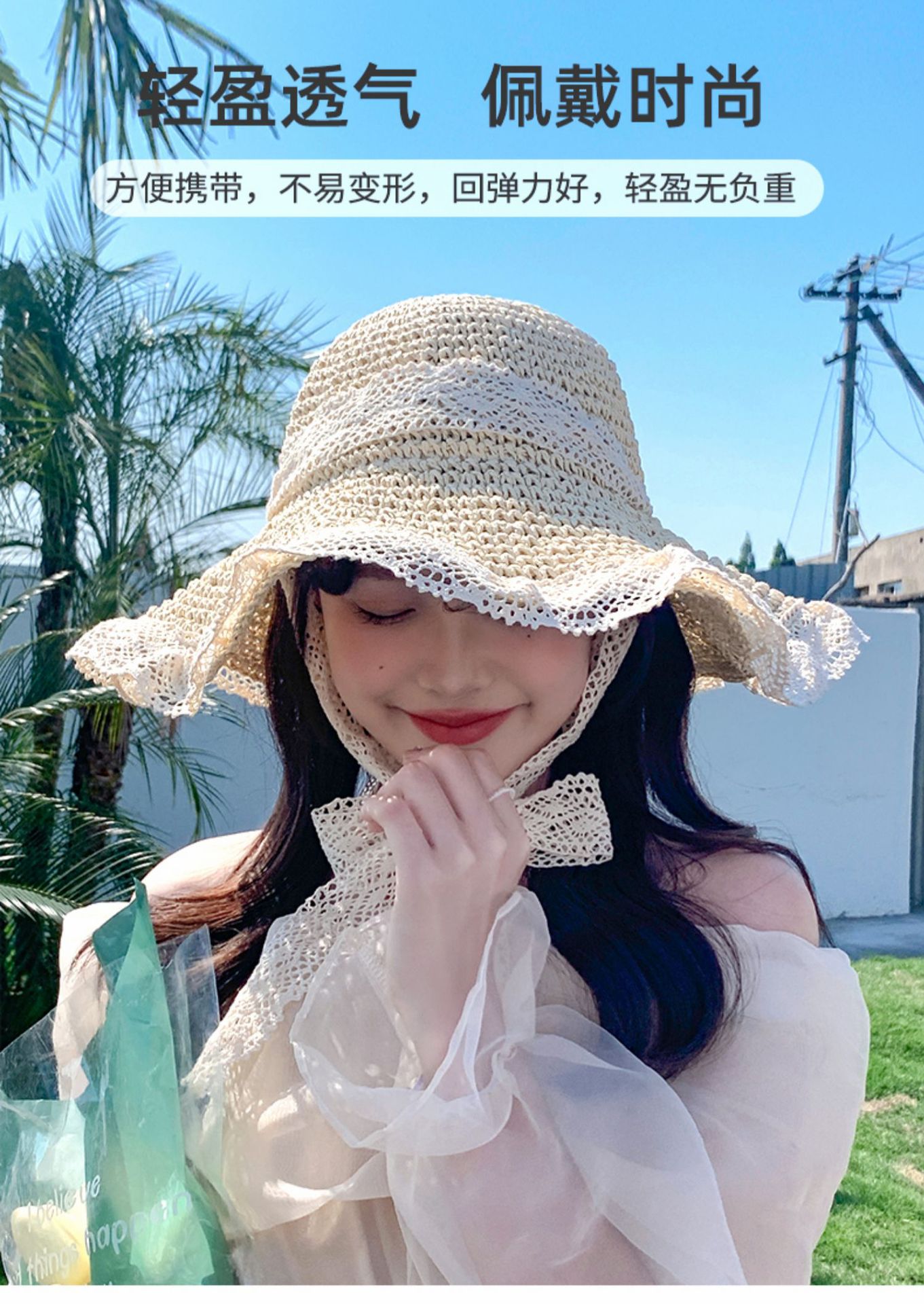 밀짚 모자 한국식 레이스 업 중공 밀짚 모자 여성용 여름 여행 자외선 차단제 비치 태양 모자 레이스 차양 모자스토어 가기