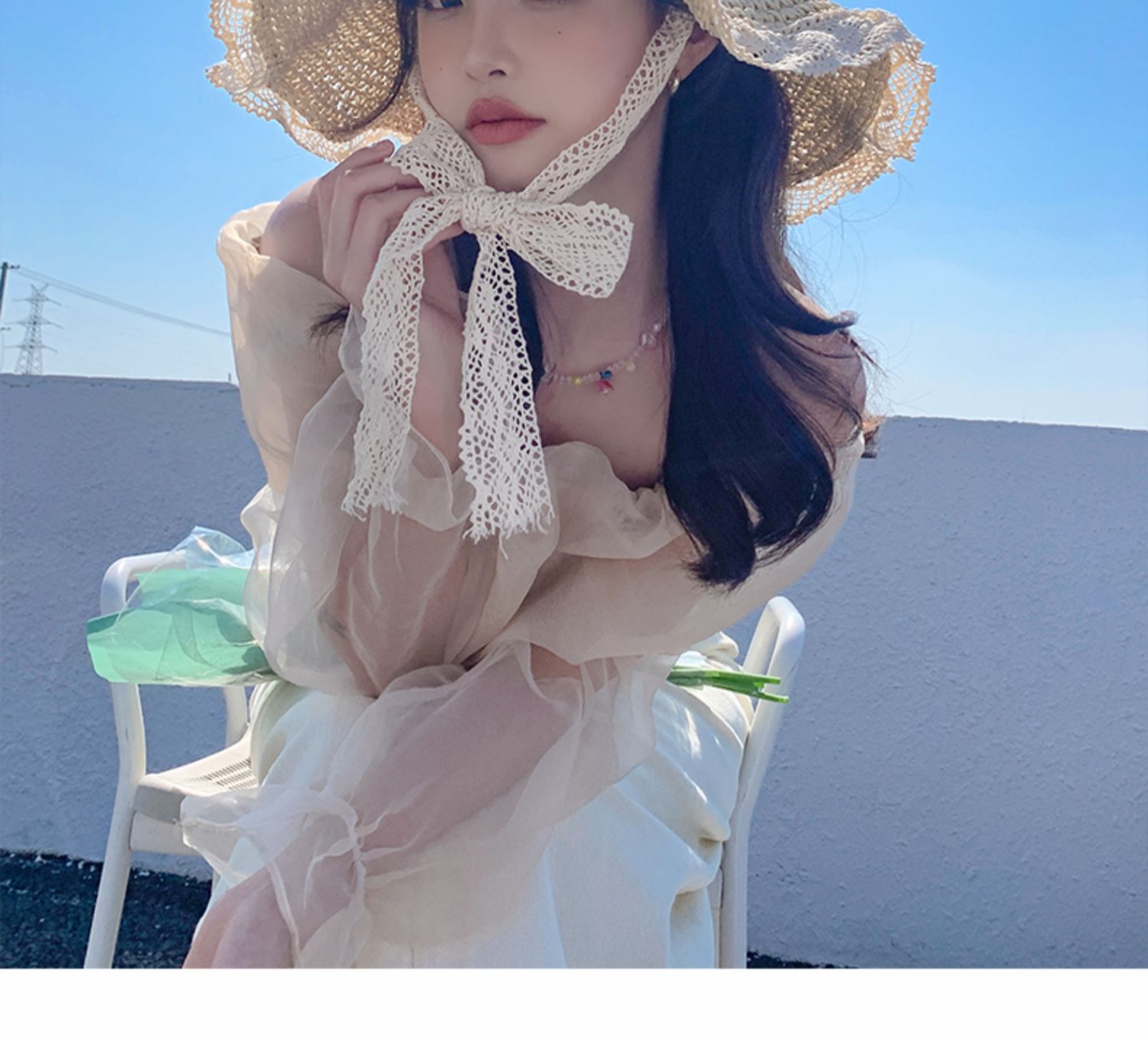 밀짚 모자 한국식 레이스 업 중공 밀짚 모자 여성용 여름 여행 자외선 차단제 비치 태양 모자 레이스 차양 모자