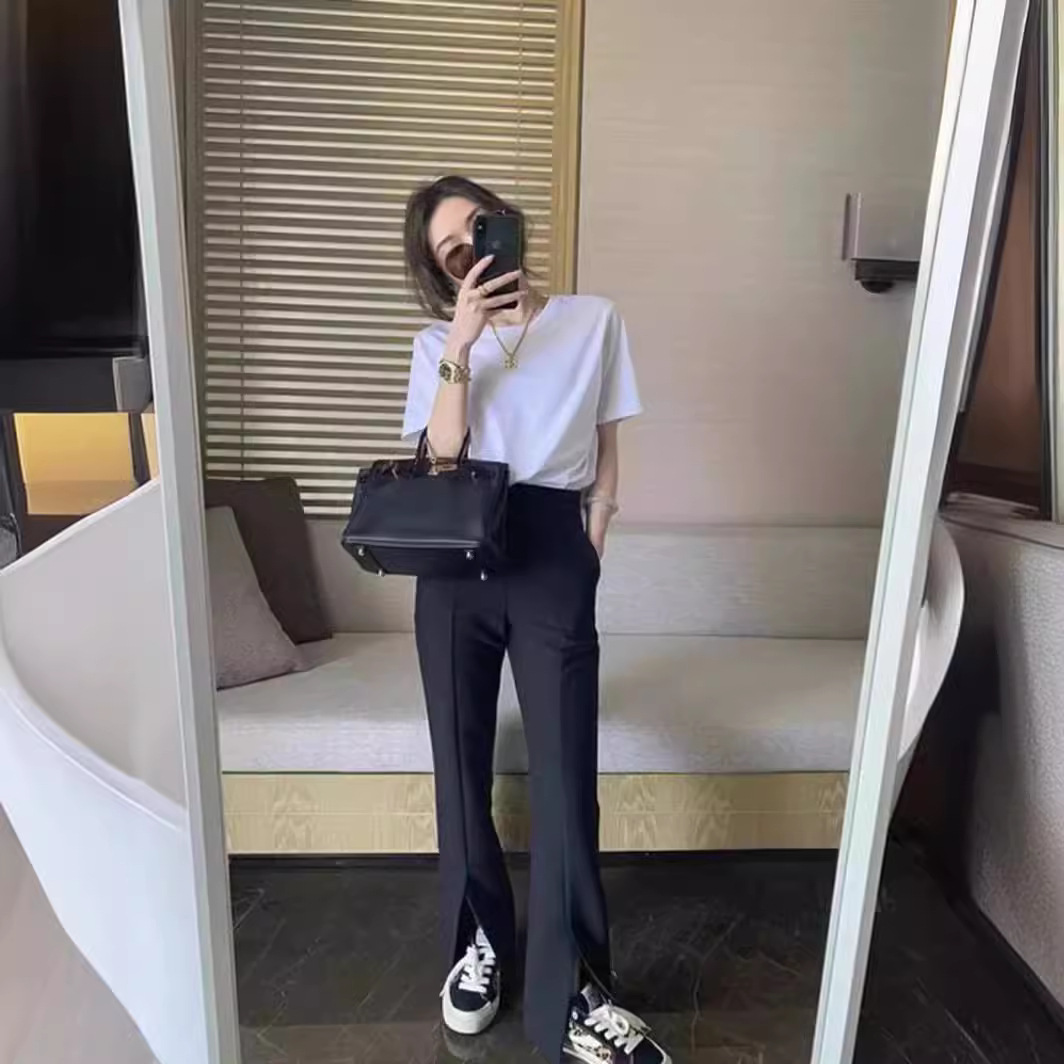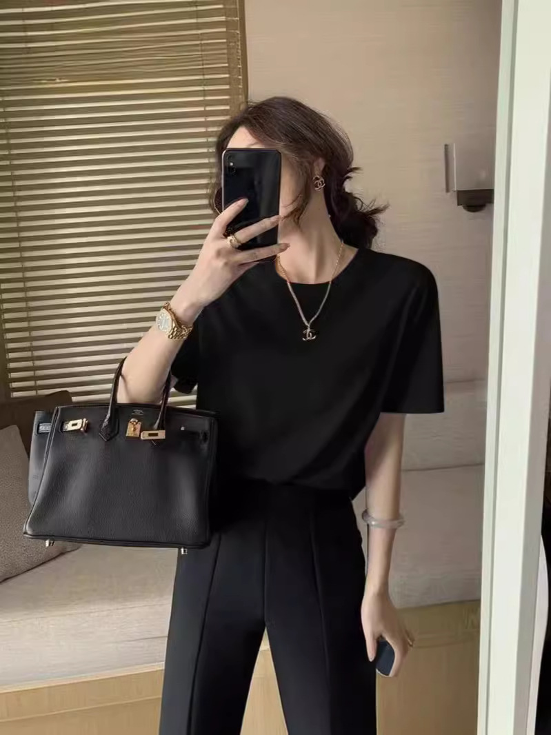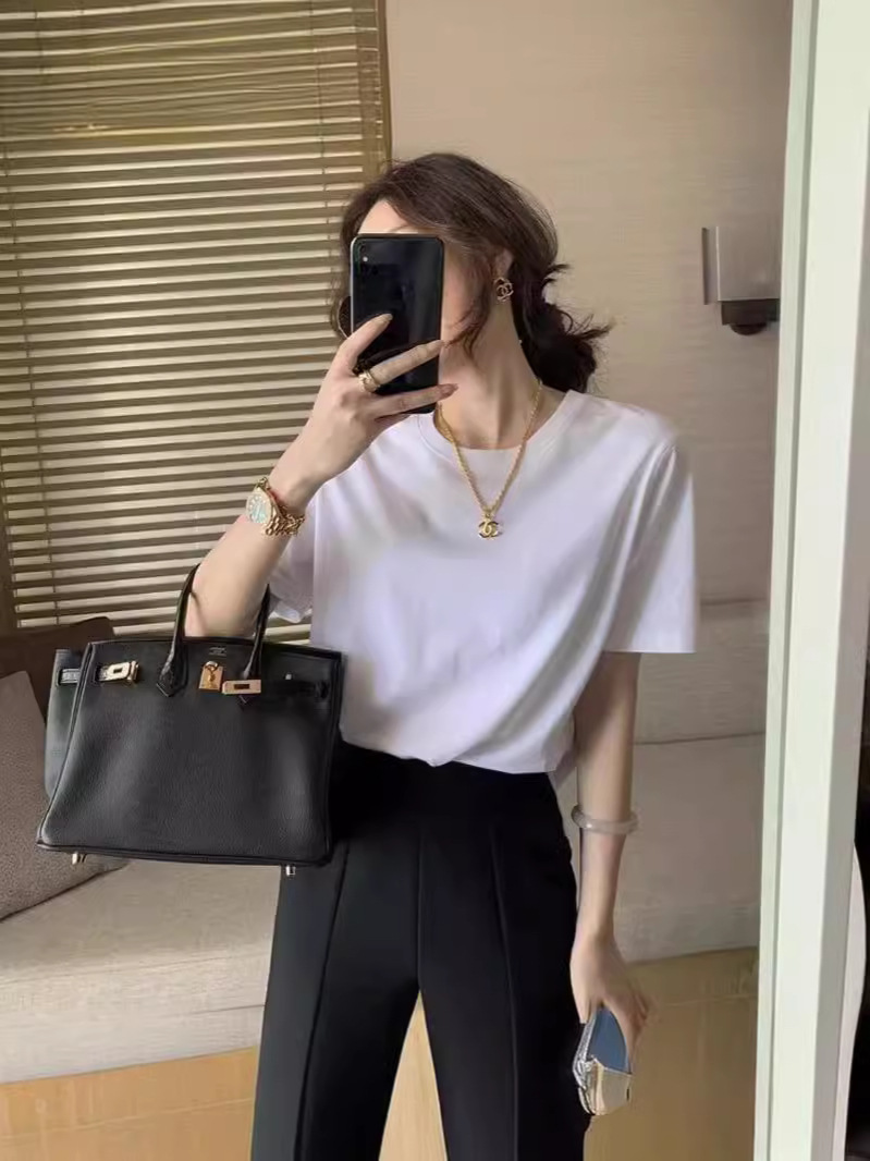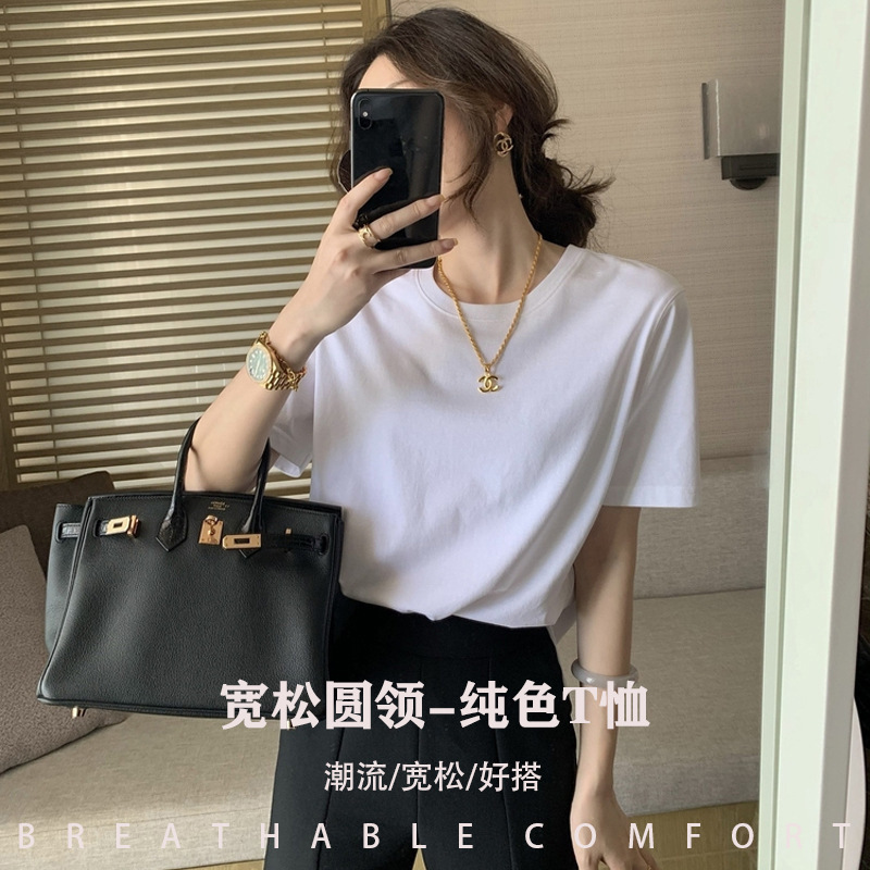 여성을위한 무거운 순수 코튼 화이트 오른쪽 어깨 반팔 티셔츠 의류 여름 느슨한 내부 레이어 솔리드 컬러 탑 도매스토어 가기