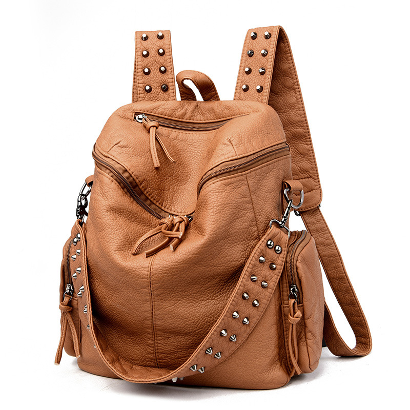 새로운 패션 리벳 백팩 워시 가죽 백팩 대용량 멀티 포켓 소프트 백 크로스 보더 패션 여행 배낭