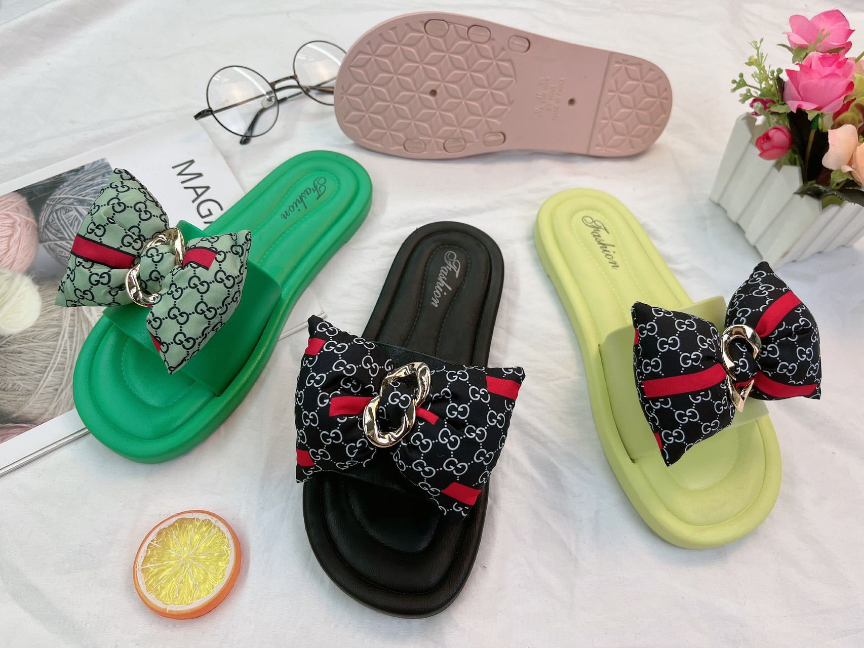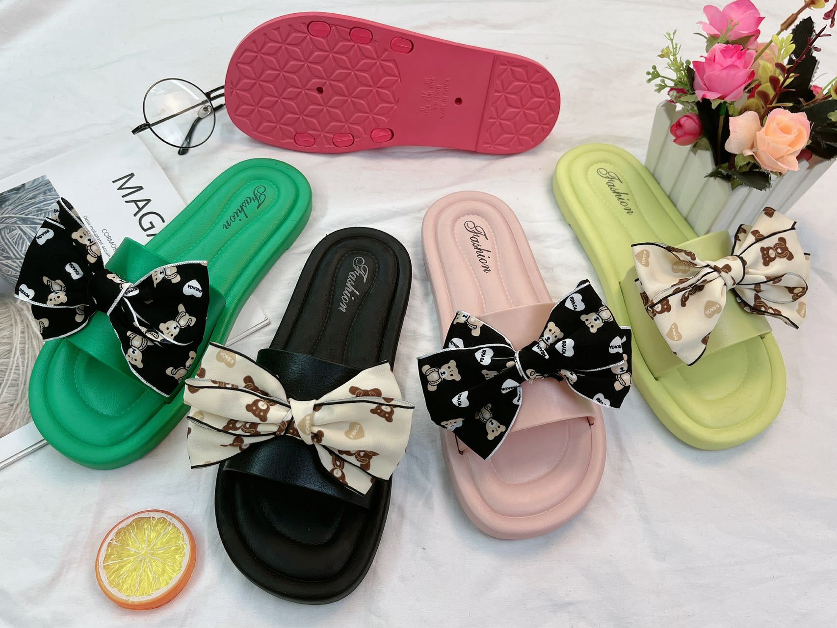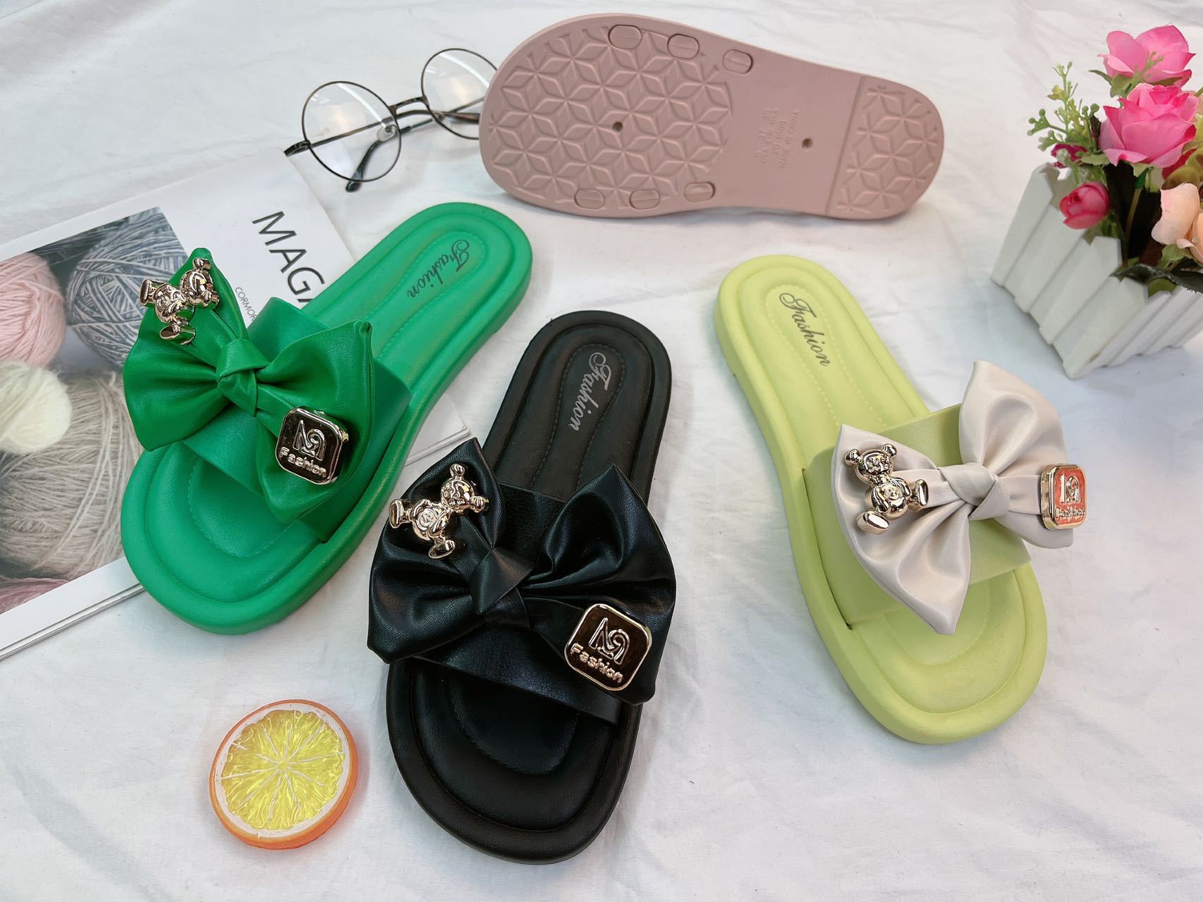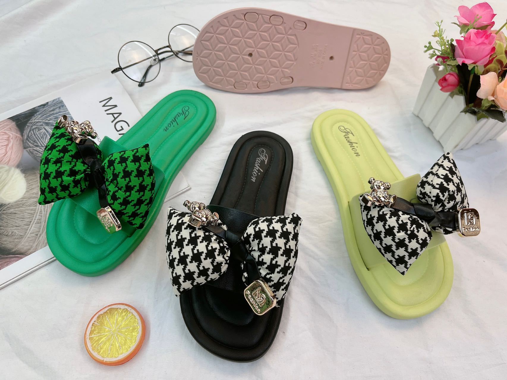 여성 슬리퍼 2023 여름 새로운 평면 부드러운 바닥 캔디 컬러 활 홈 야외 착용 공장 직접 도매스토어 가기