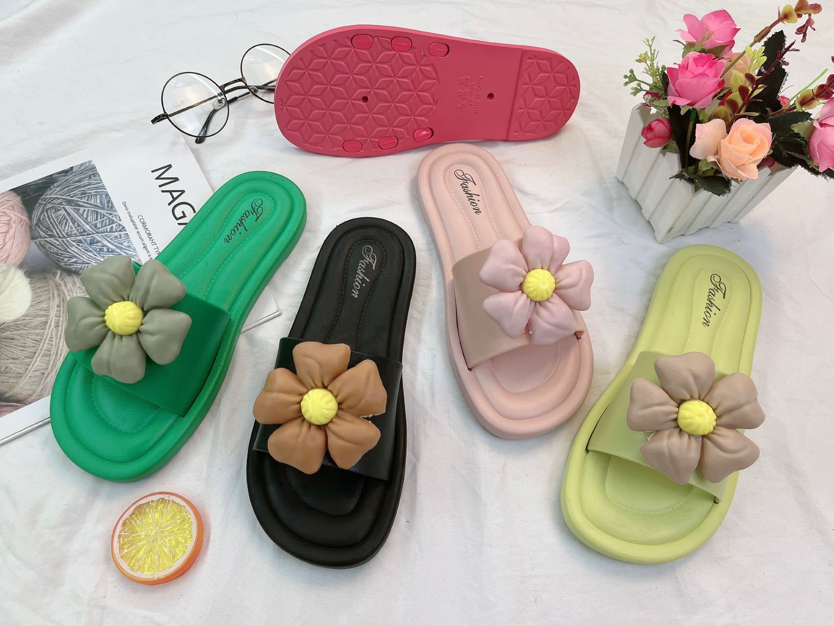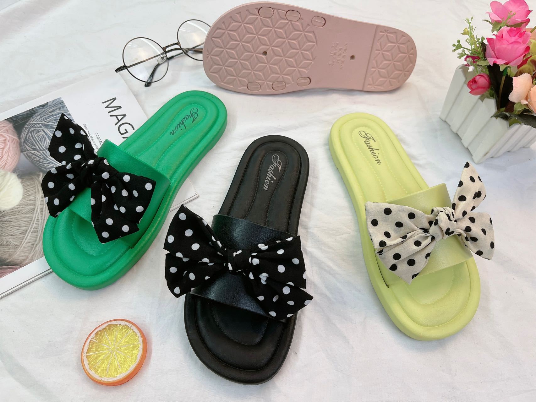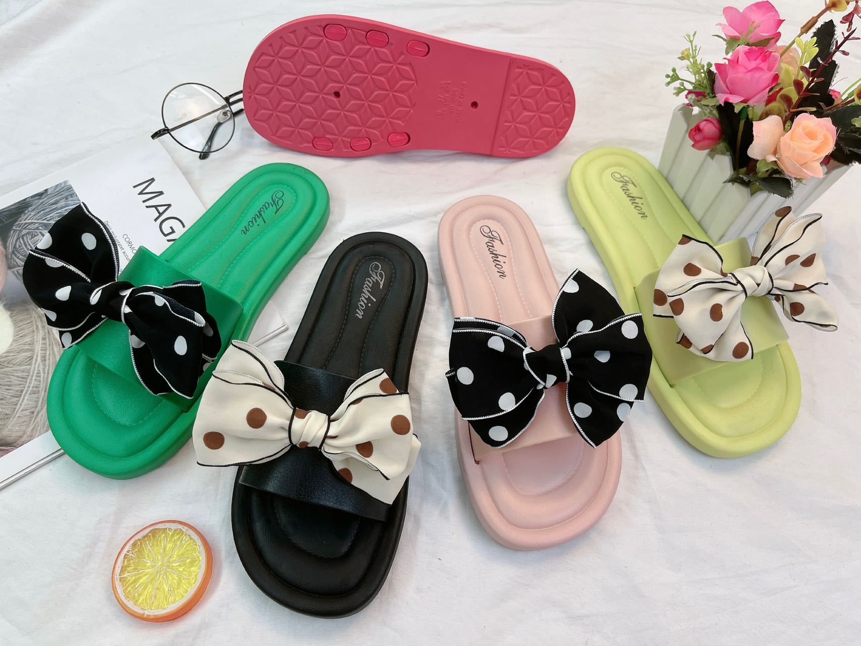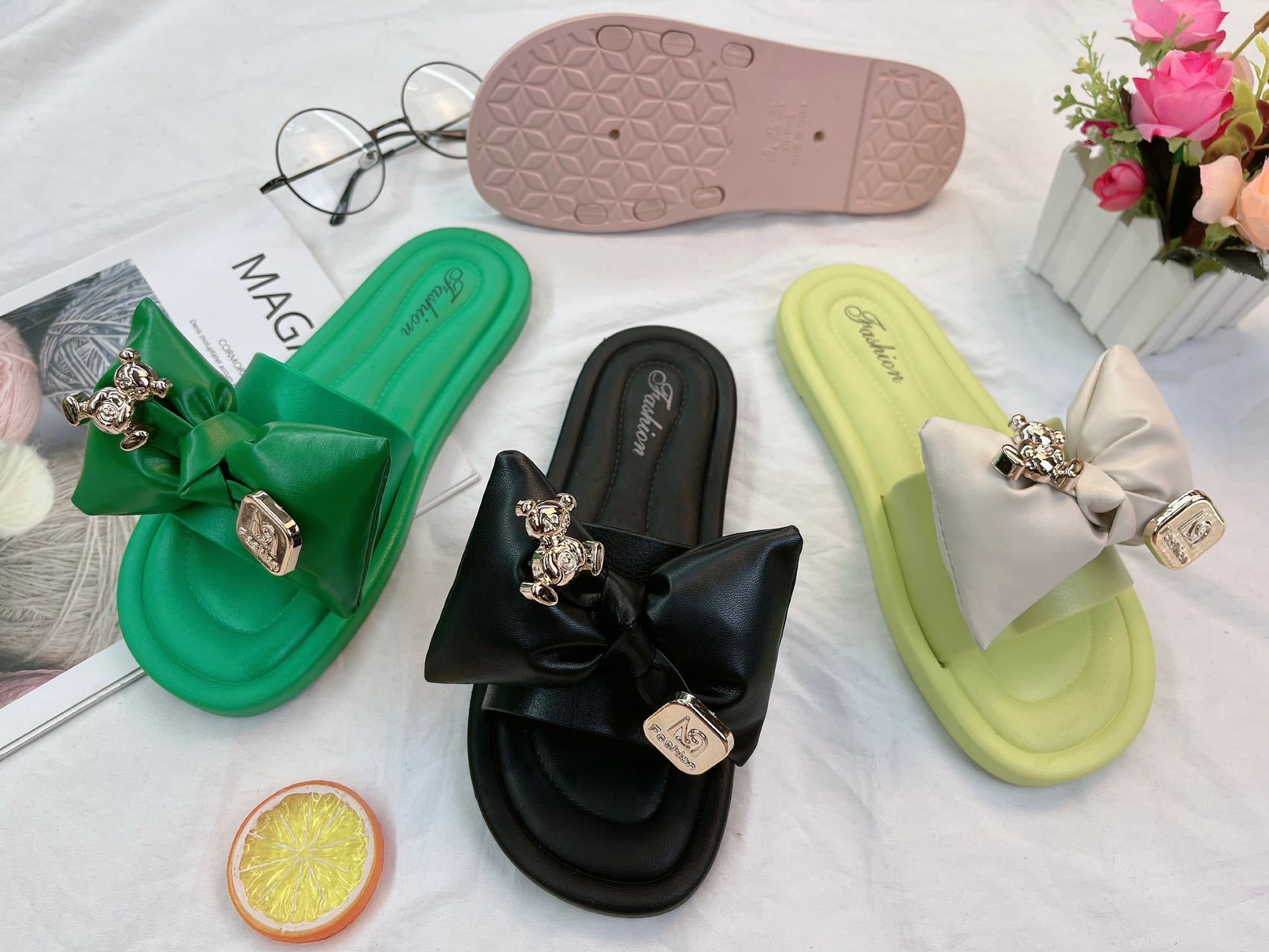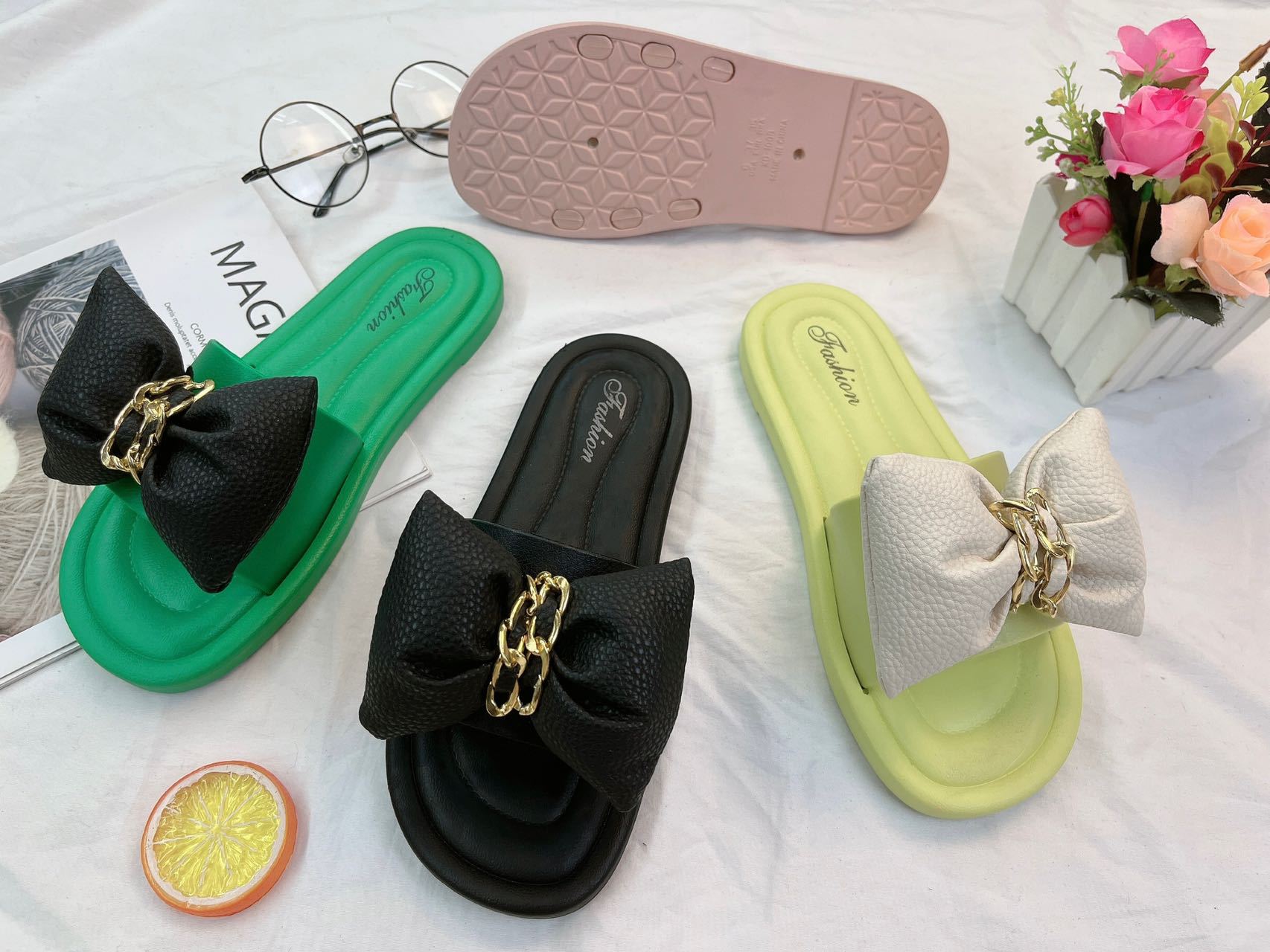 여성 슬리퍼 2023 여름 새로운 평면 부드러운 바닥 캔디 컬러 활 홈 야외 착용 공장 직접 도매스토어 가기