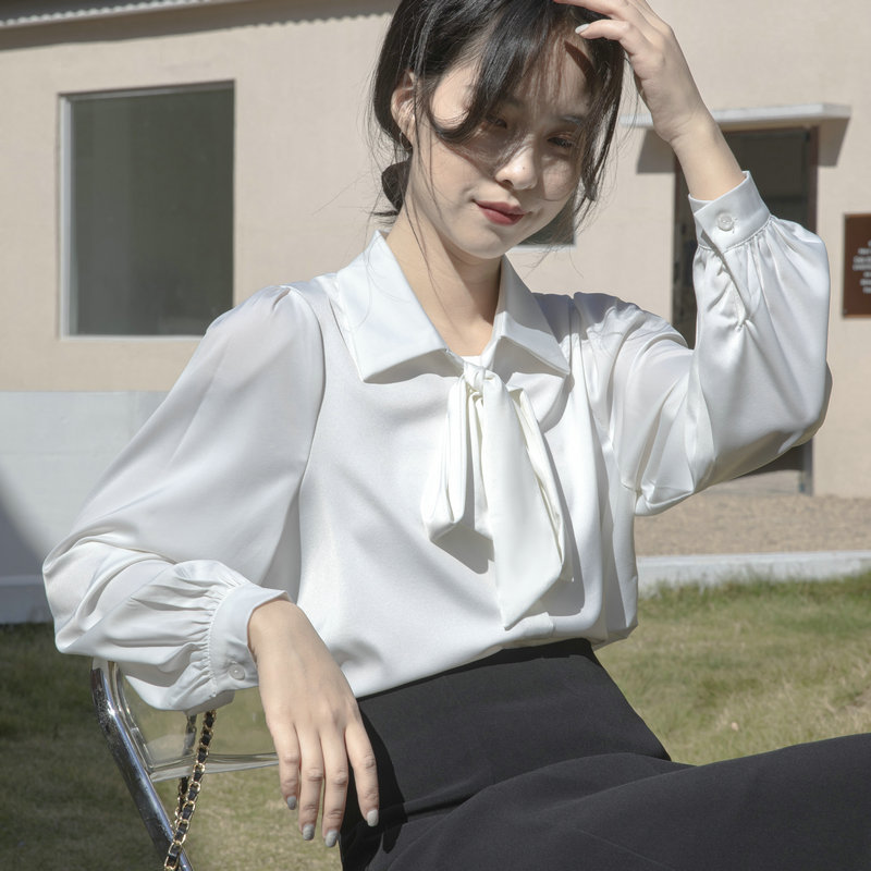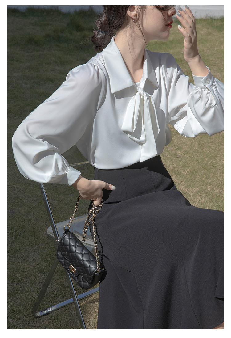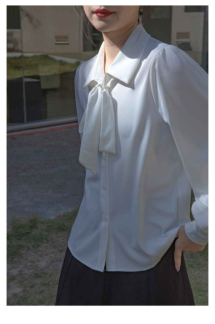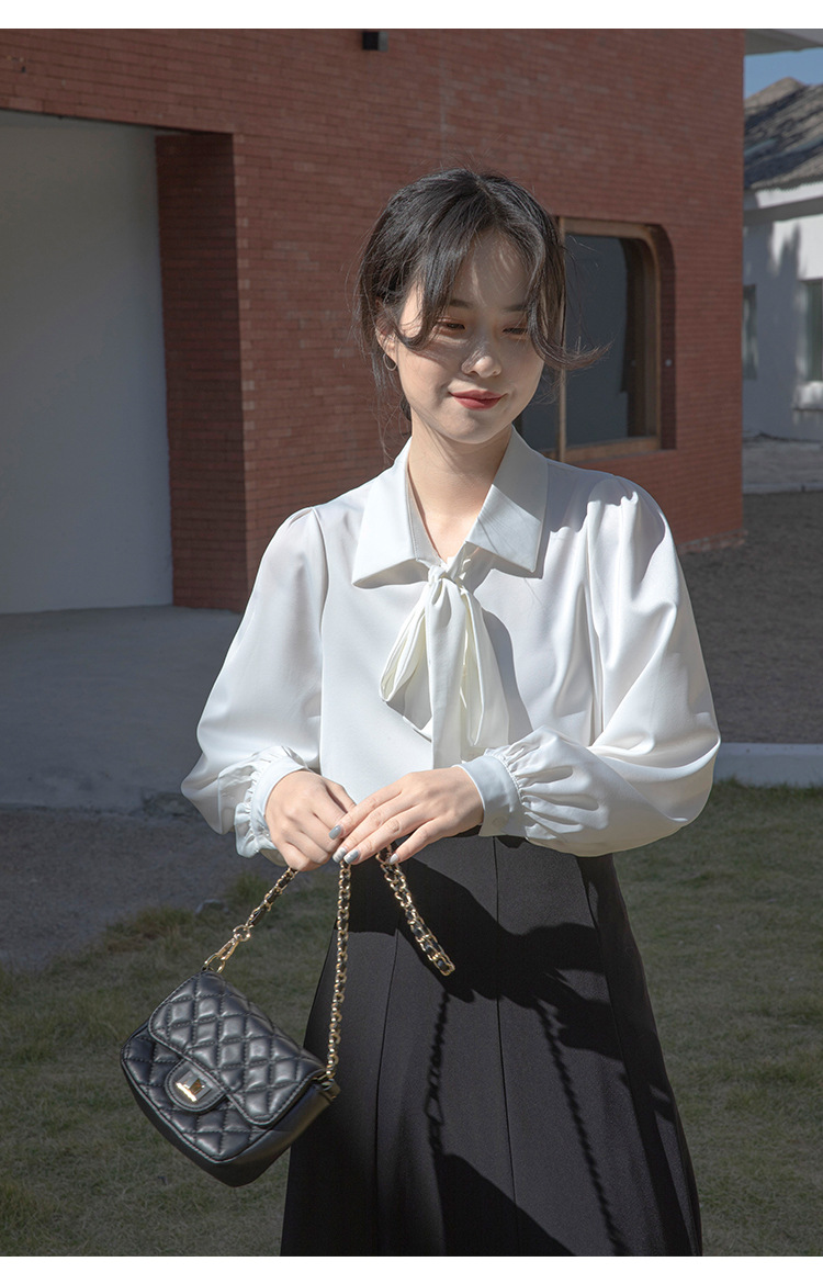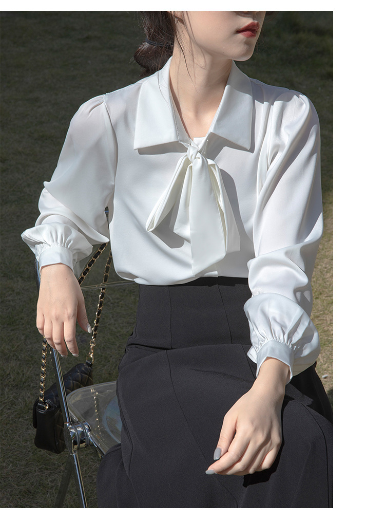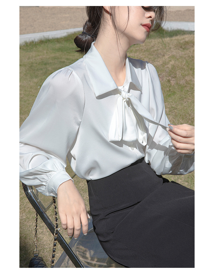 레이스 업 보우 화이트 셔츠 여성 가을 랜턴 슬리브 쉬폰 셔츠 디자인 전문 통근 정장 탑