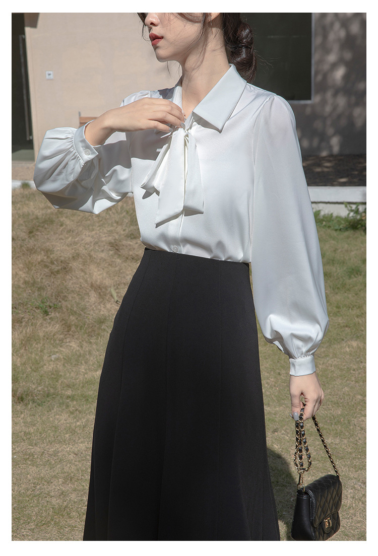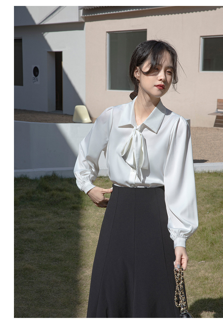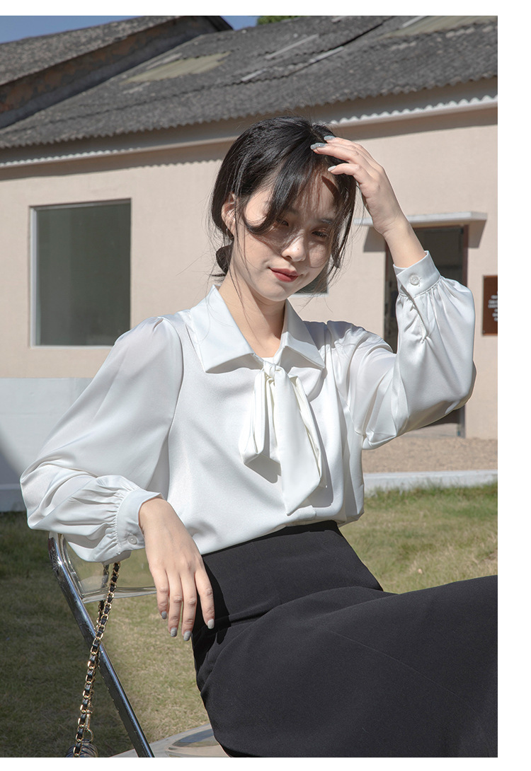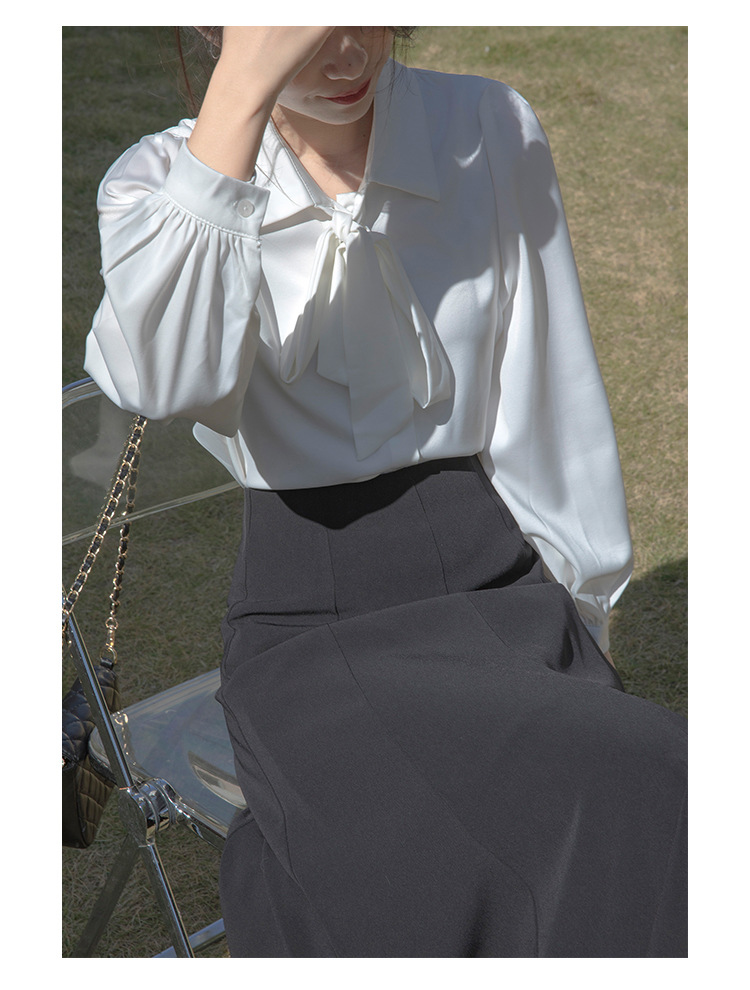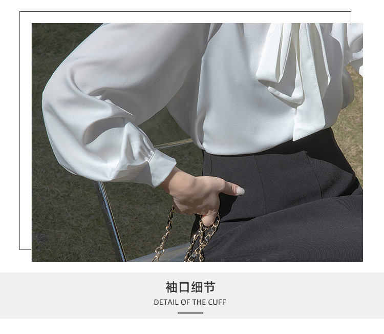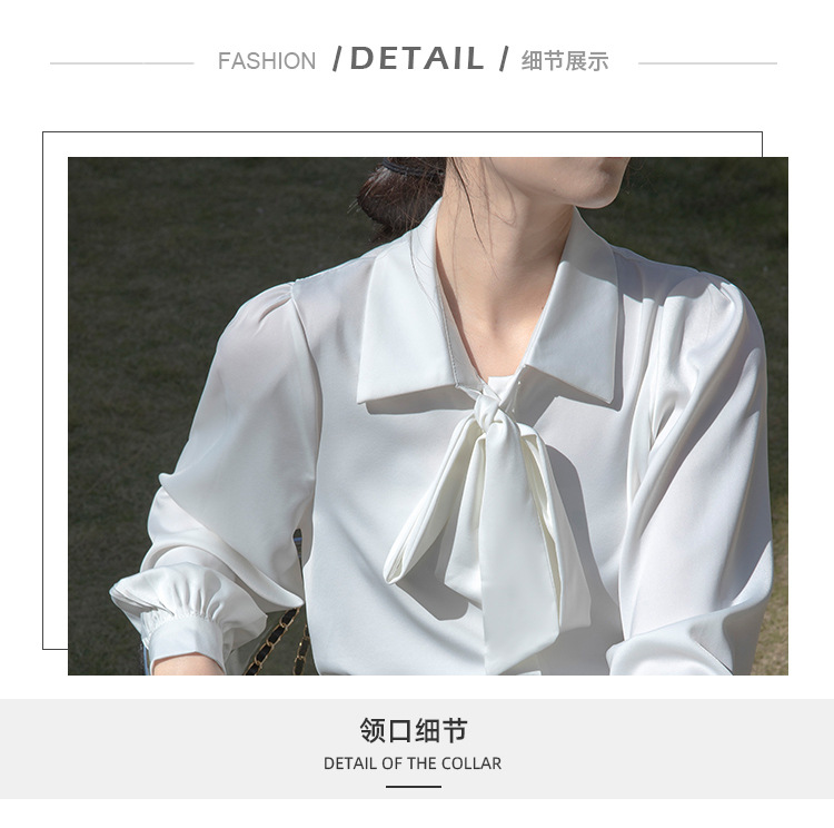 레이스 업 보우 화이트 셔츠 여성 가을 랜턴 슬리브 쉬폰 셔츠 디자인 전문 통근 정장 탑