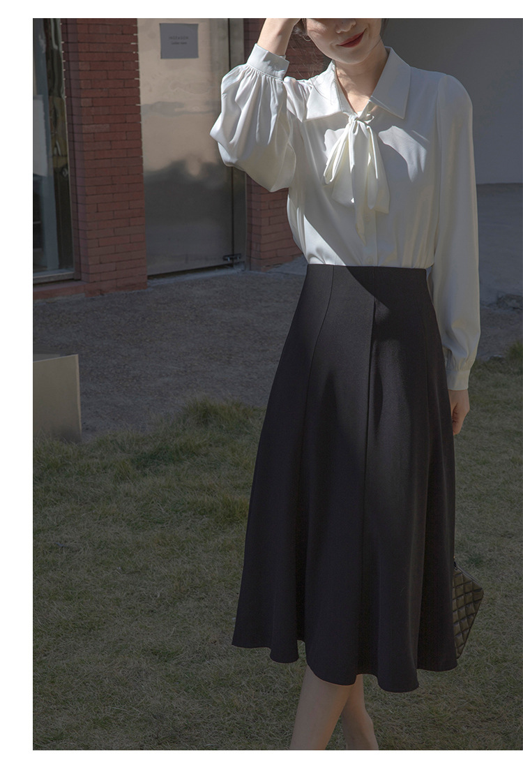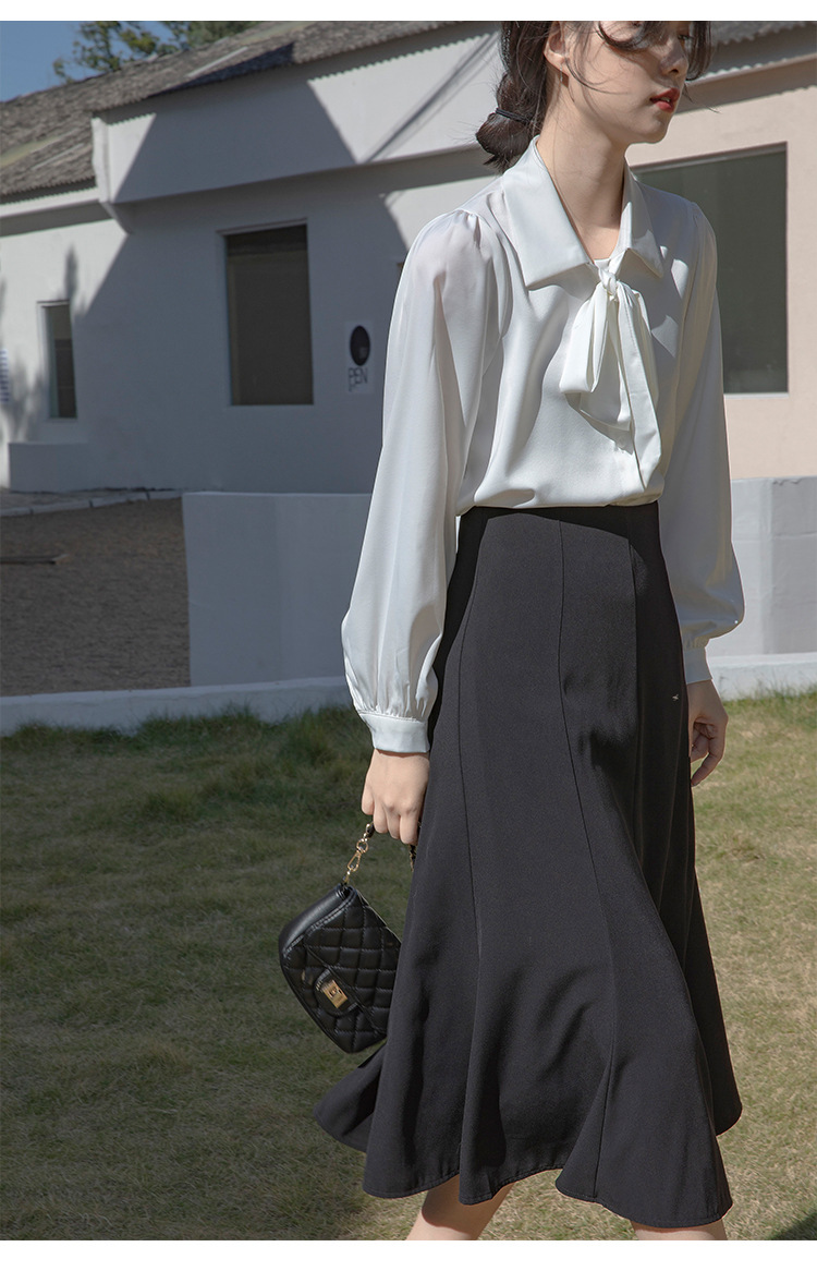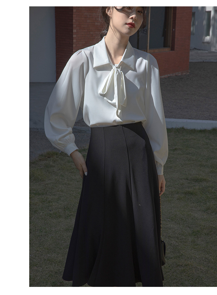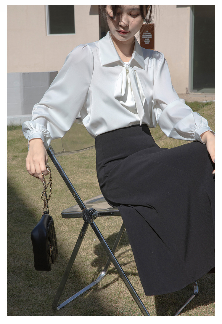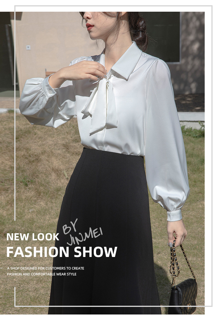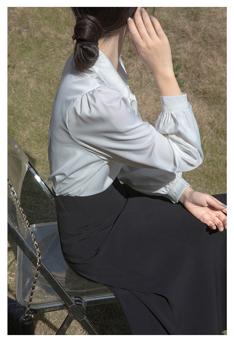 레이스 업 보우 화이트 셔츠 여성 가을 랜턴 슬리브 쉬폰 셔츠 디자인 전문 통근 정장 탑