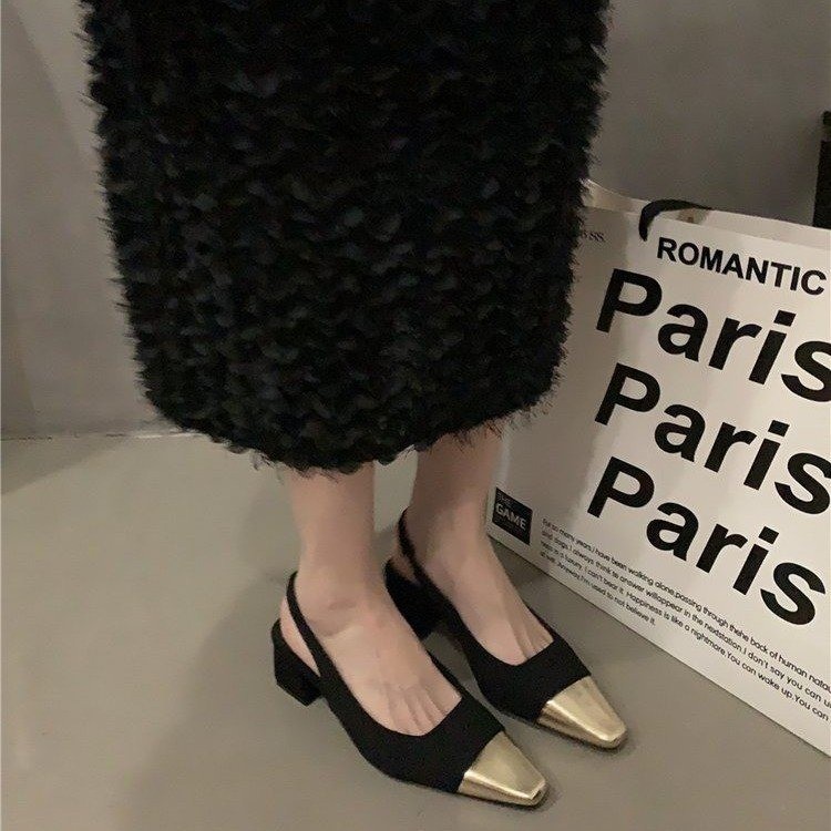 샤넬 스타일 Baotou 샌들 여성용 2023 봄과 여름 새로운 미드 힐 컬러 블록 싱글 레이어 슈즈 세련된 청키 힐 하이힐 신발스토어 가기