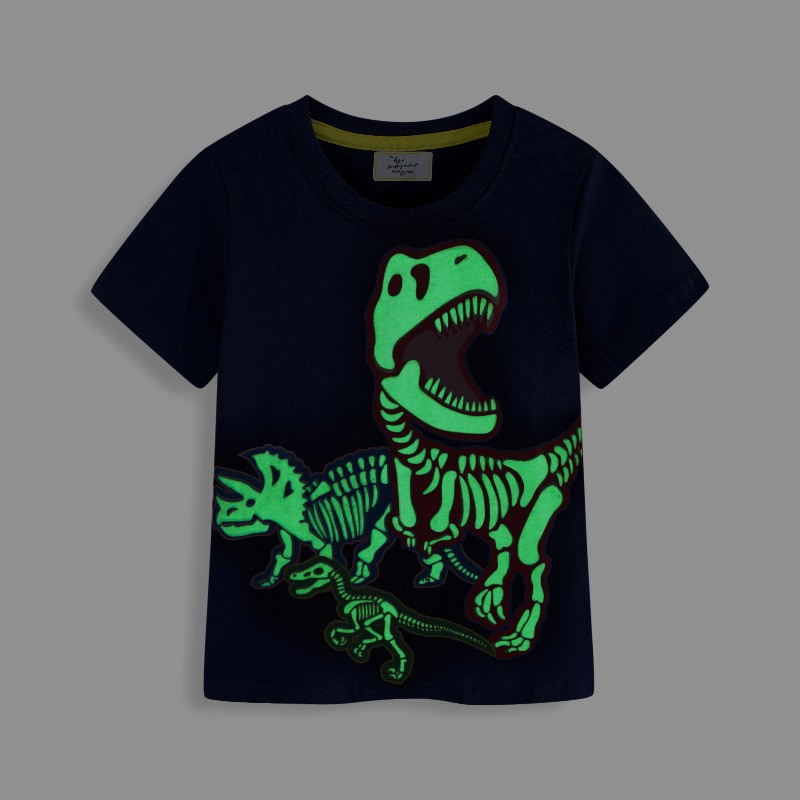 2025 여름 남아 야광 만화 프린트 반팔 라운드넥 티셔츠 공룡 상어 반팔 티셔츠 소형 어린이용 재고 직배송스토어 가기