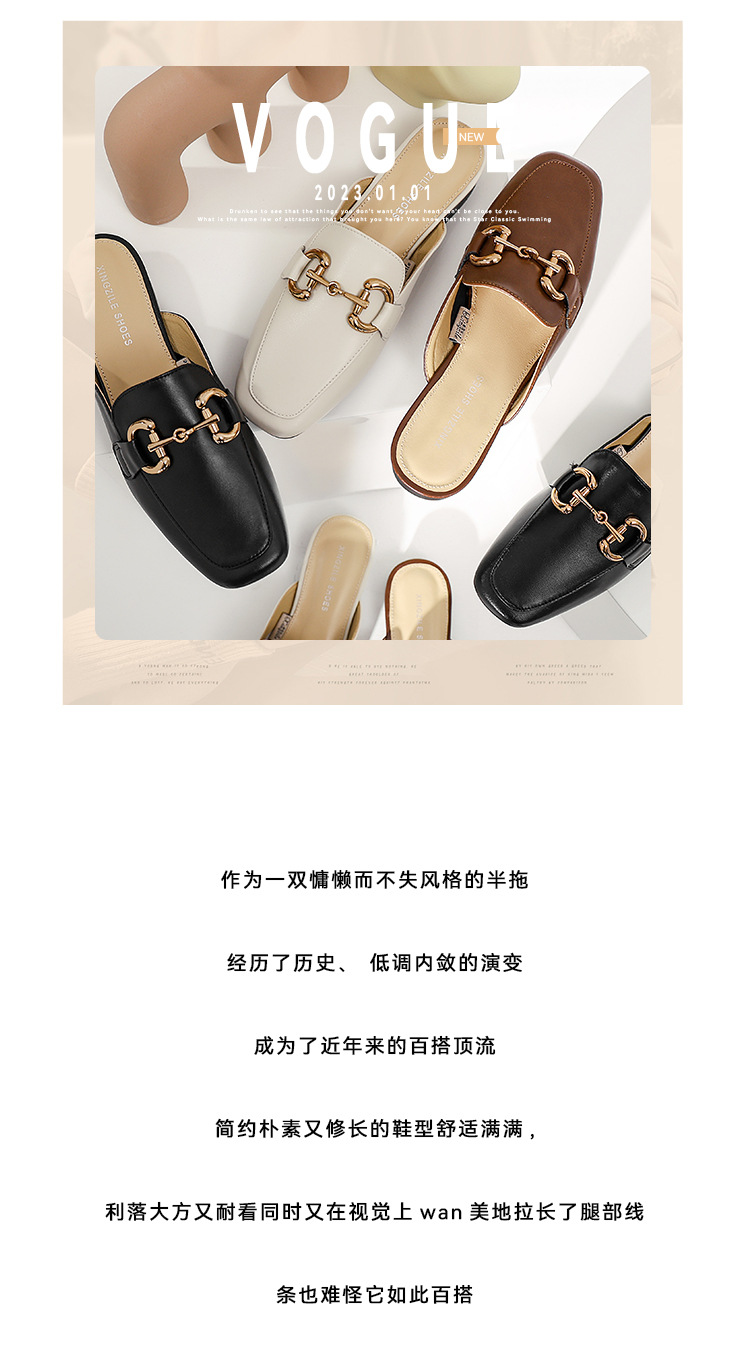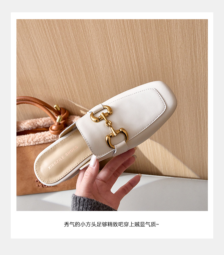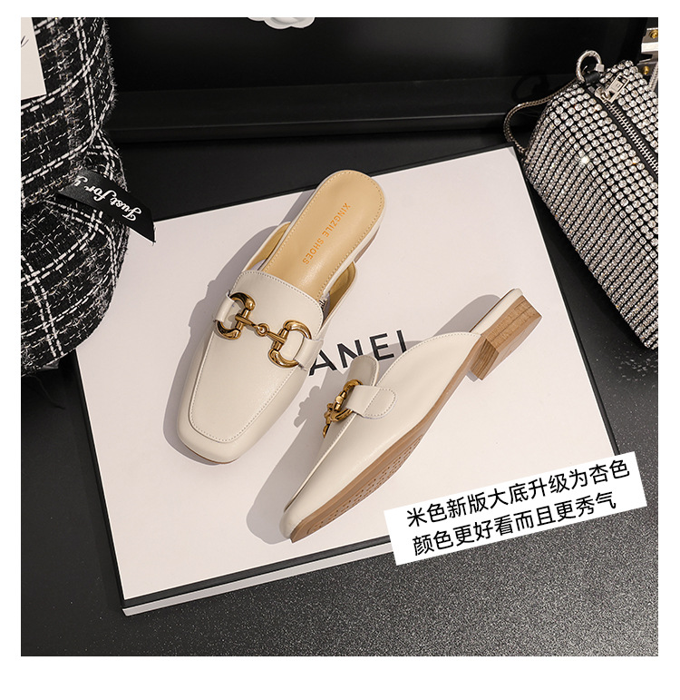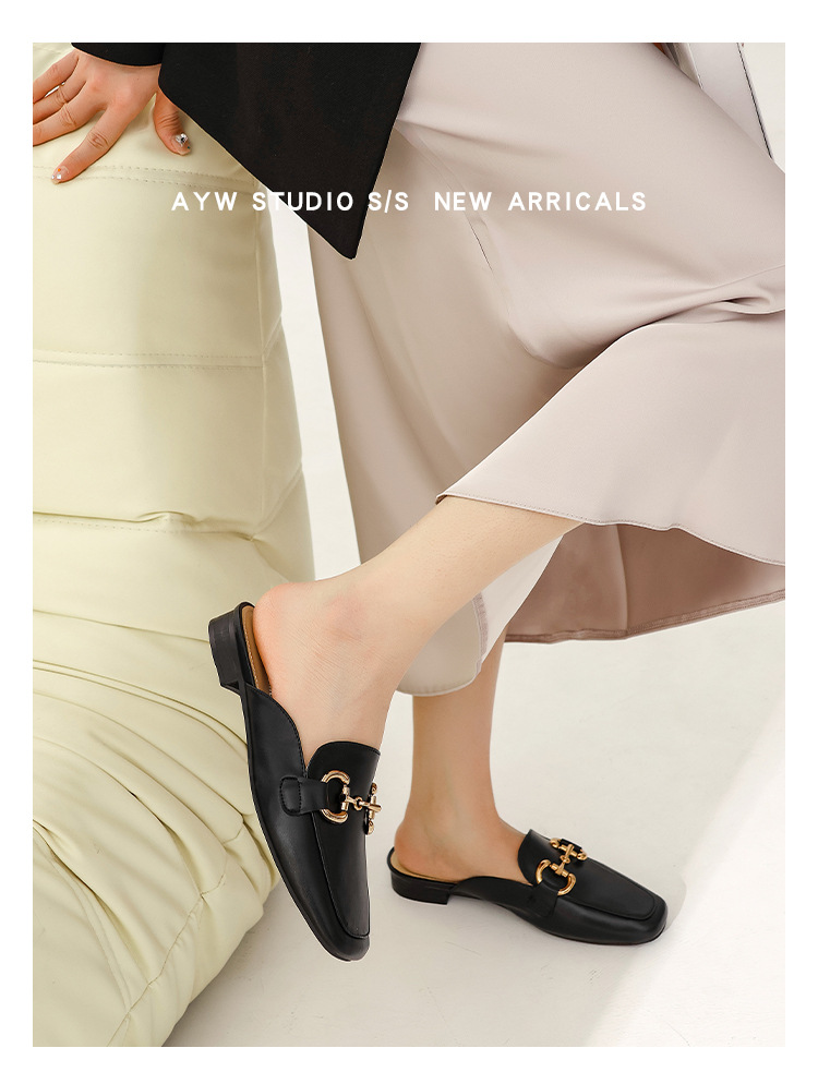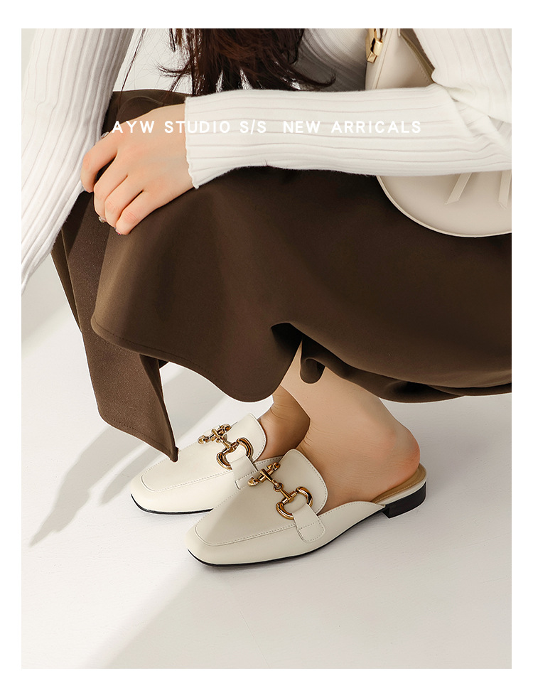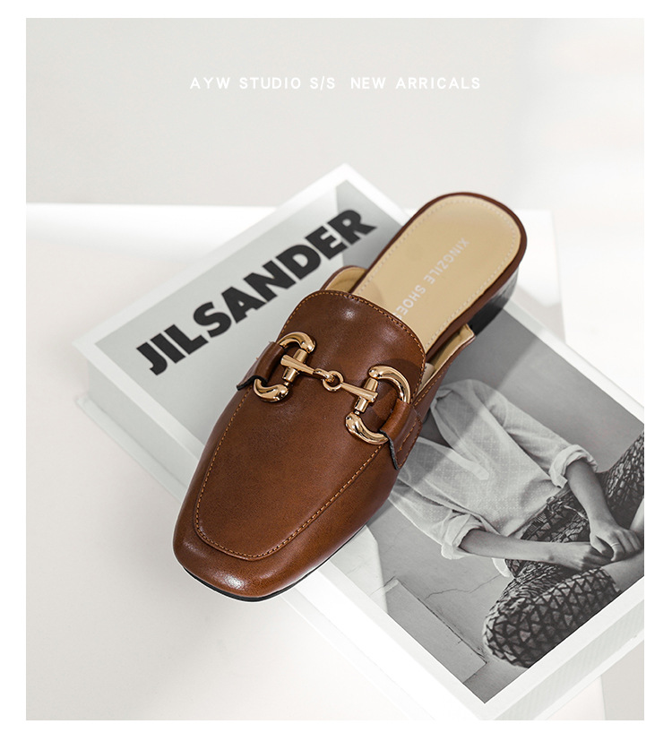 정품 가죽 커버 발가락 하프 슬리퍼 여성용 겉옷 2023 발 뒤꿈치가없는 말 버클 샌들과 새로운 스타일 샌들 게으른 신발 플랫 뮬 신발스토어 가기