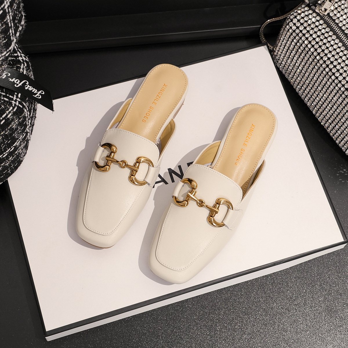 정품 가죽 커버 발가락 하프 슬리퍼 여성용 겉옷 2023 발 뒤꿈치가없는 말 버클 샌들과 새로운 스타일 샌들 게으른 신발 플랫 뮬 신발