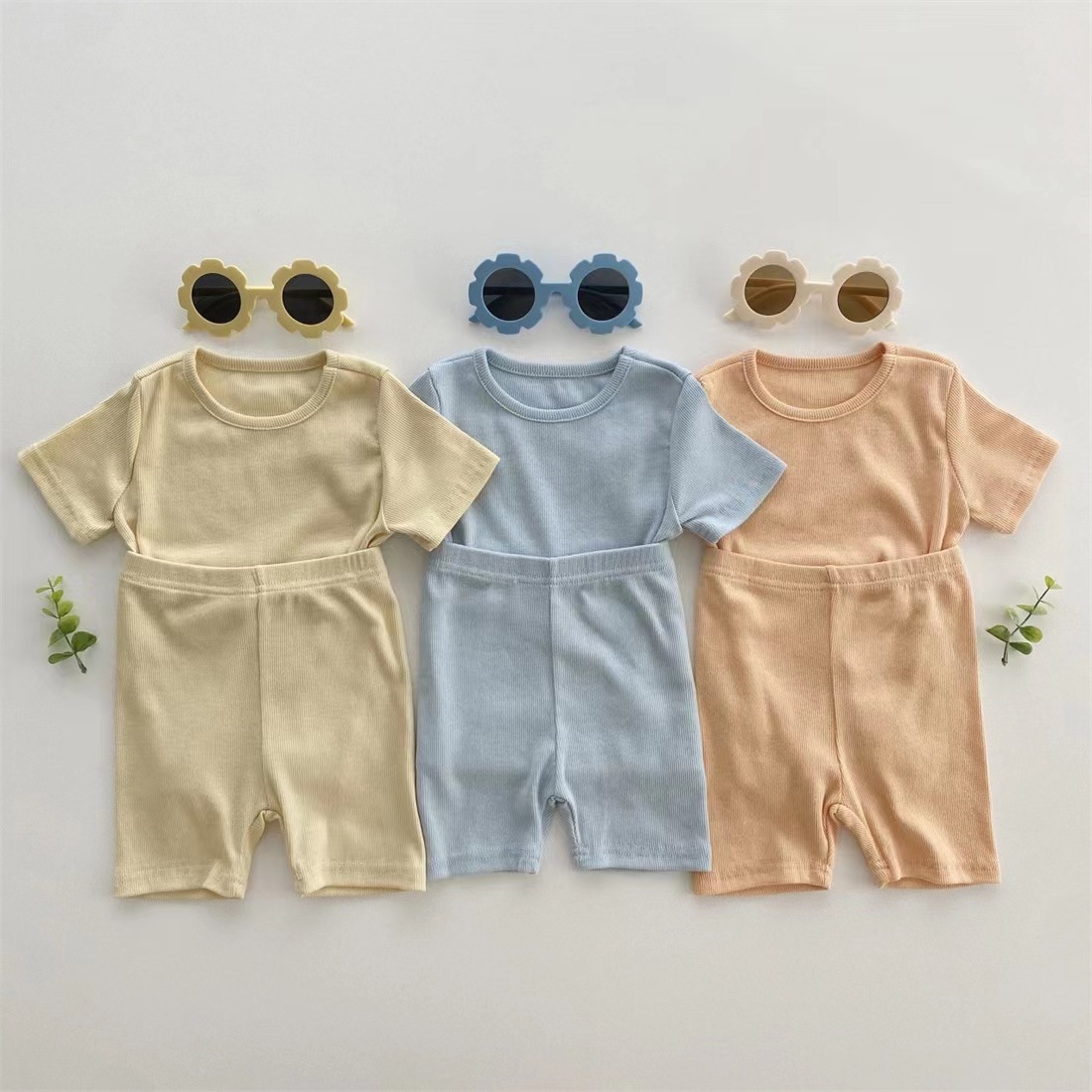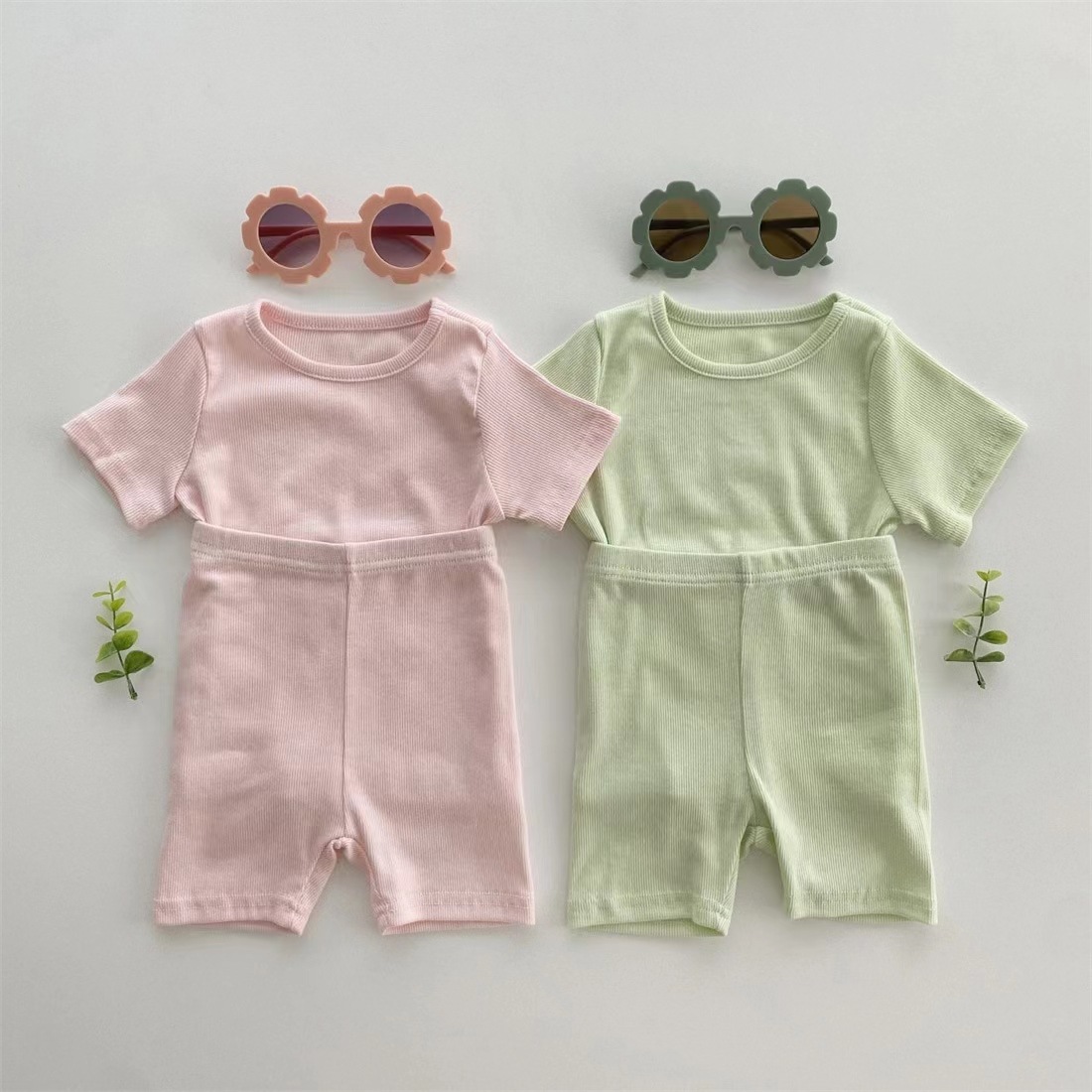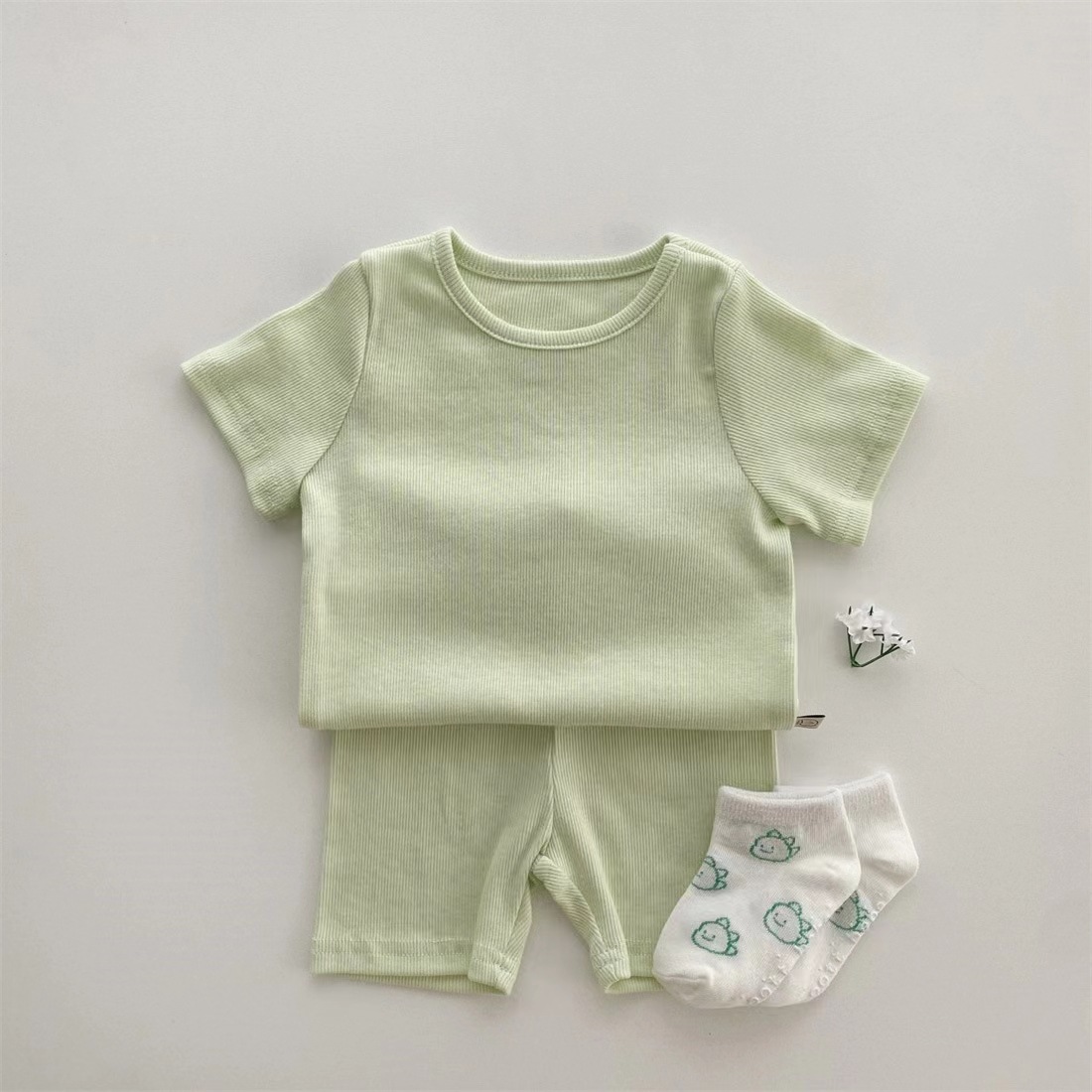 한국 아기 면 반팔 티셔츠 반바지 부드러운 투피스 아기 가정복 세트 단색 구덩이 잠옷스토어 가기