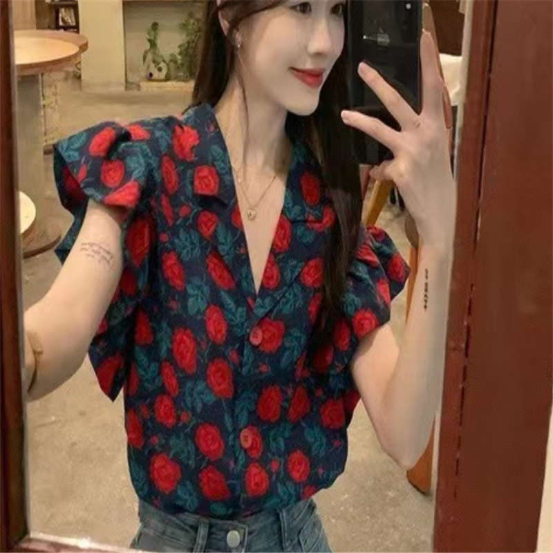 2023 여름 정장 칼라 홍콩 스타일 꽃 셔츠 여성 복고풍 느슨한 기질 프릴 작은 플라잉 슬리브 탑 여름 문학과 예술스토어 가기