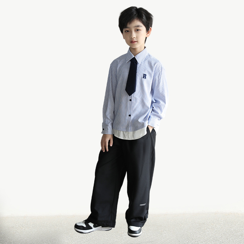봄 새로운 세트 세트 소년 잘 생긴 세트 재킷 잘 생긴 스트라이프 긴 소매 셔츠 느슨한 캐주얼 바지