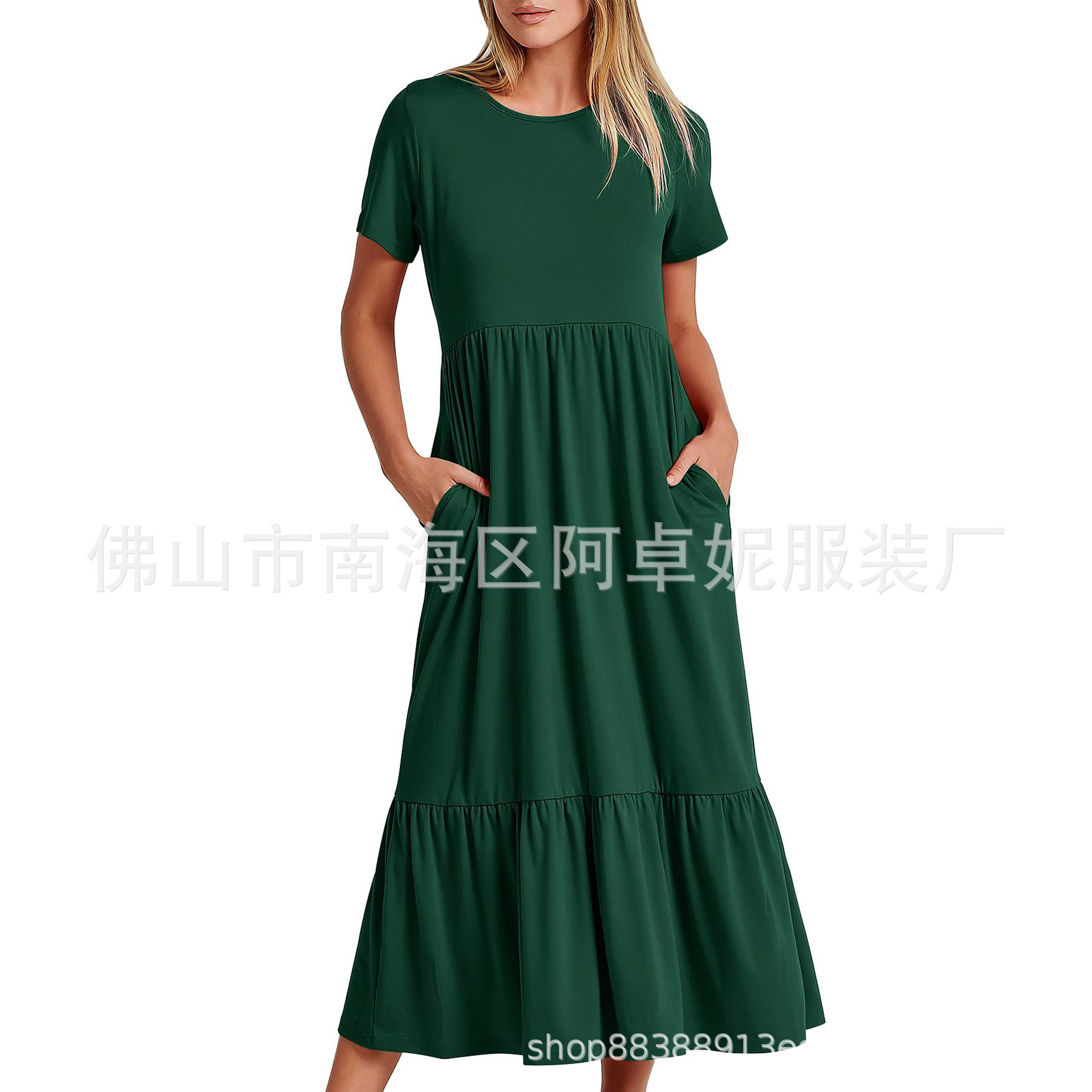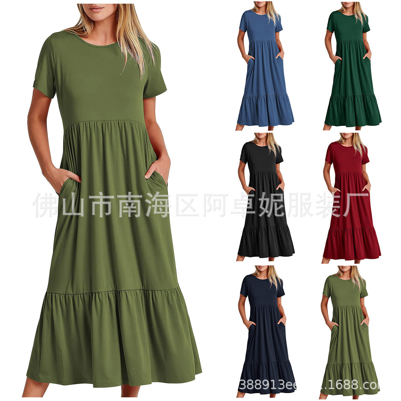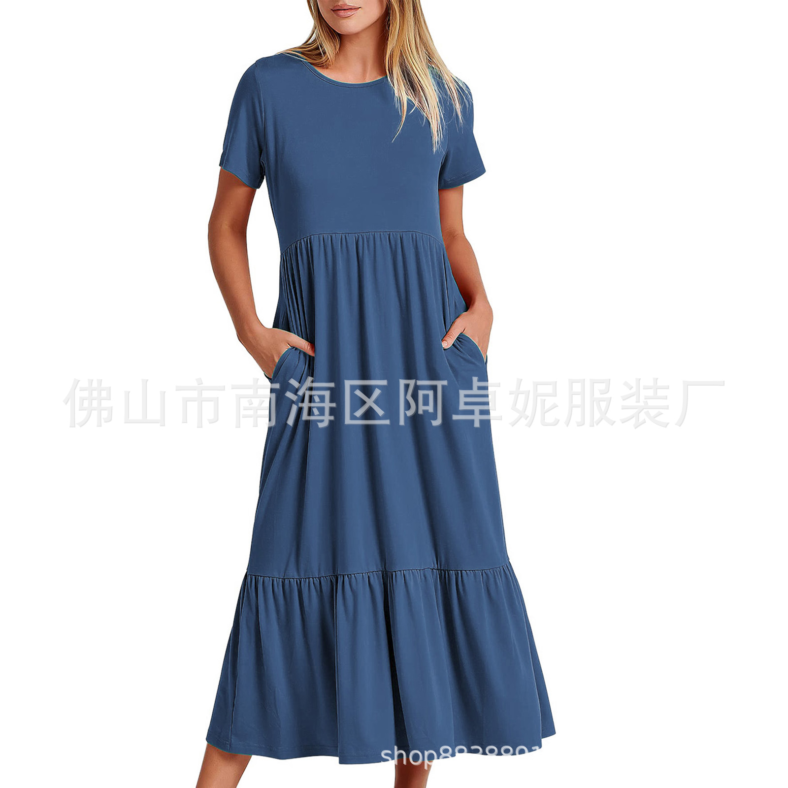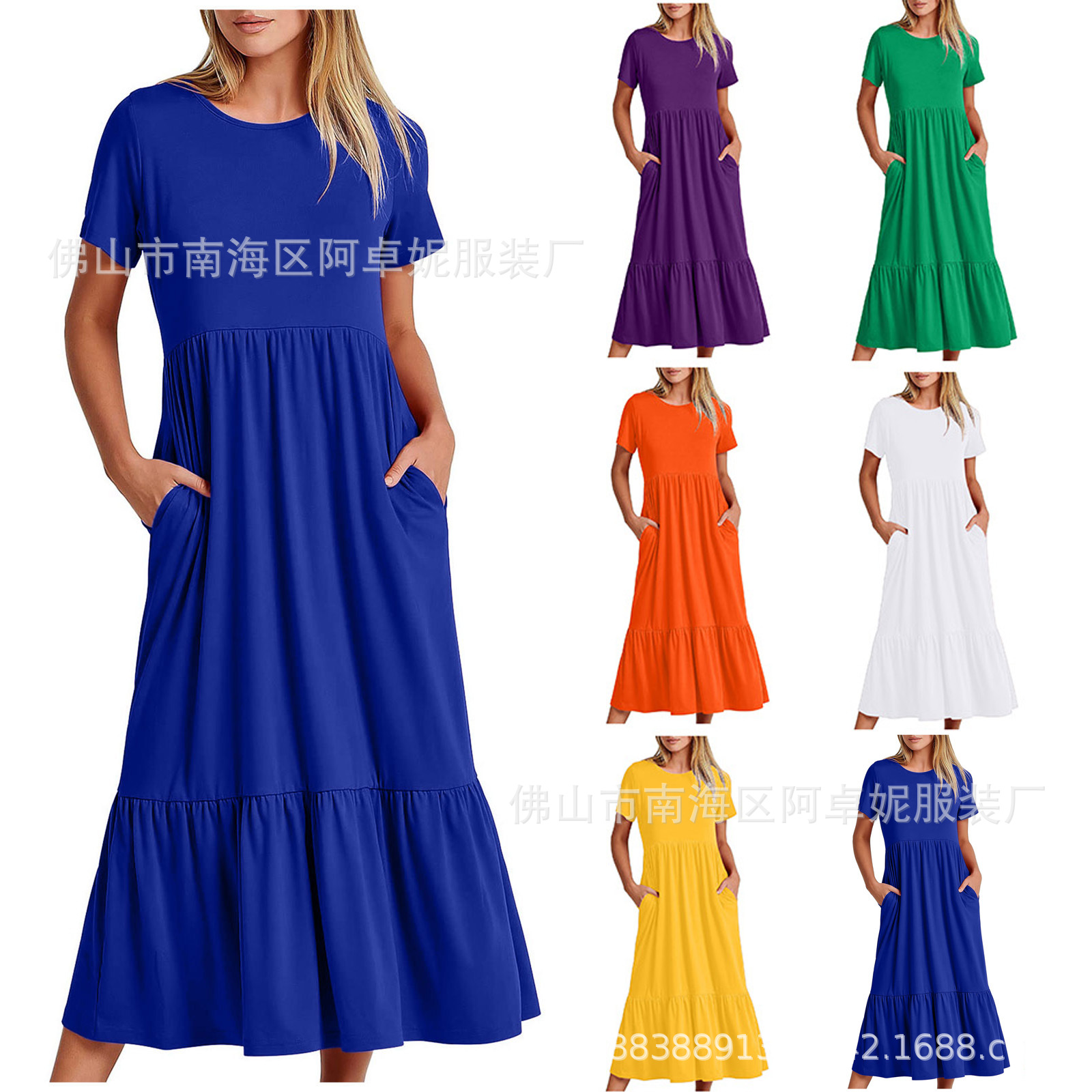 Spot 2025 새로운 여성 의류 아마존 국경 핫 스타일 라운드 넥 스목 솔리드 컬러 스윙 드레스