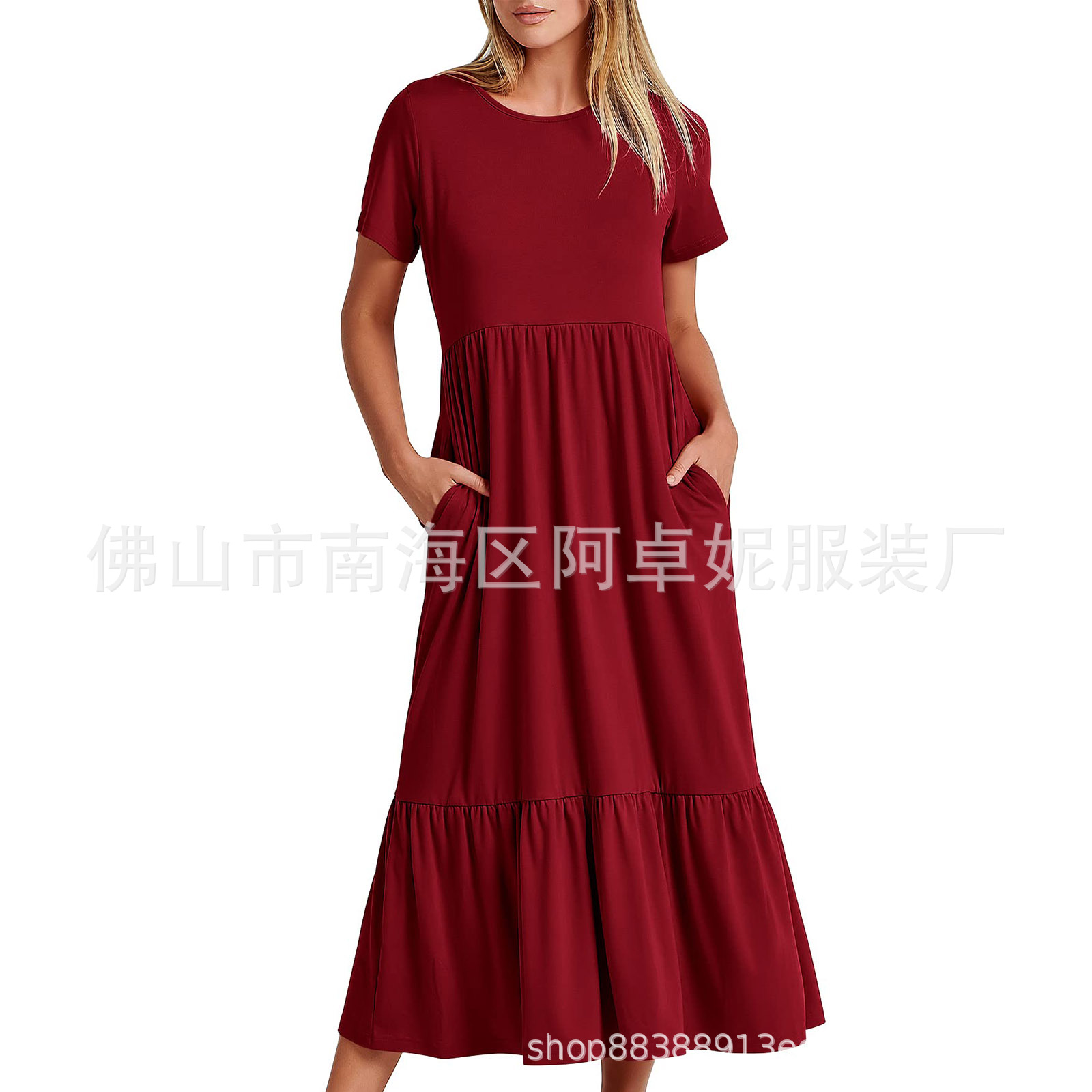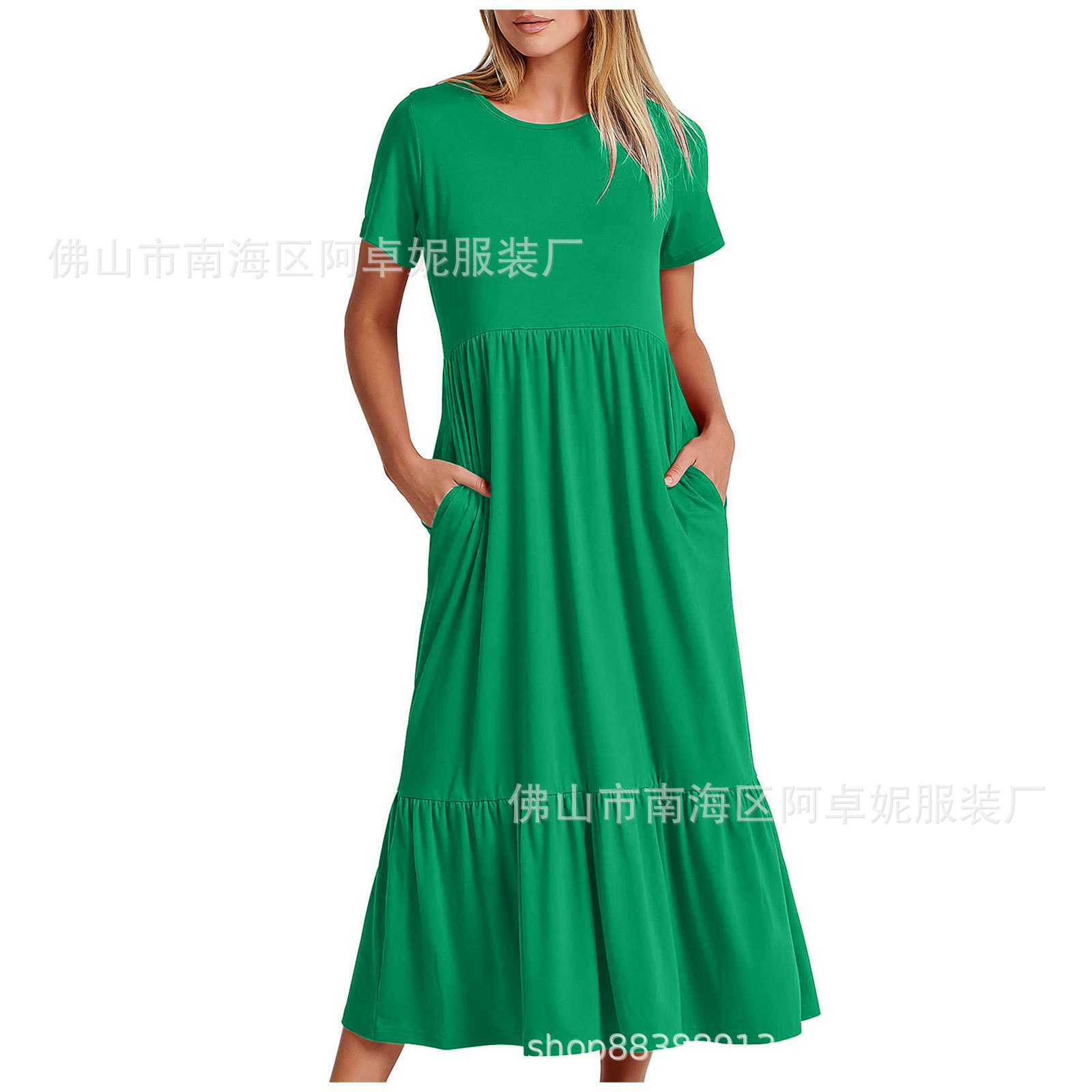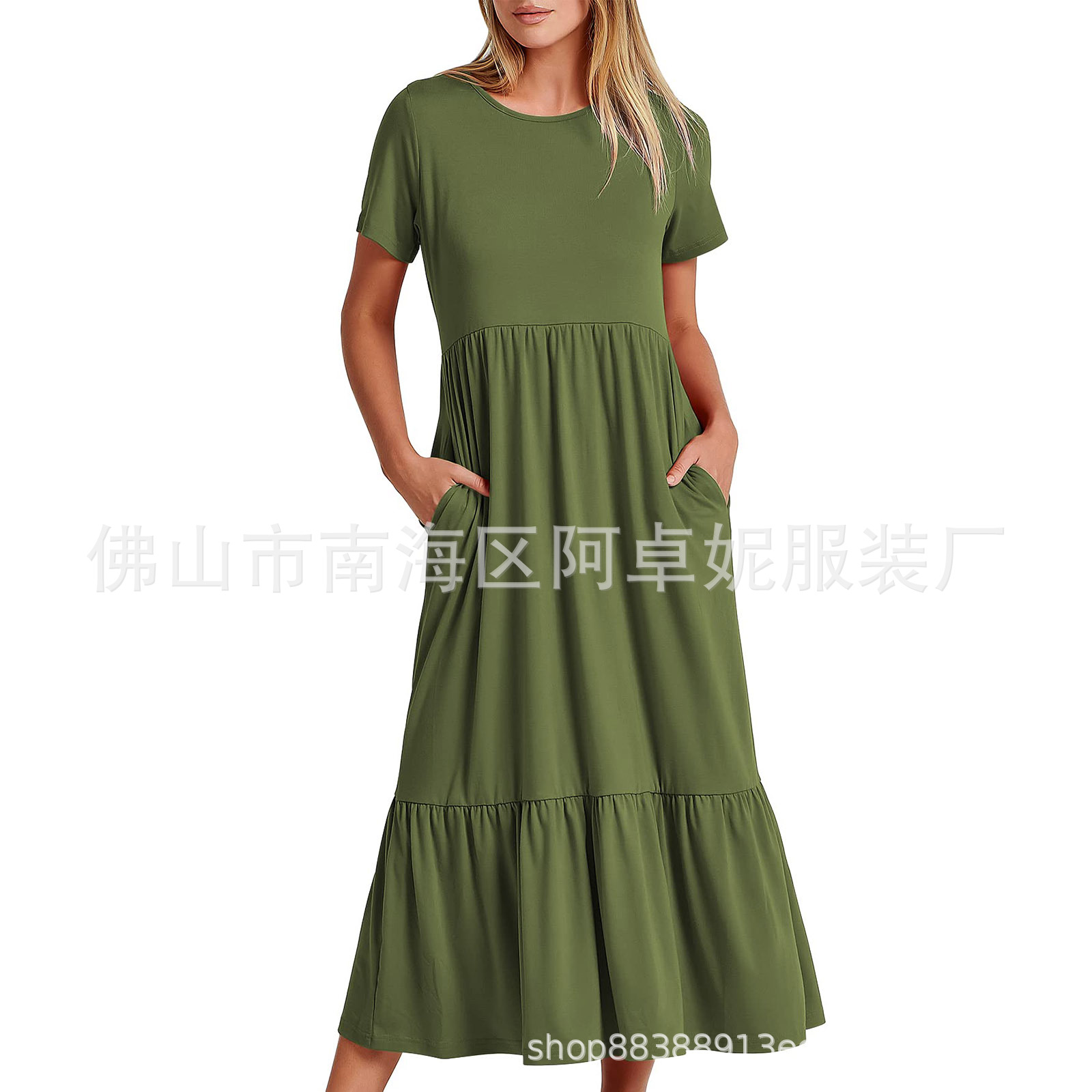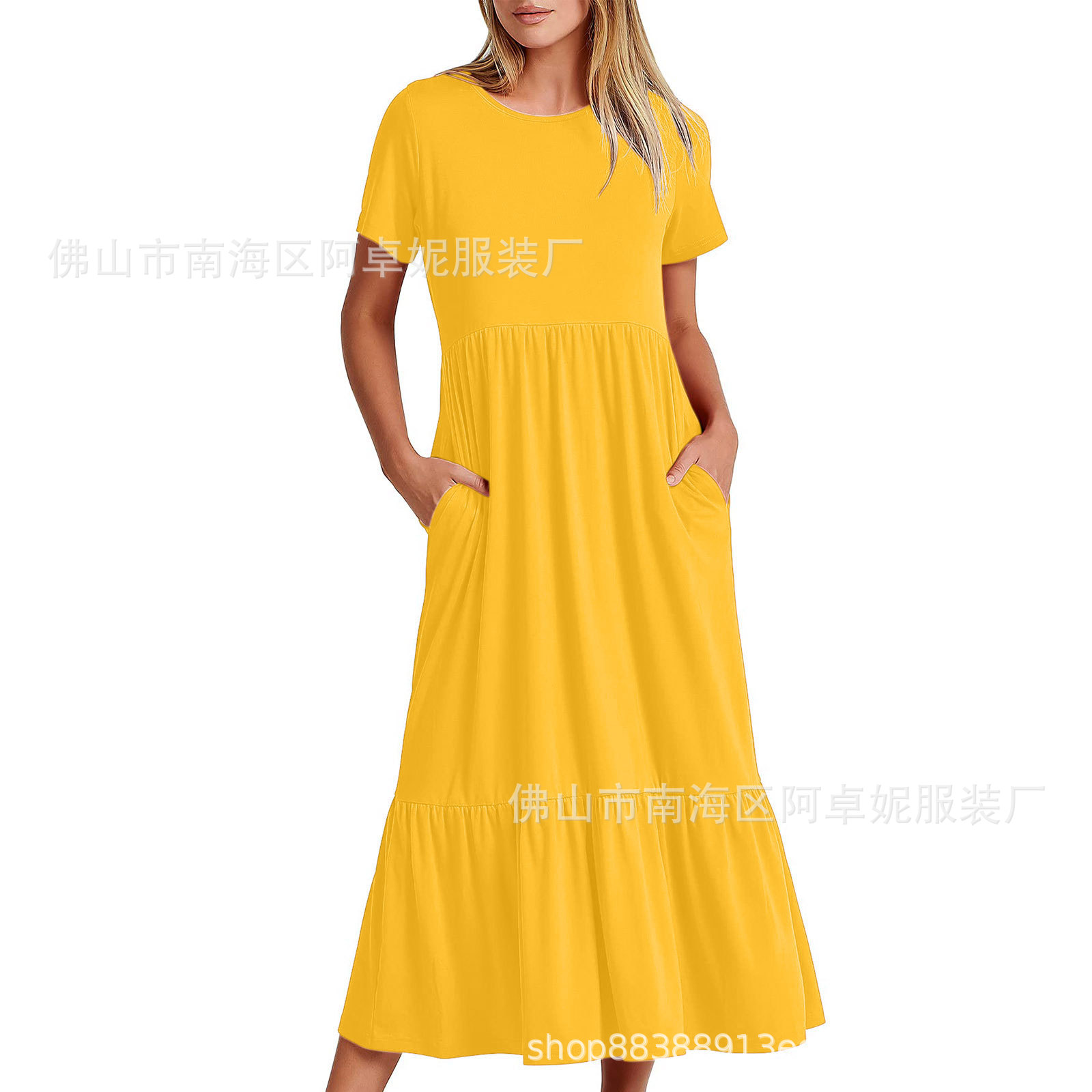 Spot 2025 새로운 여성 의류 아마존 국경 핫 스타일 라운드 넥 스목 솔리드 컬러 스윙 드레스