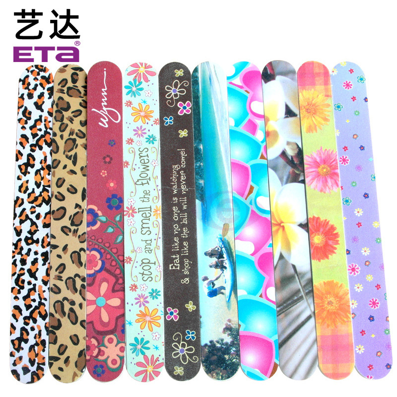 塑料夹芯胶板EVA砂纸锉,两面的美容砂纸具有不同的锋利度,塑料胶板及EVA海绵双面胶的结合使艺达指甲锉变得柔韧,轻松掌握指甲修磨的形状及圆润度。印花砂纸锉(彩色图案砂纸锉),指甲锉上精美的彩色图案更加符合女性的爱美之心,价格便宜,促销赠品首选。本品颜色及图案款式多样,使用方便,既实用美观大方且质优耐用,适用于美容院、美甲店、个人家庭、外出旅行的指甲修护,印上企业Logo亦可配以精美包装作为促销礼品和各种节日馈赠。