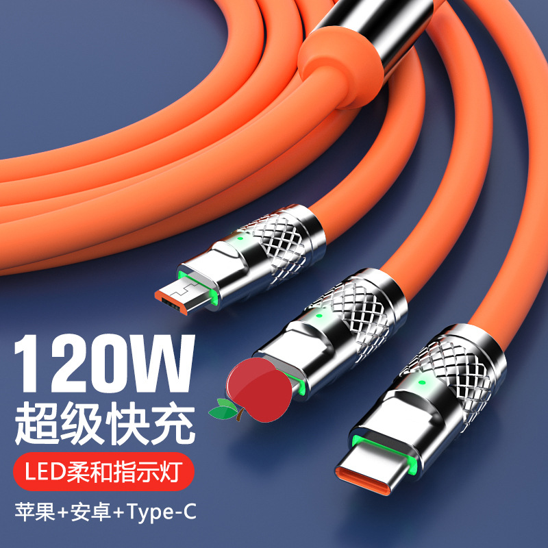 120W 기계 승객 라인 1 대 3 충전 라인 액체 부드러운 고무 휴대 전화 초고속 충전 아연 합금 3 대 1 데이터 라인