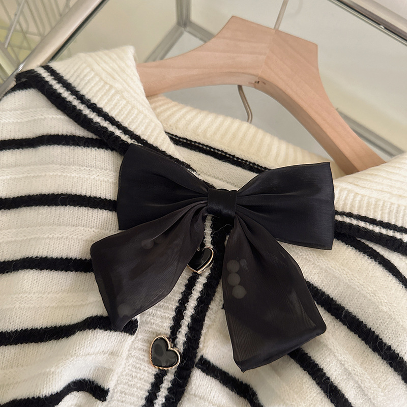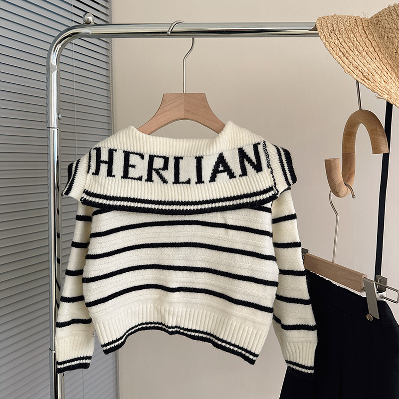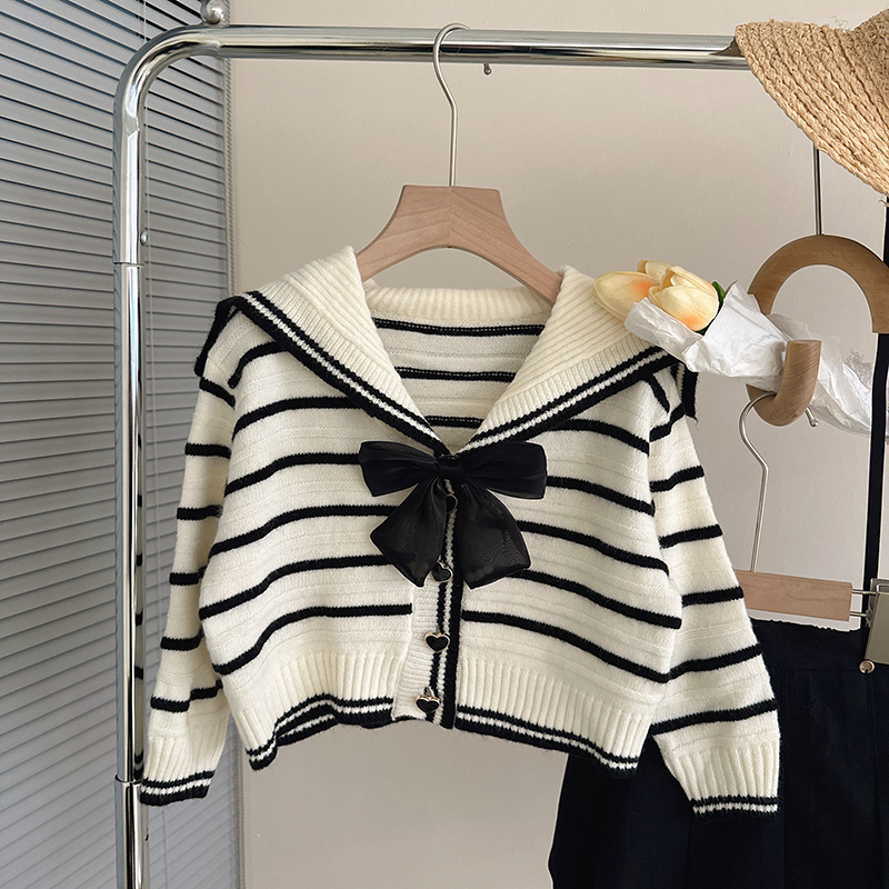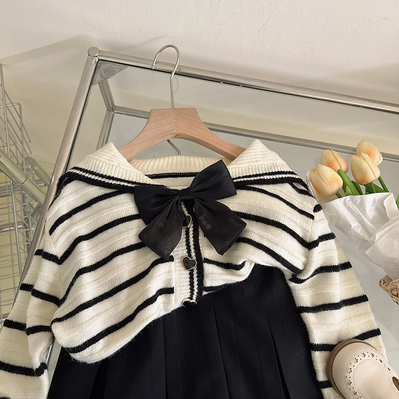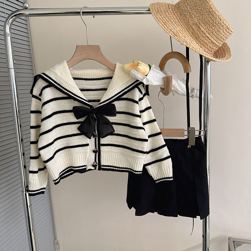 한국 아동 의류 2023 봄 새로운 대학 스타일 네이비 칼라 스트라이프 스웨터 소녀 주름 치마 세트 패션스토어 가기