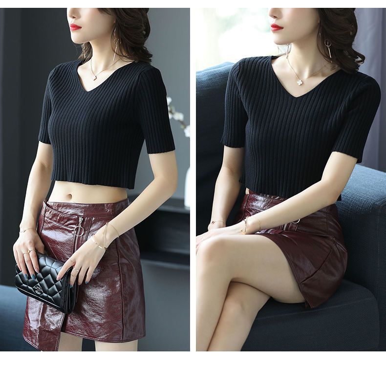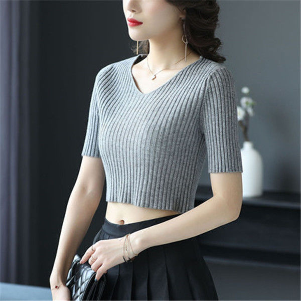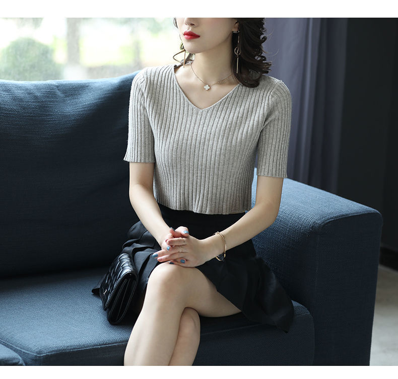 여름 2023 신상품 올 매치 브이넥 니트 반팔 얇은 베이스 셔츠 여성용 짧은 슬림핏 하이 웨이스트 스몰 탑