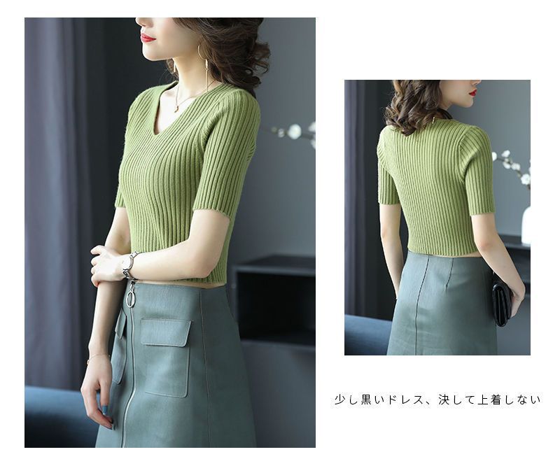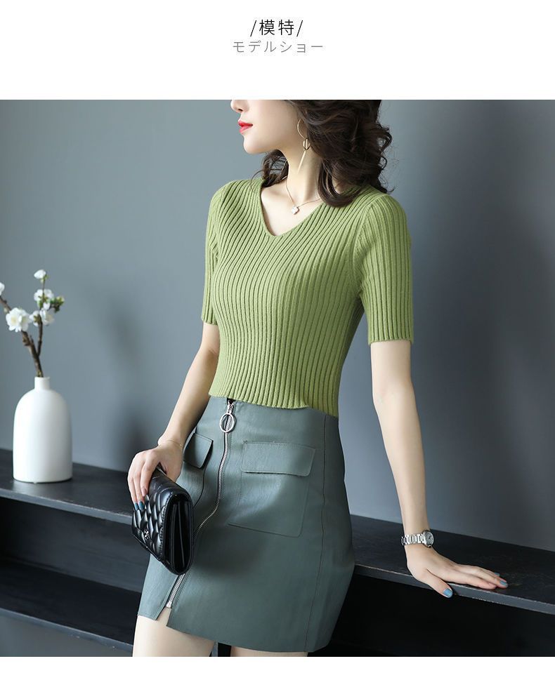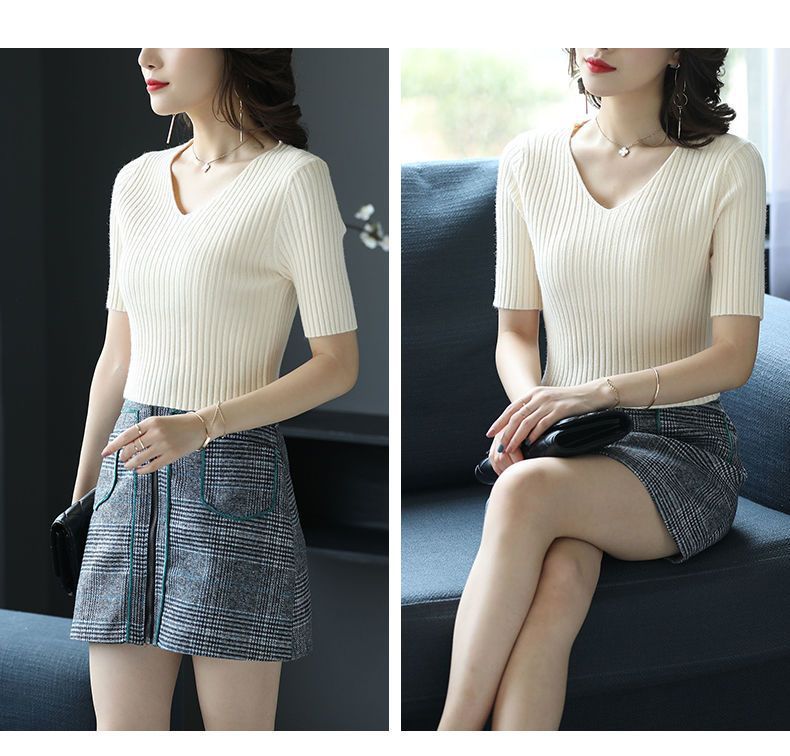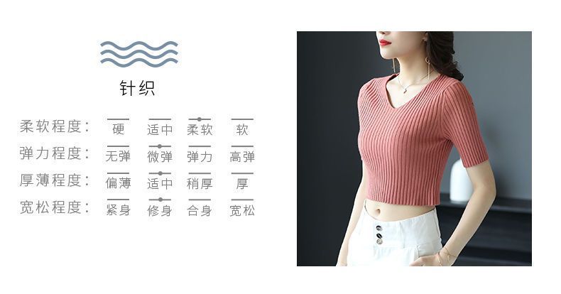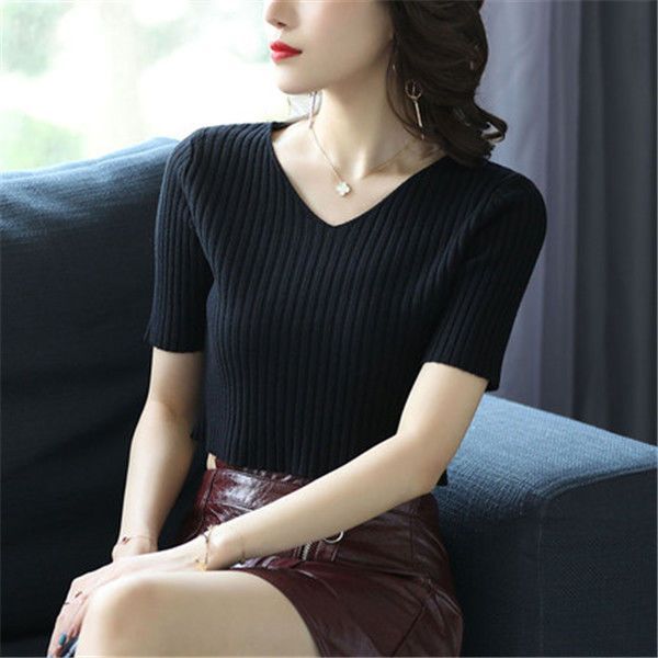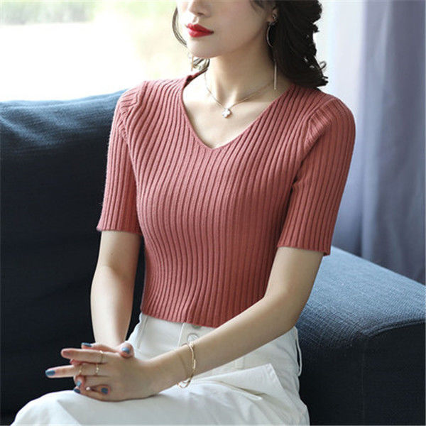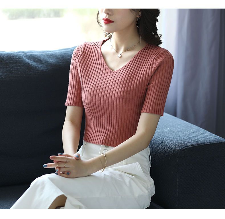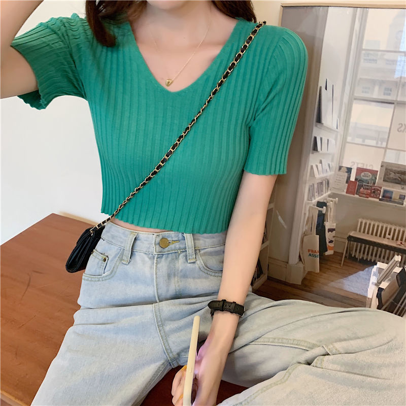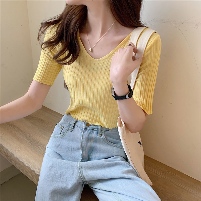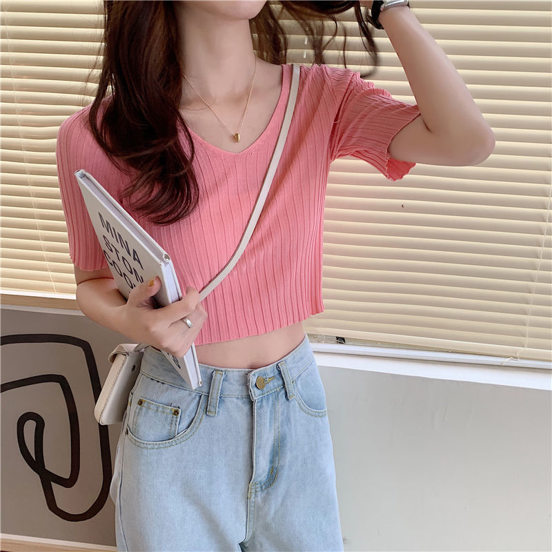 여름 2023 신상품 올 매치 브이넥 니트 반팔 얇은 베이스 셔츠 여성용 짧은 슬림핏 하이 웨이스트 스몰 탑스토어 가기