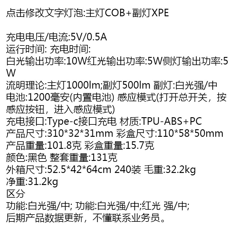 功能:白光强/中; 功能:白光强/中;红光 强/中; 后期产品更新,数据问客人,不及时在网上更新。