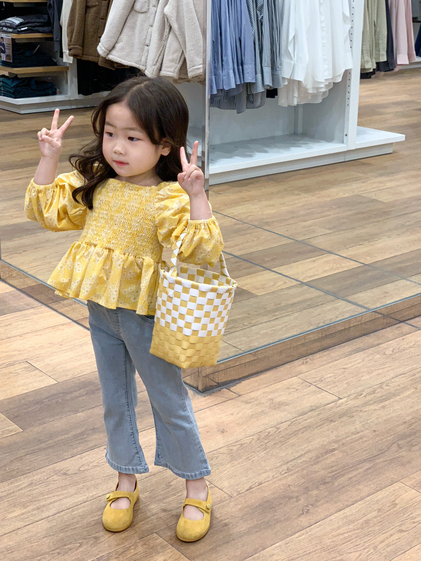 봄 작은 신선한 노란색 꽃 버블 슬리브 인형 셔츠 + 마이크로 풀 청바지의 여자 한국어 버전 세트 별도 촬영
