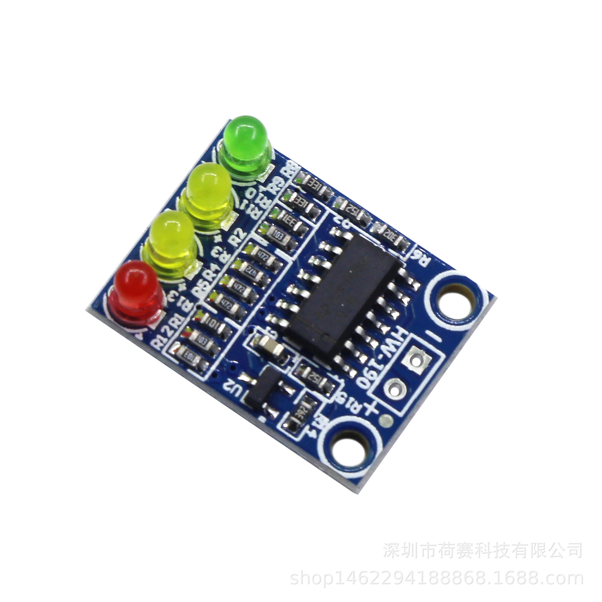 2、板载4位电量指示LED灯,分3种颜色显示,红、黄、黄、绿分别代表20%、50%、80%、100%的电量
