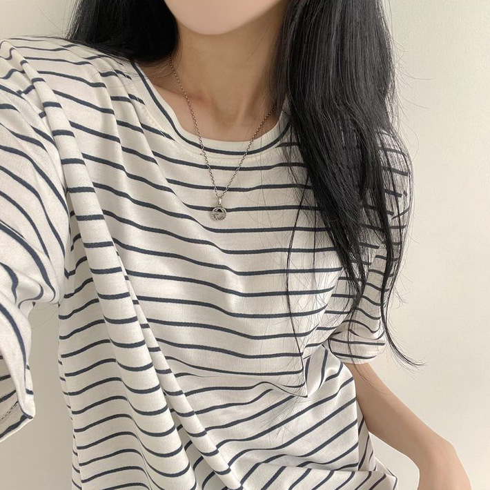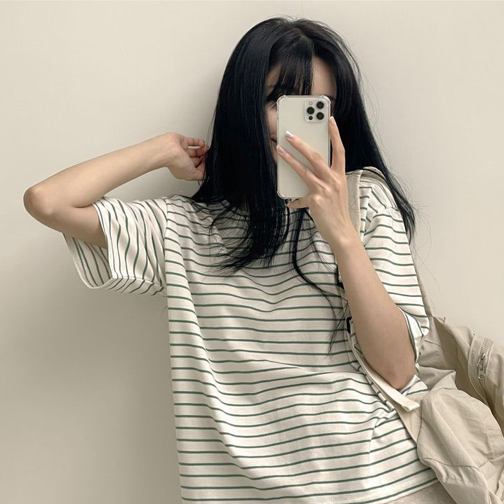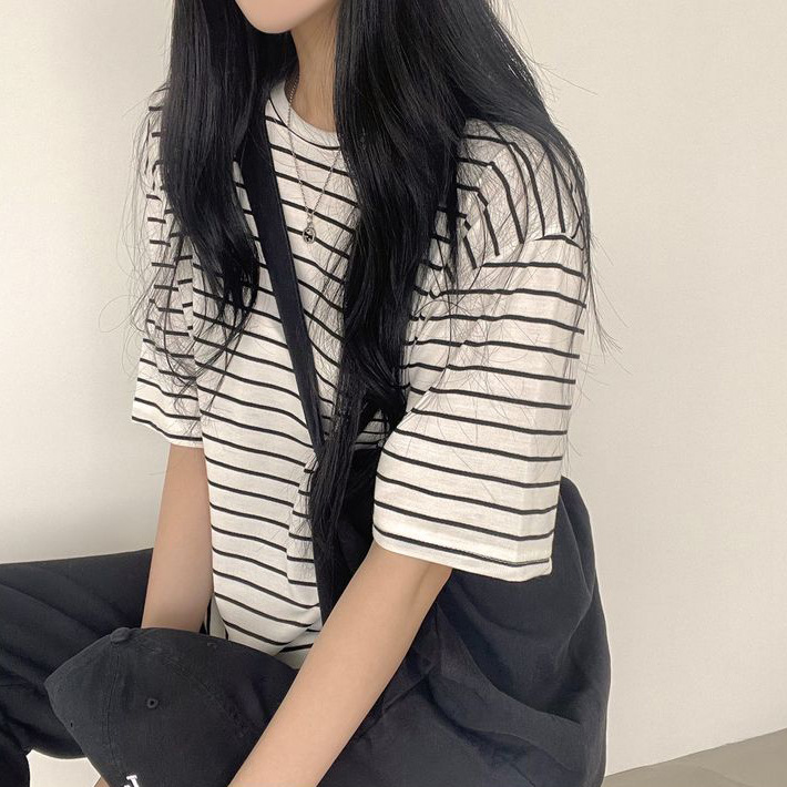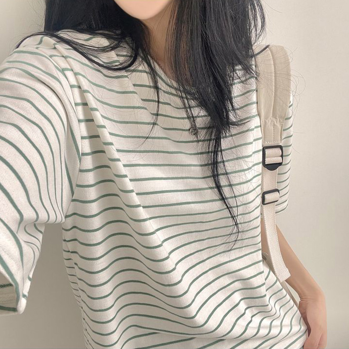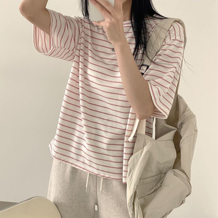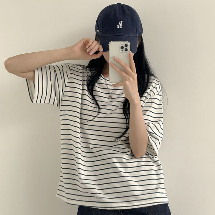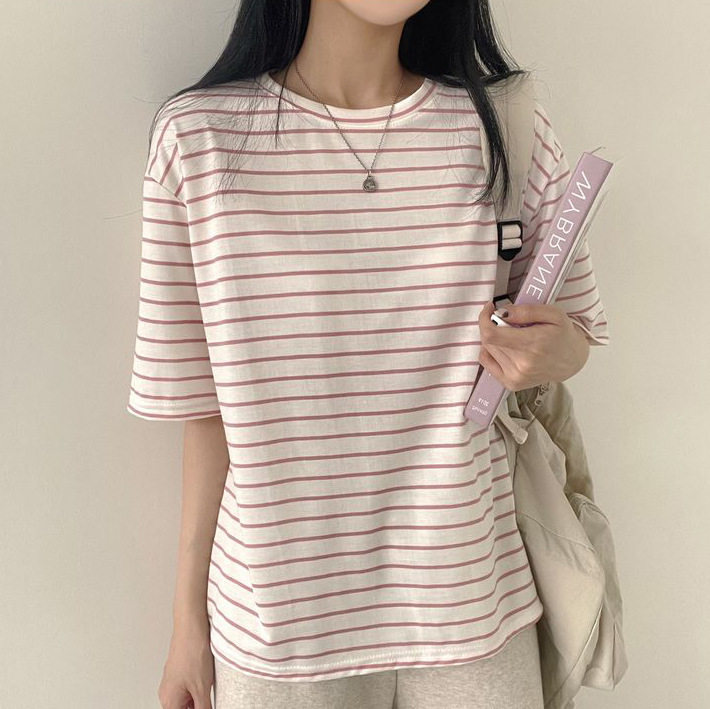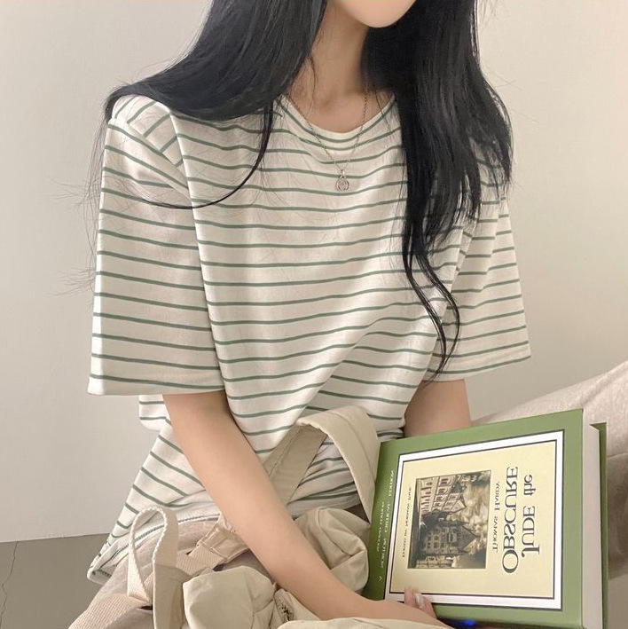 100 면 스트라이프 반팔 티셔츠 여자 여름 학생 한국 느슨한 라운드 넥 모든 매치 탑 유행 여성복스토어 가기