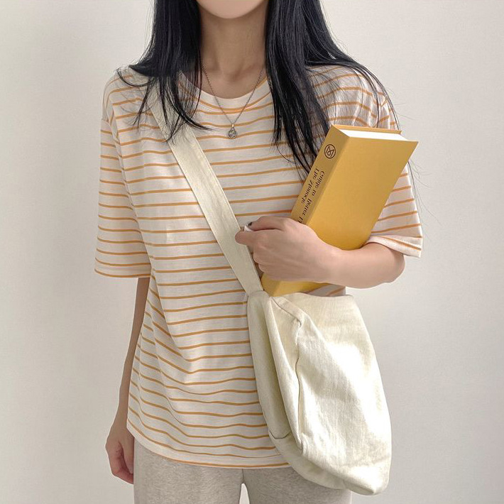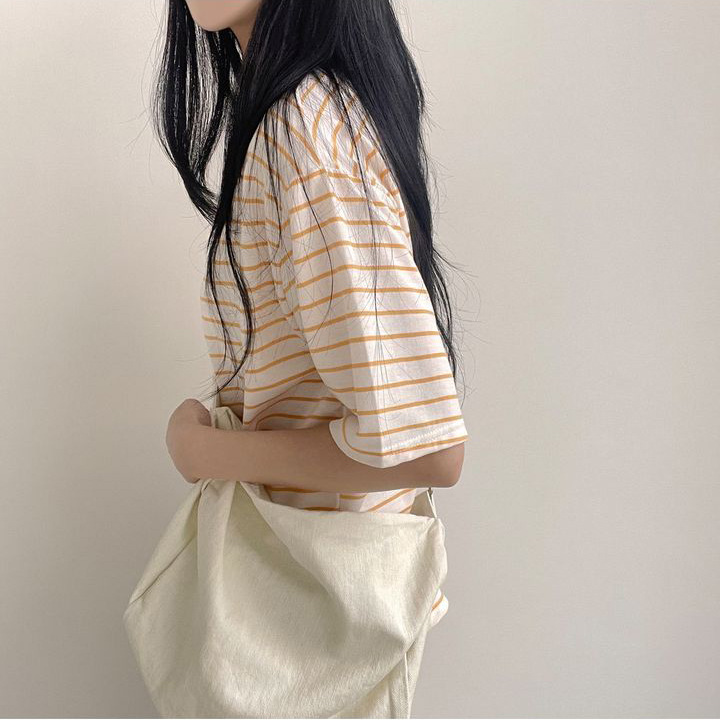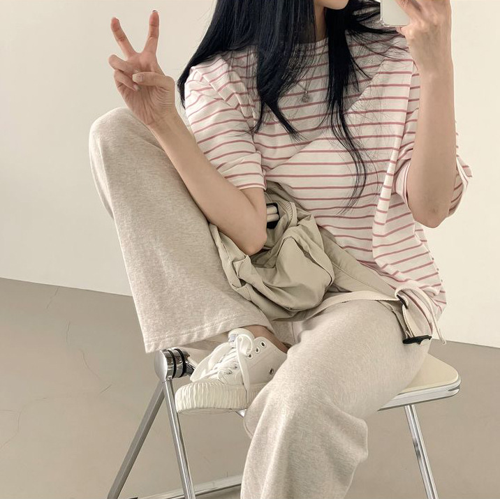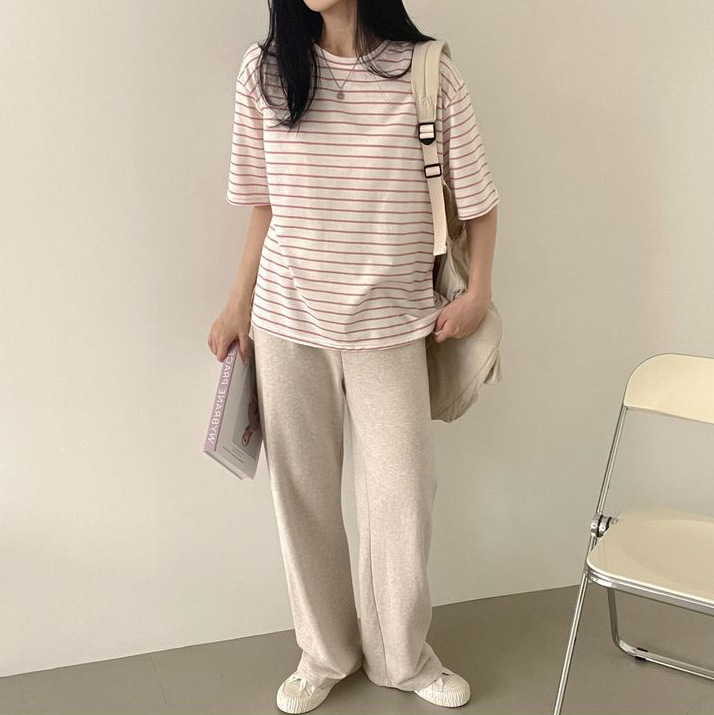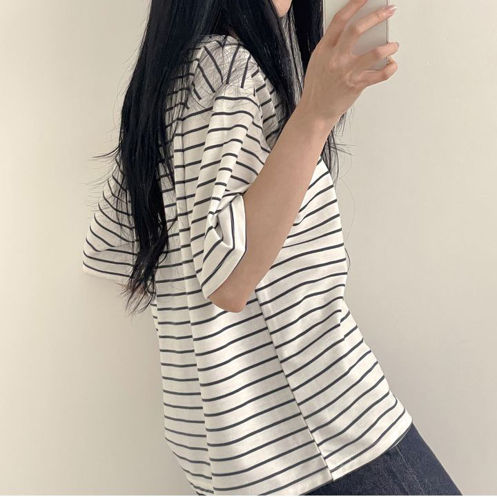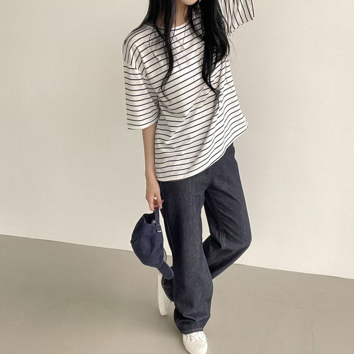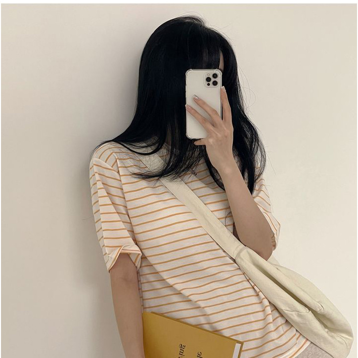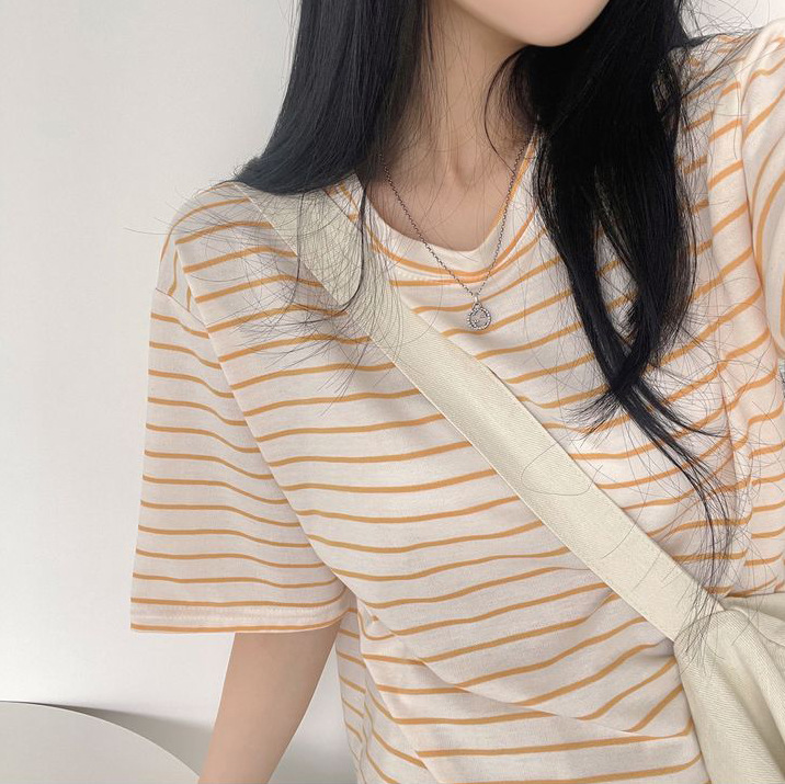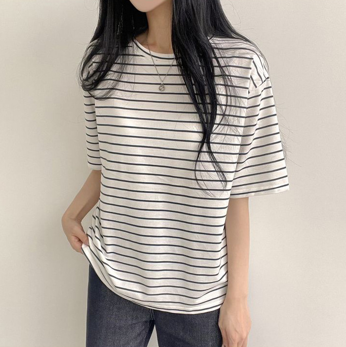100 면 스트라이프 반팔 티셔츠 여자 여름 학생 한국 느슨한 라운드 넥 모든 매치 탑 유행 여성복스토어 가기