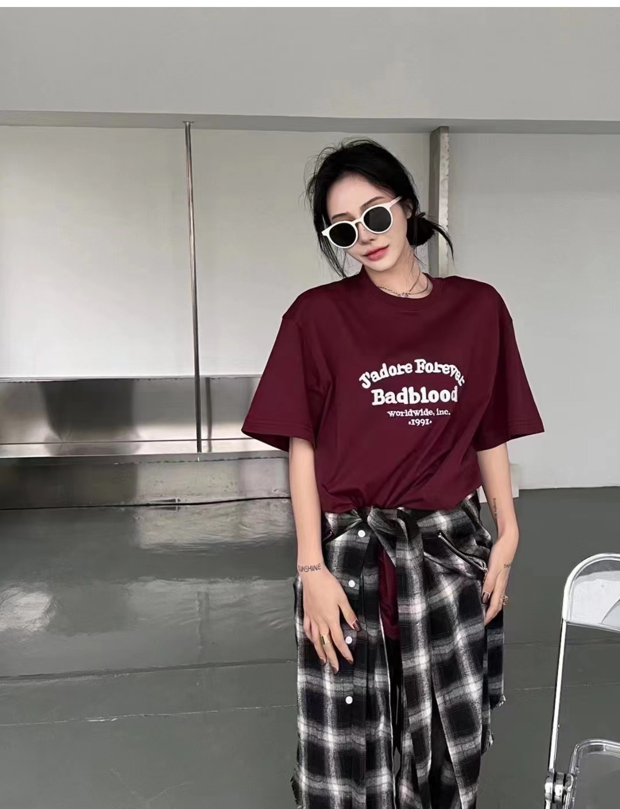 바드 블러드 라운드 넥 반팔 티셔츠 여성용 트렌디 브랜드 클래식 편지 자수 루즈 오버 사이즈 탑