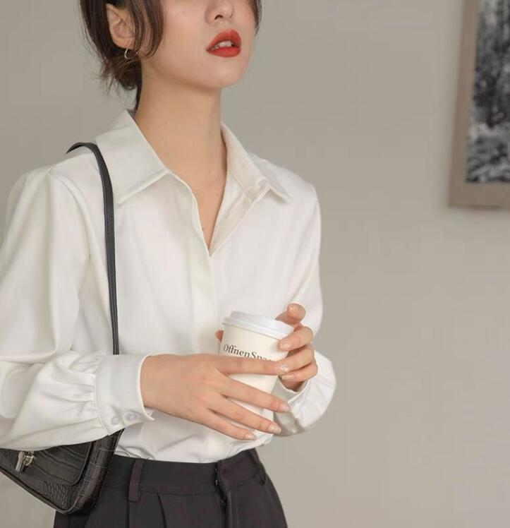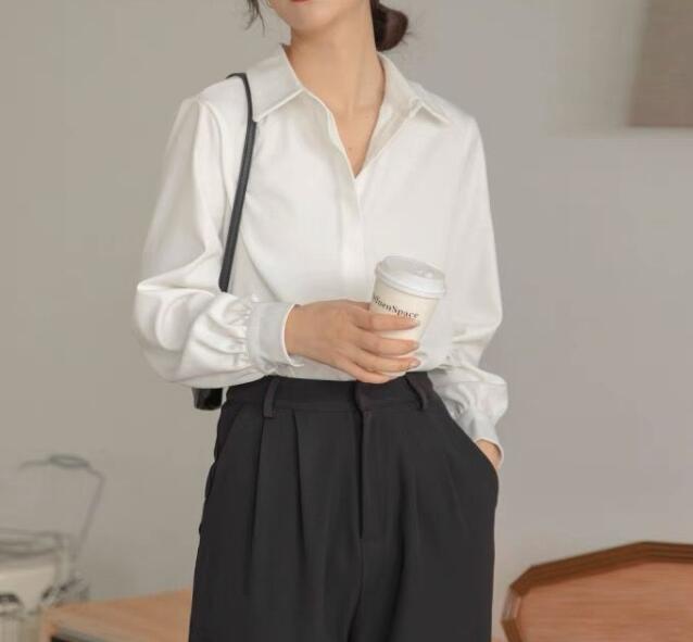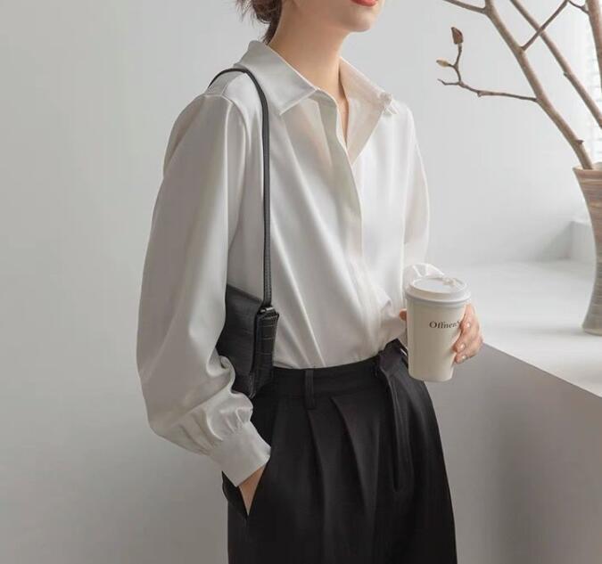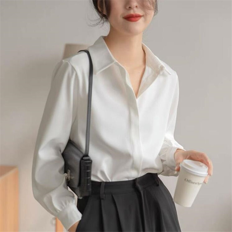 2025 봄, 가을 여성용 긴팔 흰색 셔츠, 루즈한 캐주얼, 주름 방지 디자인, 틈새 시장 셔츠, 드레이프 탑스토어 가기