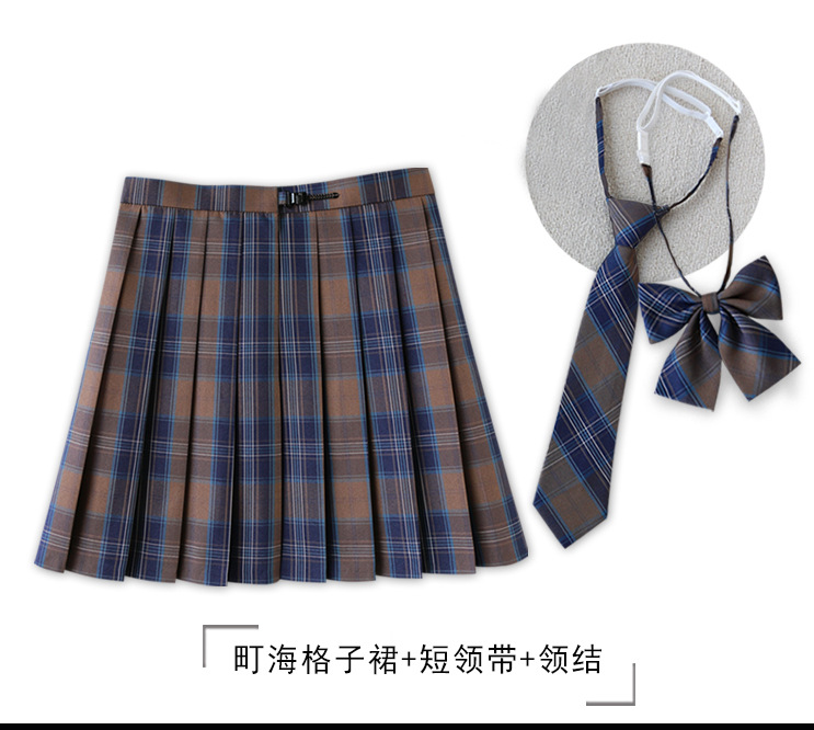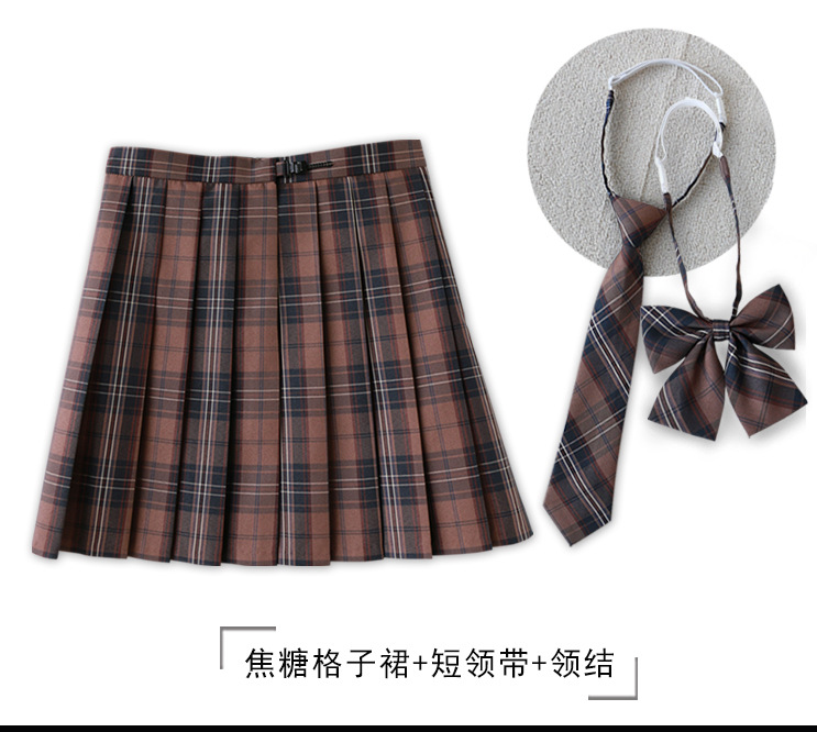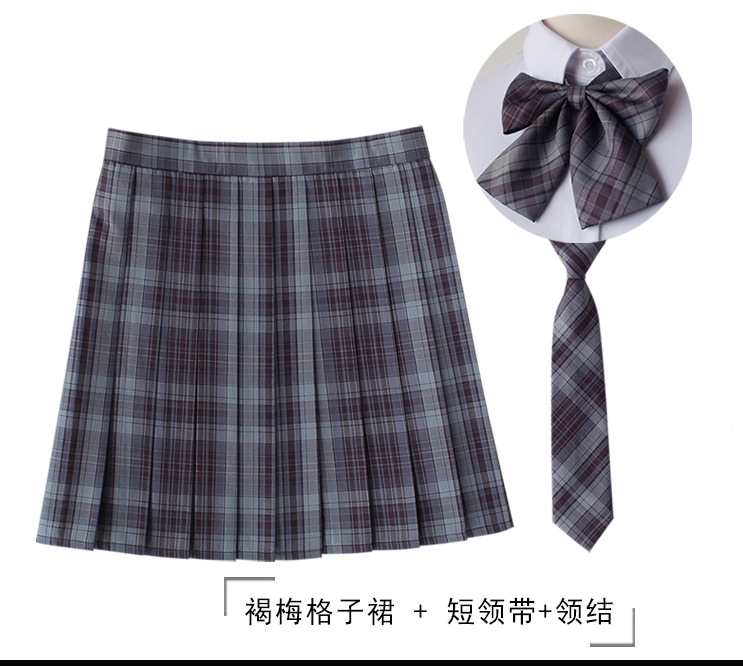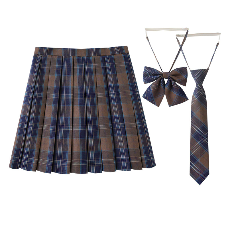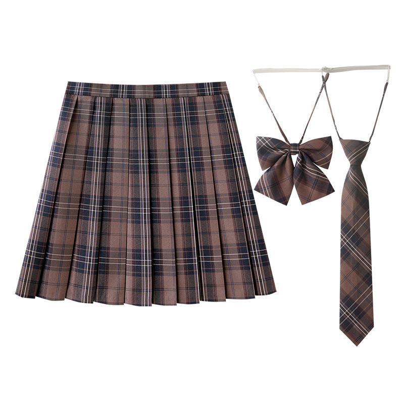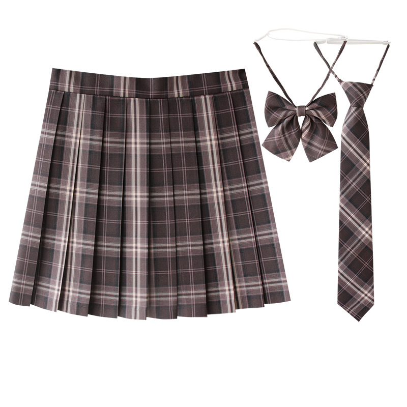 • 다크 브라운 체크 무늬 스커트 + 짧은 넥타이 + 나비 넥타이