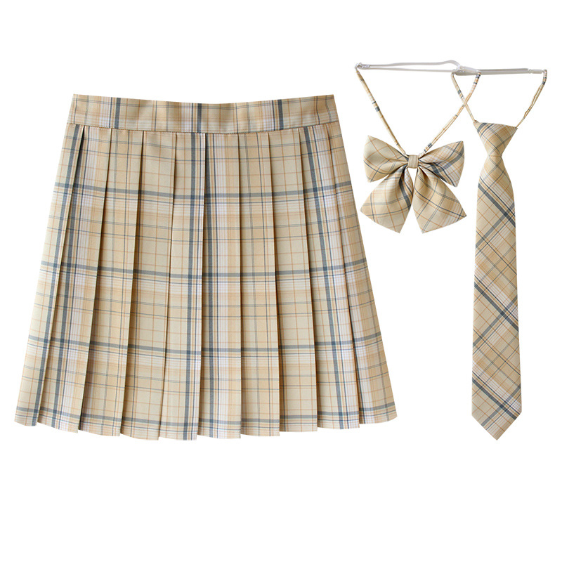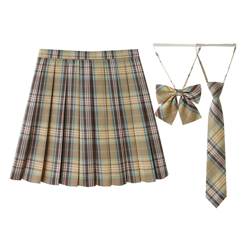 • 진한 베이지 체크 무늬 스커트 + 짧은 넥타이 + 나비 넥타이