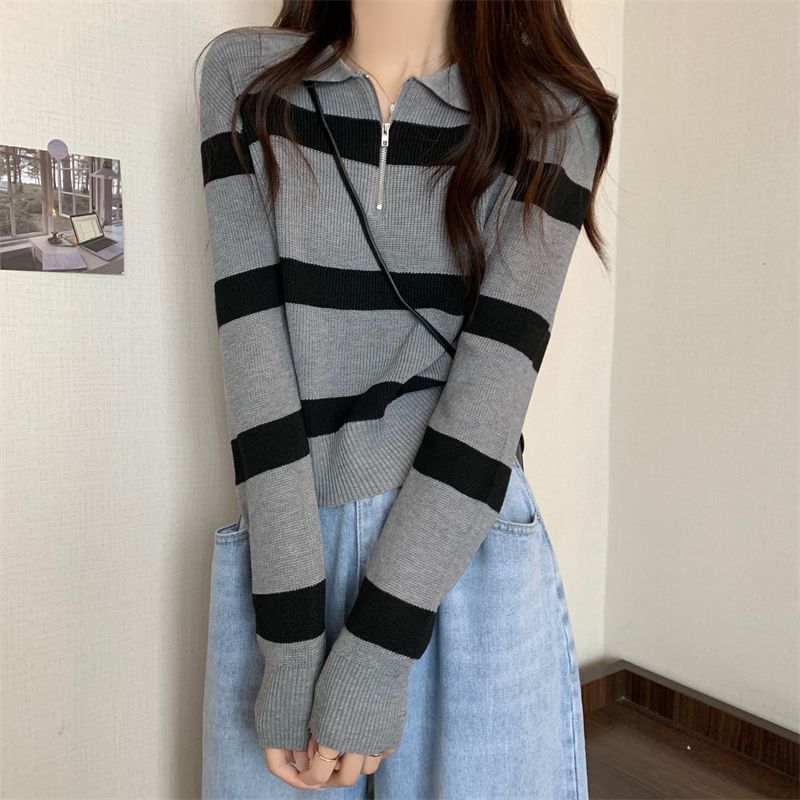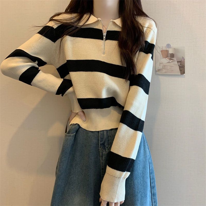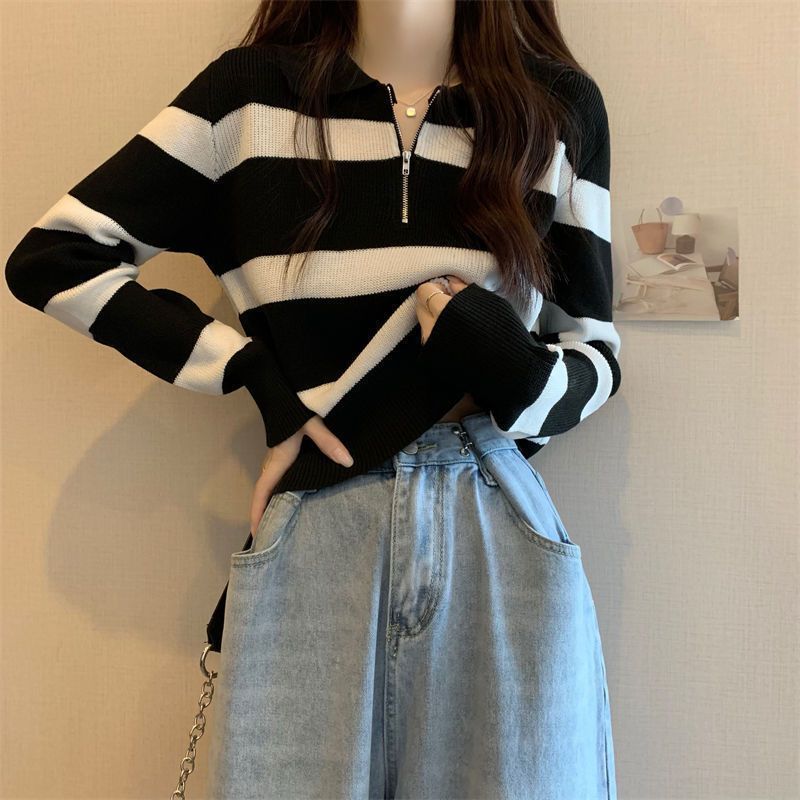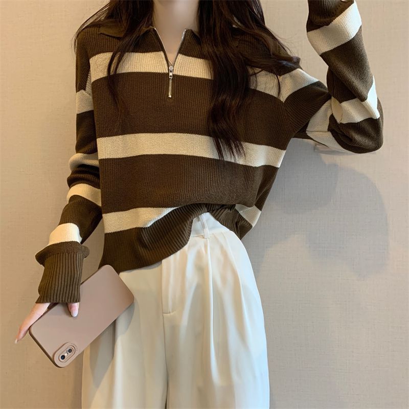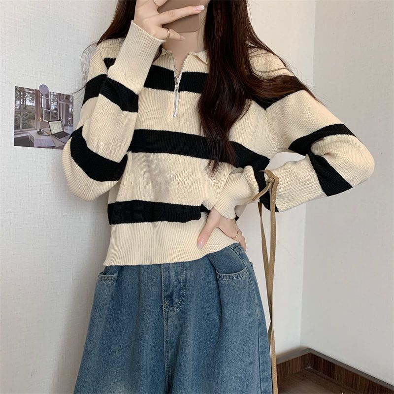 여성을위한 레트로 대비 색 줄무늬 하프 지퍼 풀오버 스웨터 2025 가을 새로운 바닥 셔츠 탑 디자인스토어 가기