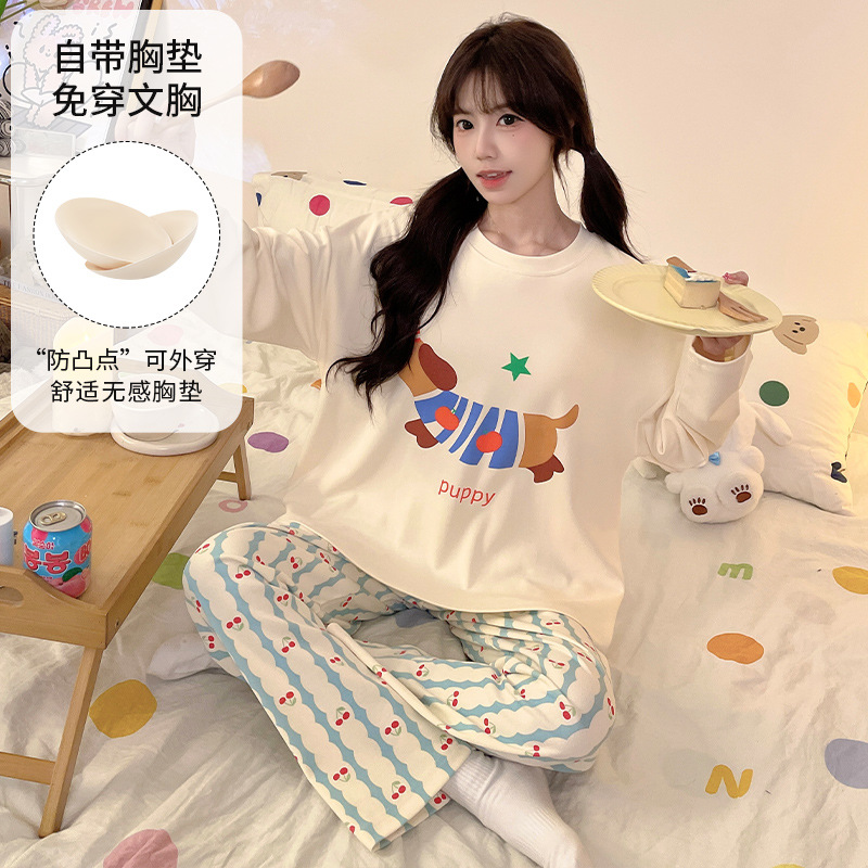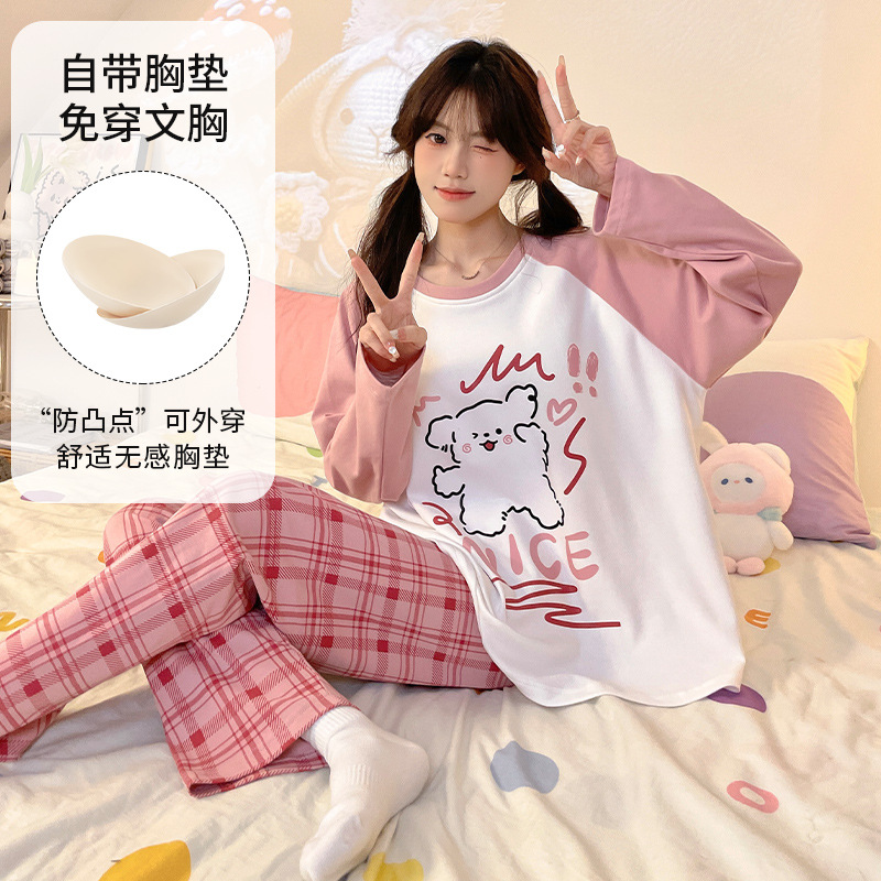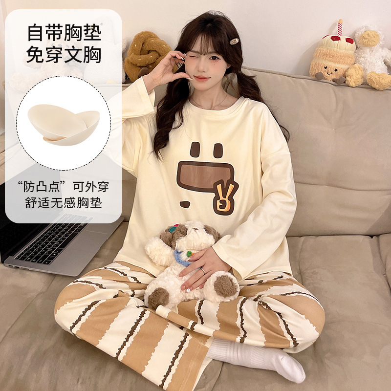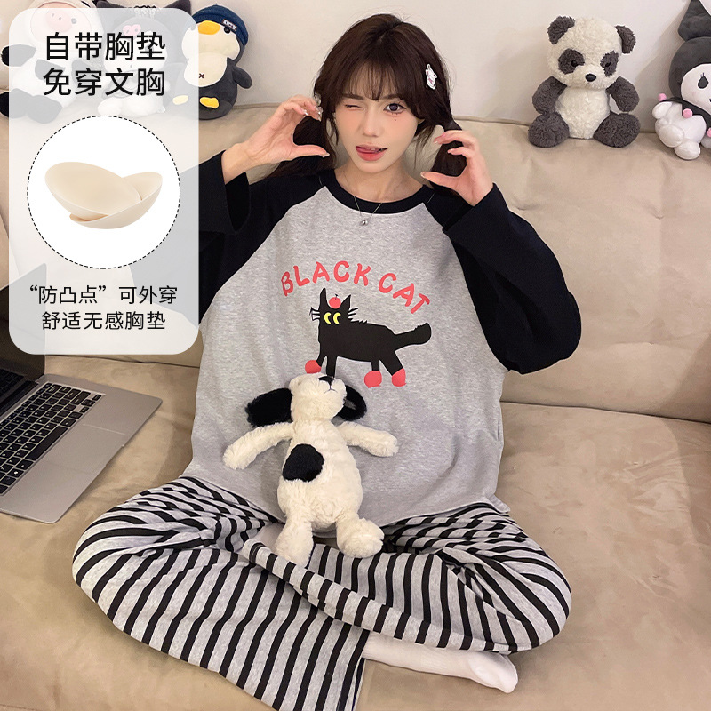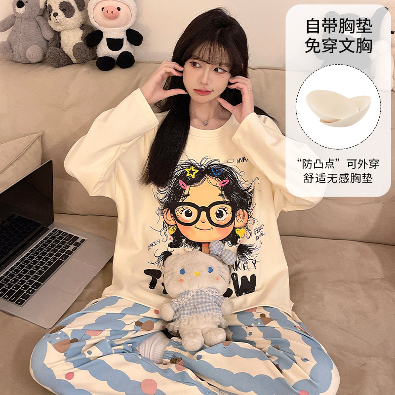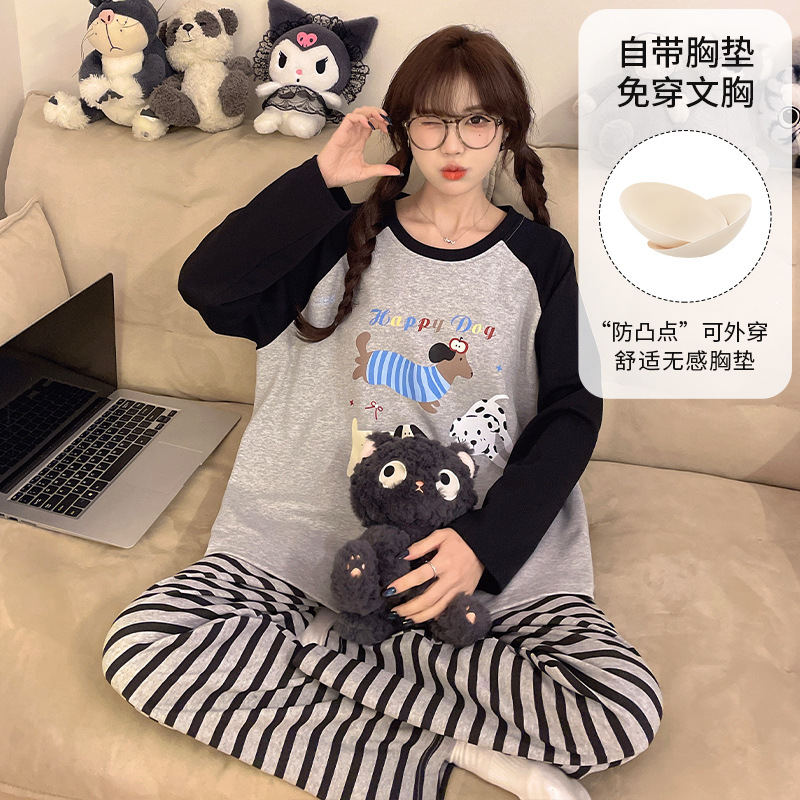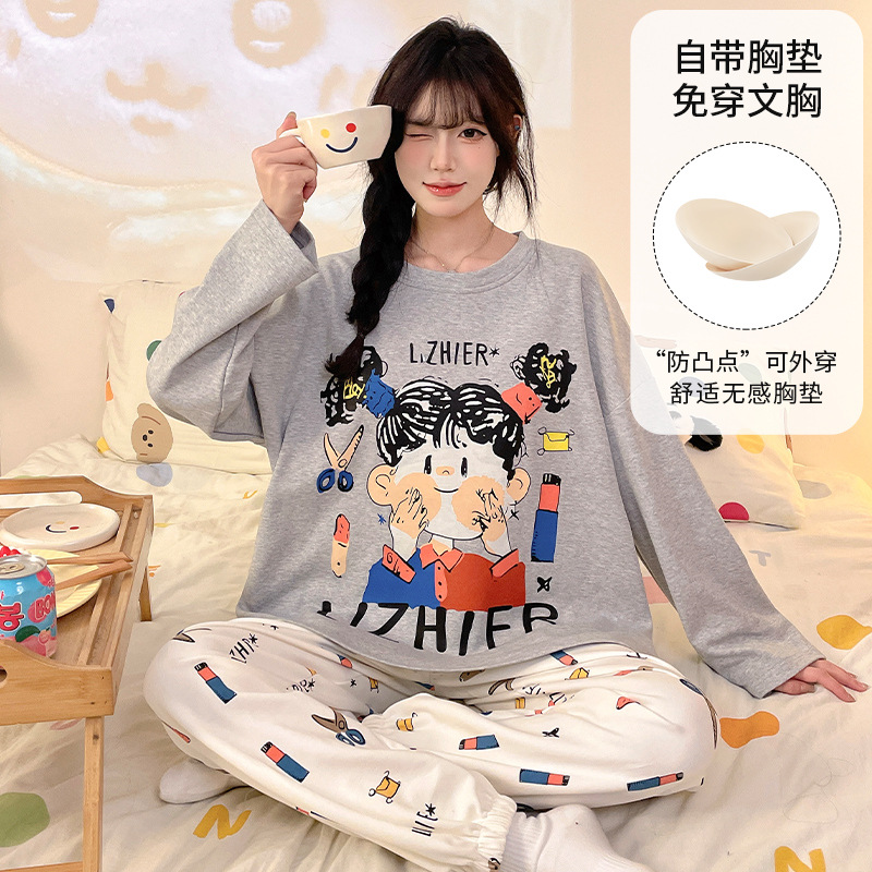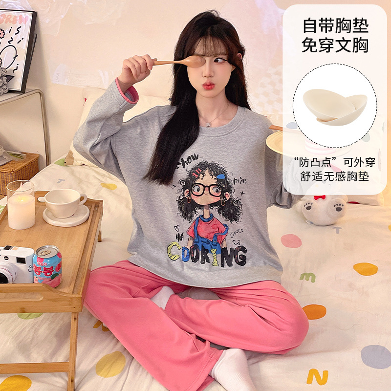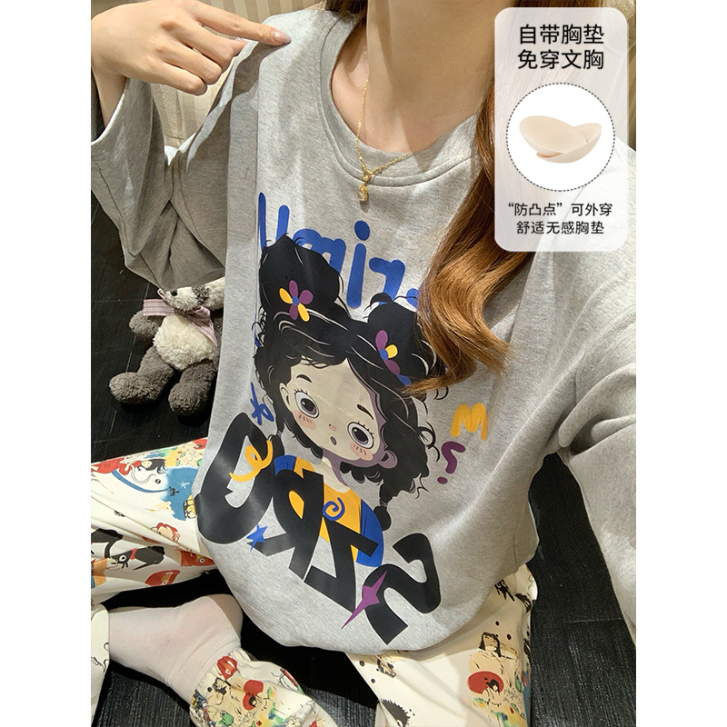 가슴 패드로 긴 소매 모조 면 잠옷 여자의 인터넷 연예인 세트 가을과 겨울 새로운 귀여운 학생 만화 가정 옷스토어 가기