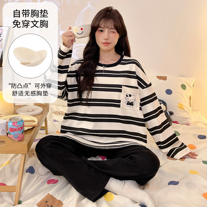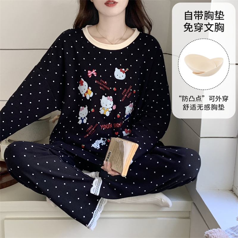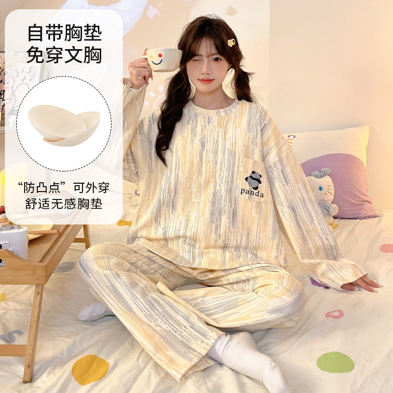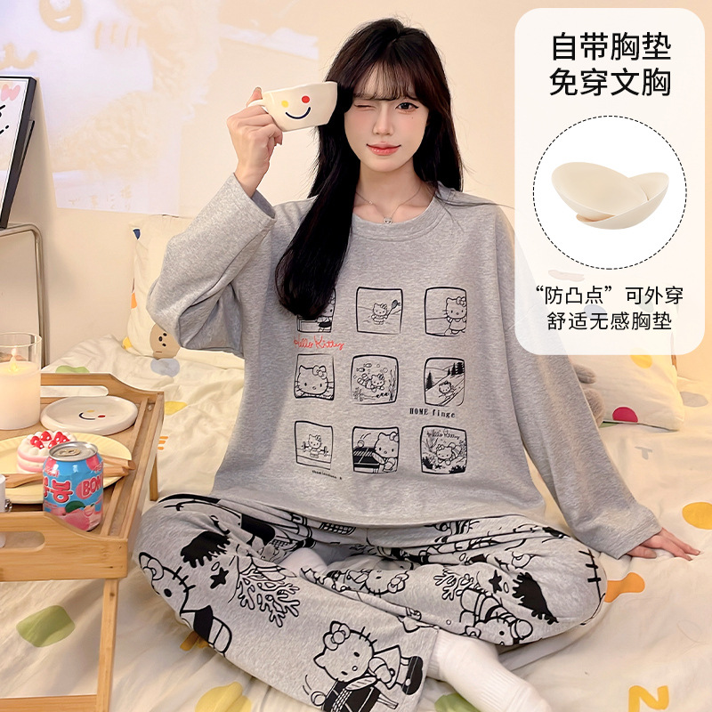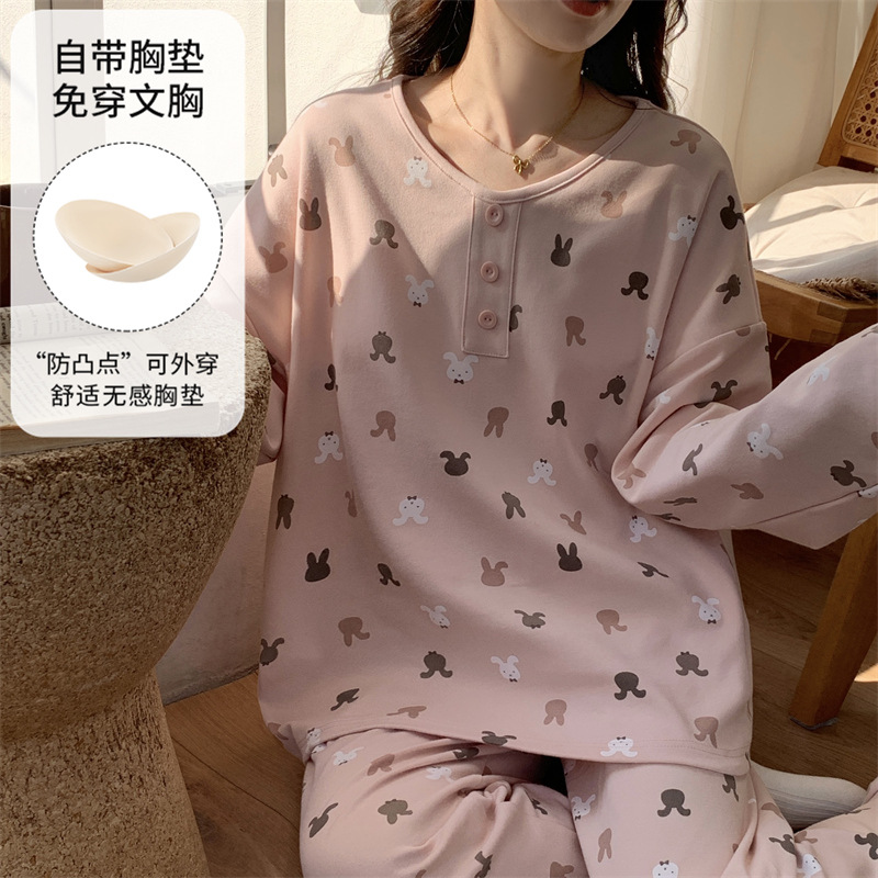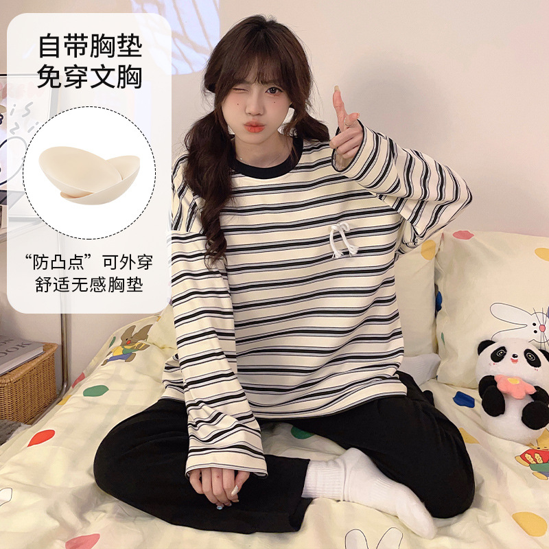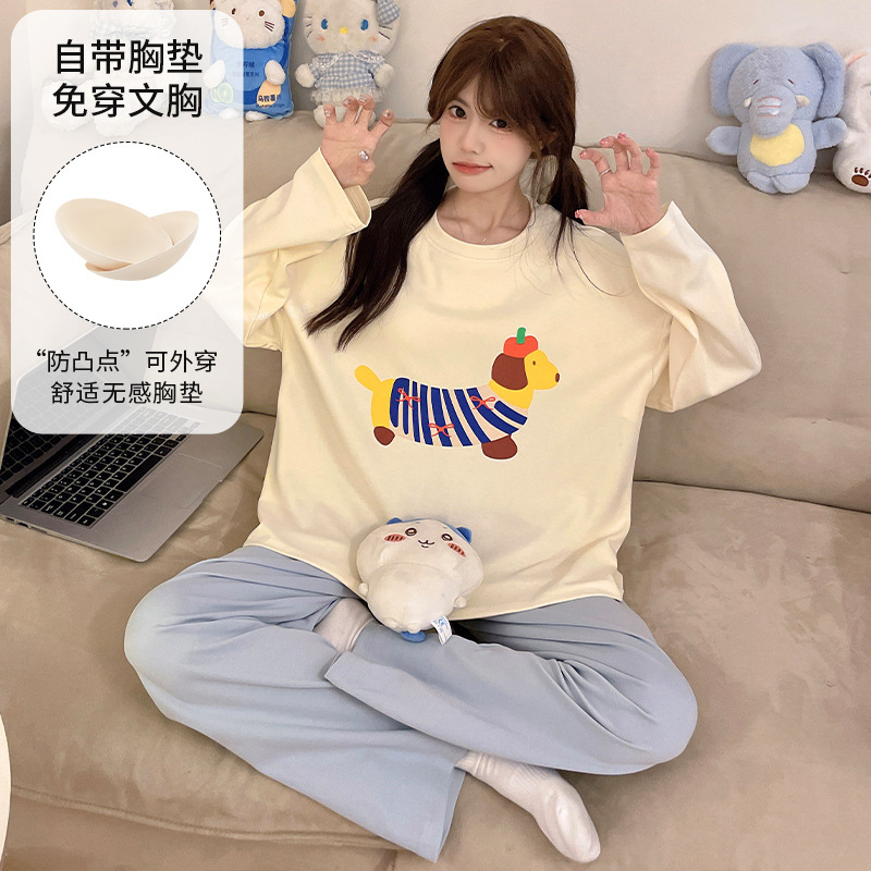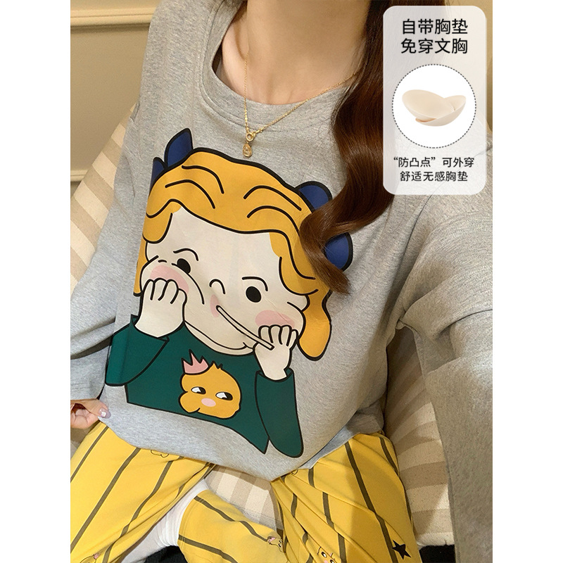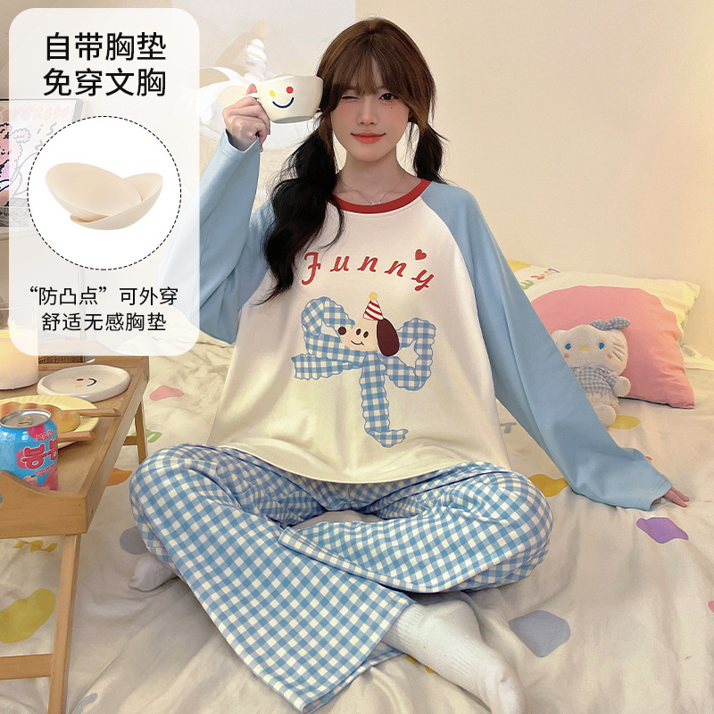 가슴 패드로 긴 소매 모조 면 잠옷 여자의 인터넷 연예인 세트 가을과 겨울 새로운 귀여운 학생 만화 가정 옷스토어 가기