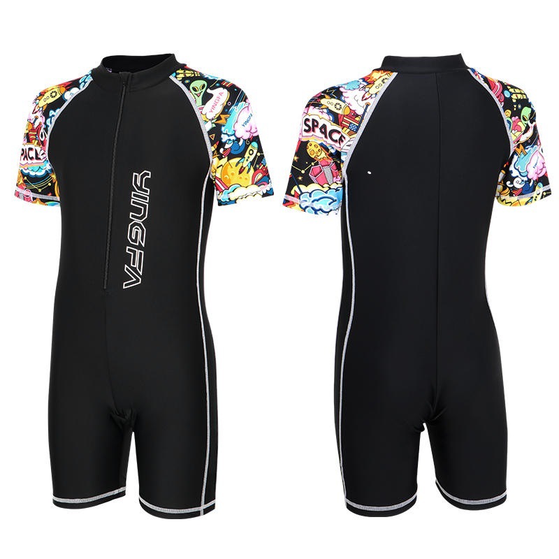 Yingfa 소년의 전면 지퍼 원피스 복서 수영복 중간 및 큰 소년을 위한 반팔 캐주얼 수영 세트 Y0567