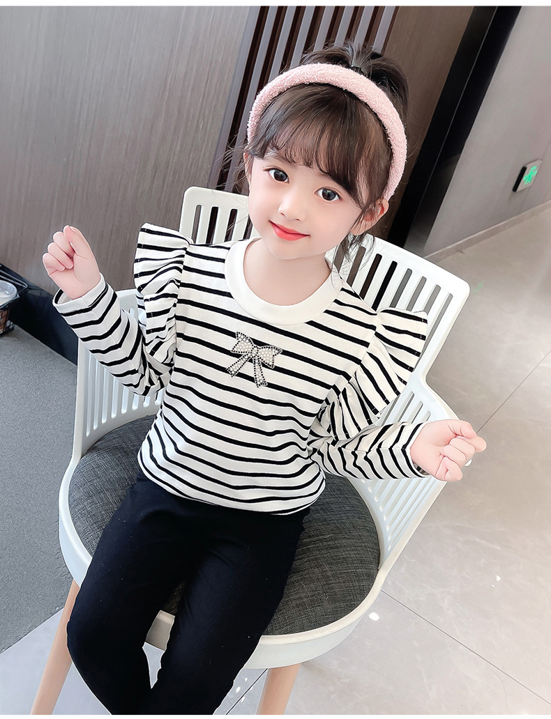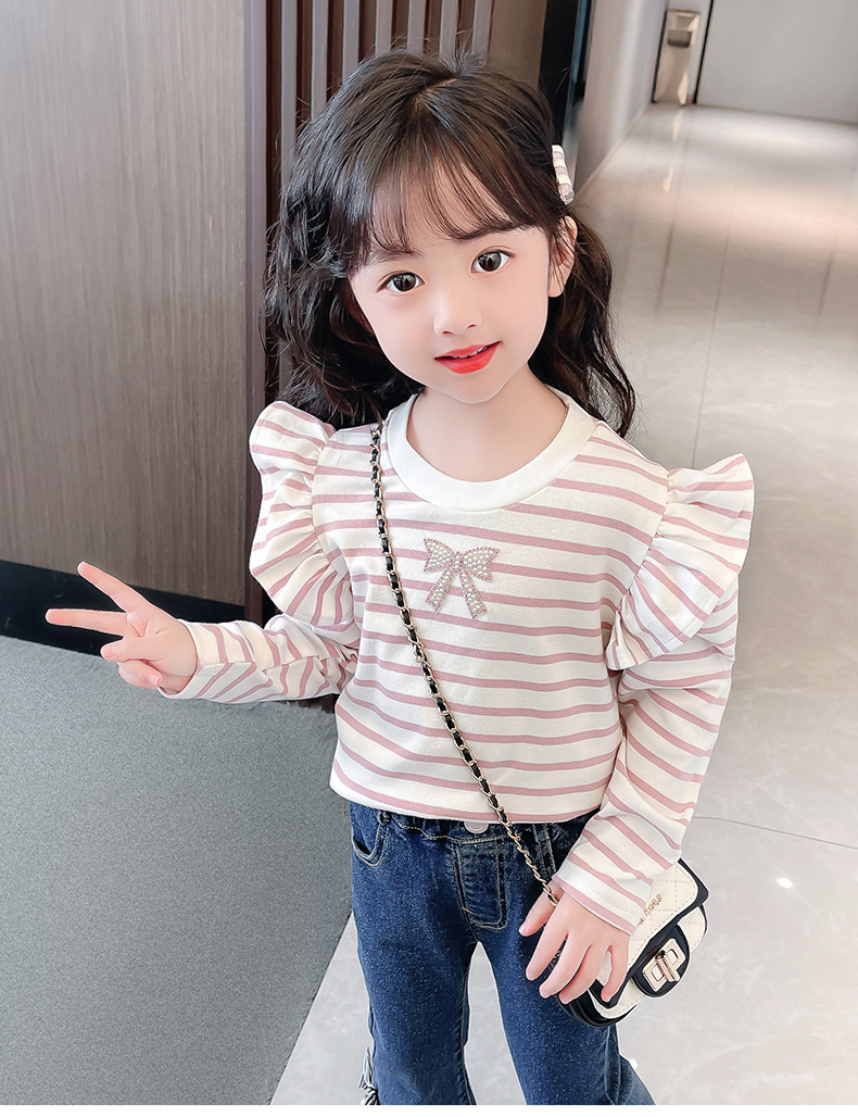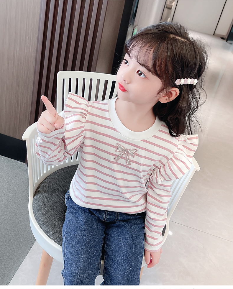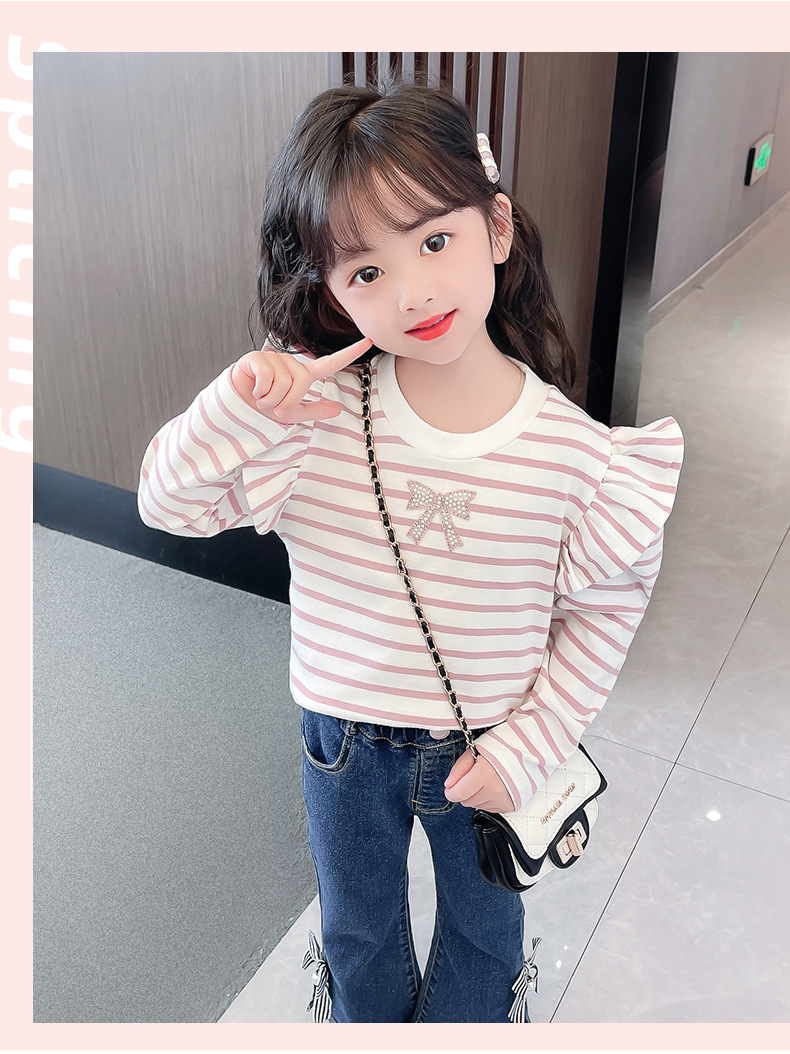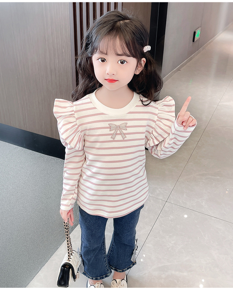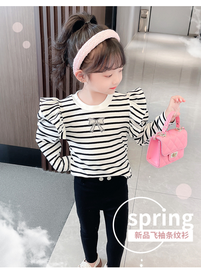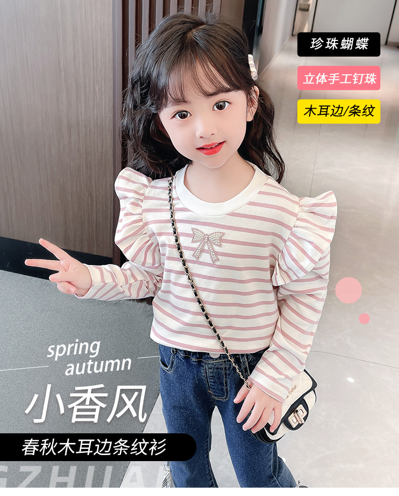 여아 의류 2025년 신상 봄옷 스트라이프 셔츠 이너웨어 플라잉 슬리브 나비 풀오버 면 긴팔 티셔츠