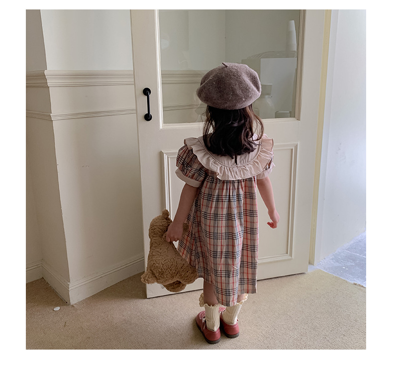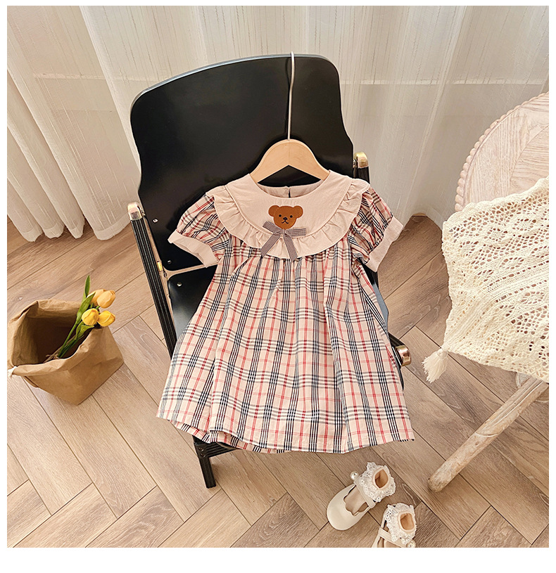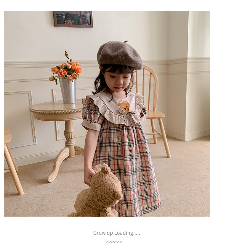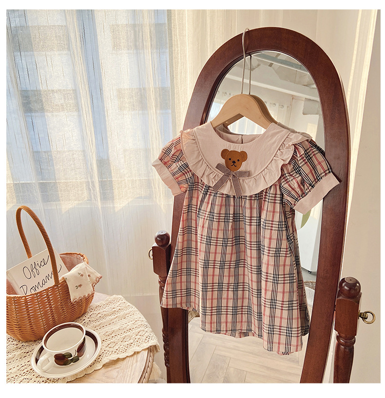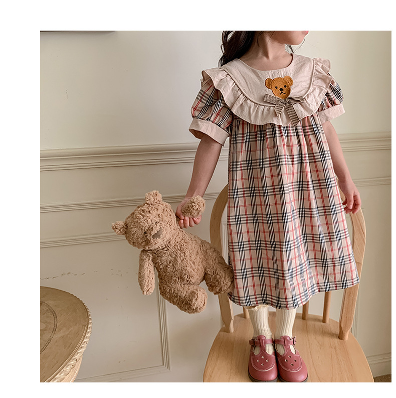 작은 곰 자수 체크무늬 여아 원피스 2025 여름 신상품 러플 레이스 여아 인형 원피스 반팔 원피스스토어 가기