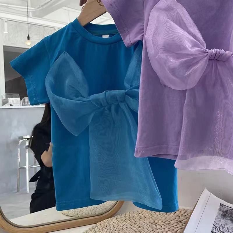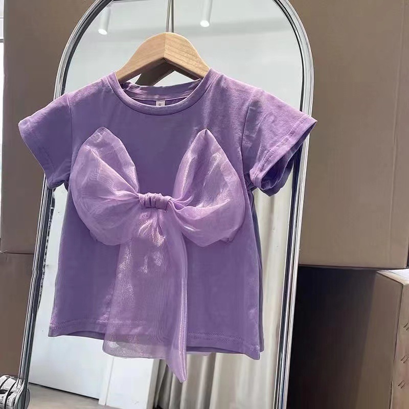 여자 아기를위한 새로운 스타일 2025 여름 티셔츠 유행 한국 스타일 유행 라운드 넥 솔리드 컬러 보우 순수 코튼 반팔