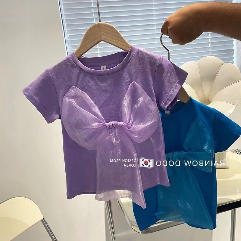 여자 아기를위한 새로운 스타일 2025 여름 티셔츠 유행 한국 스타일 유행 라운드 넥 솔리드 컬러 보우 순수 코튼 반팔스토어 가기
