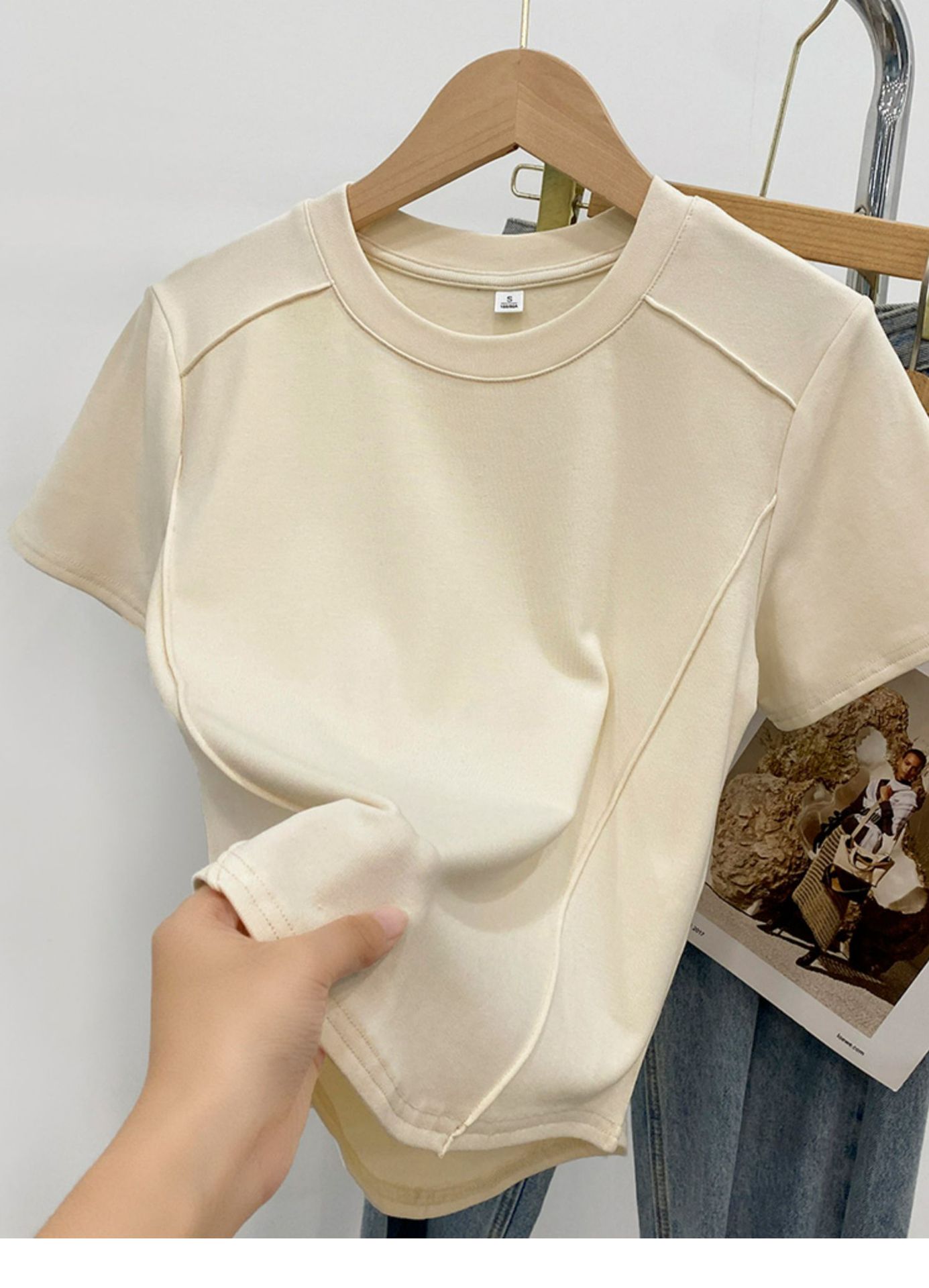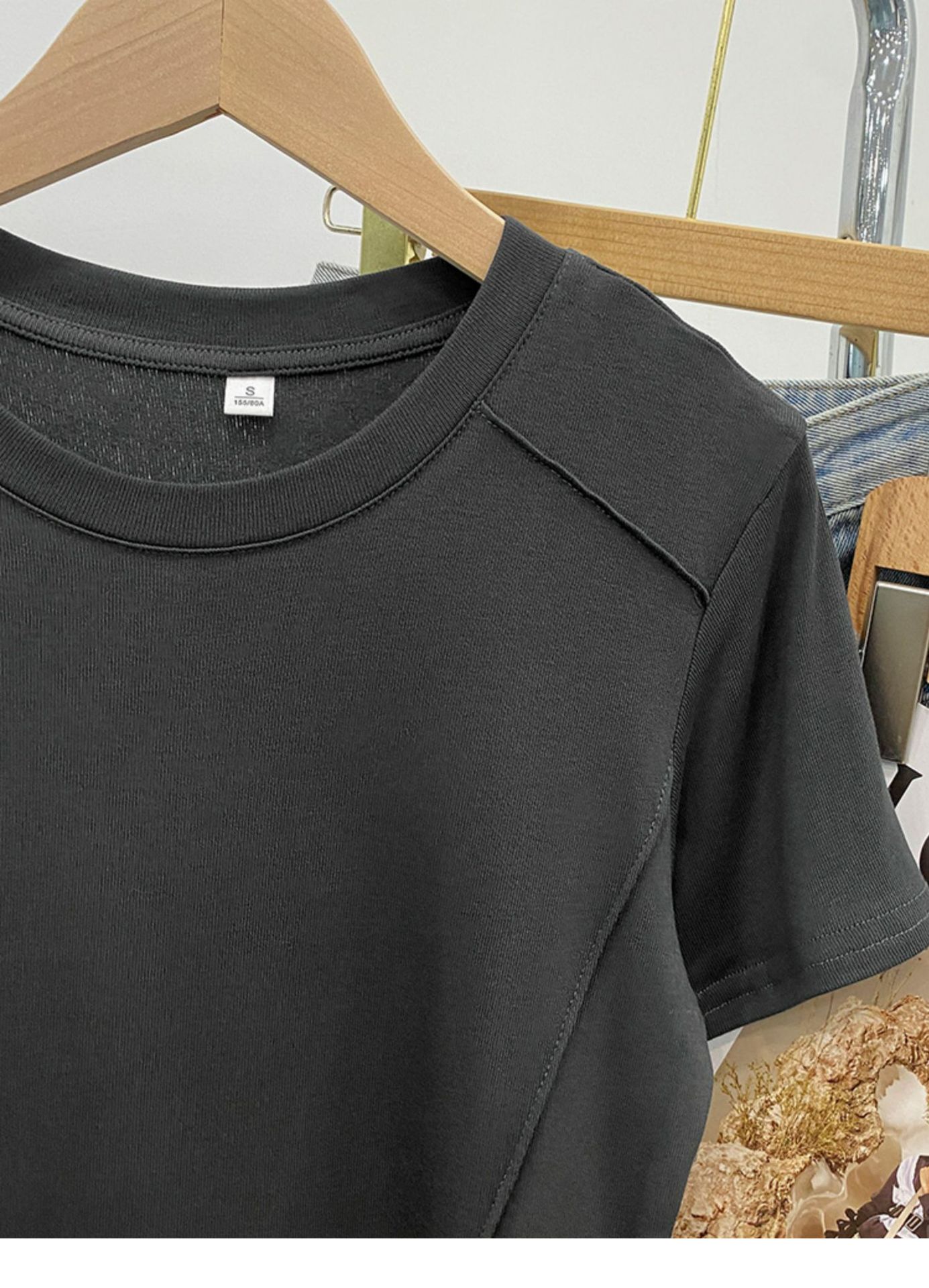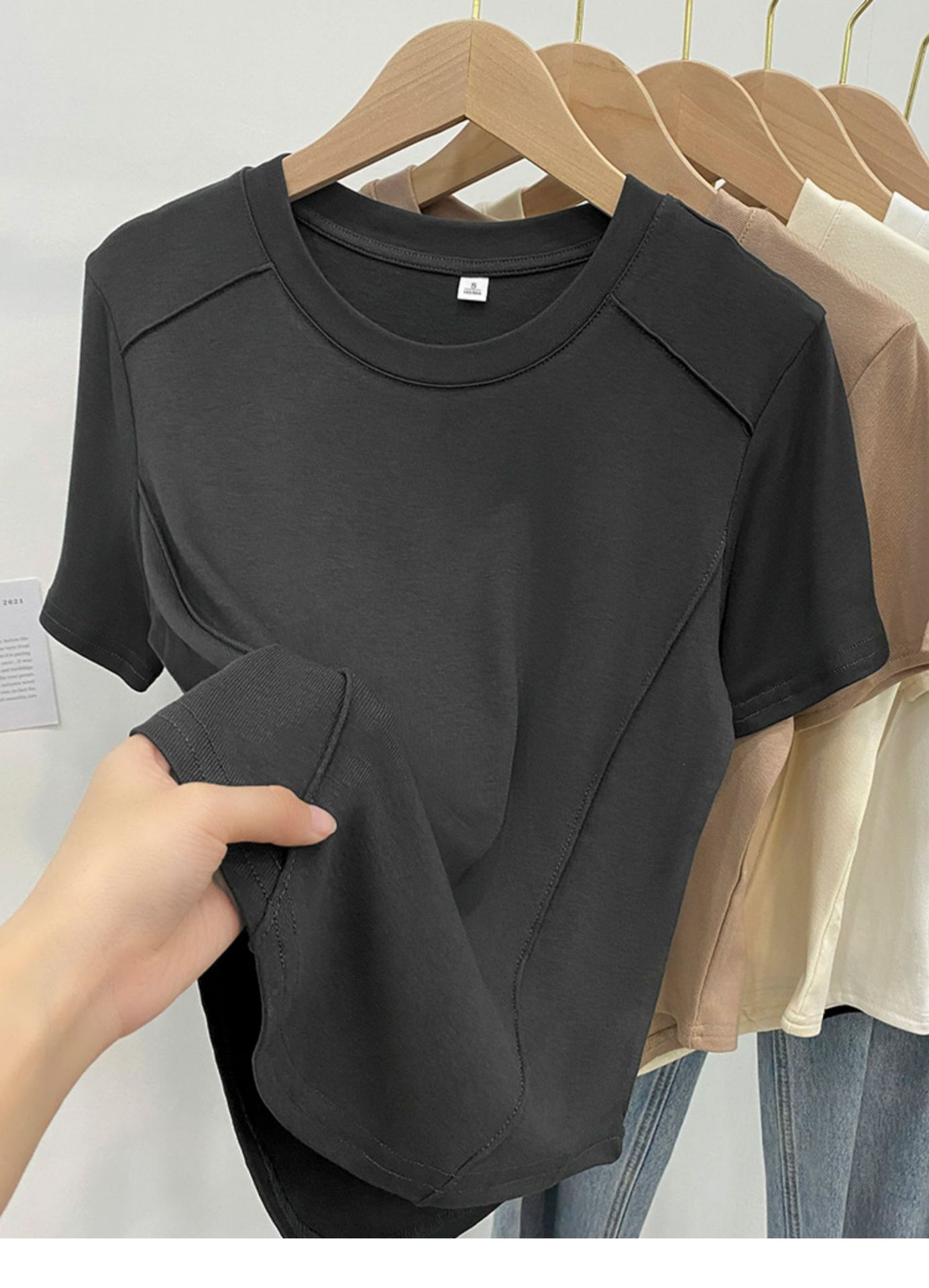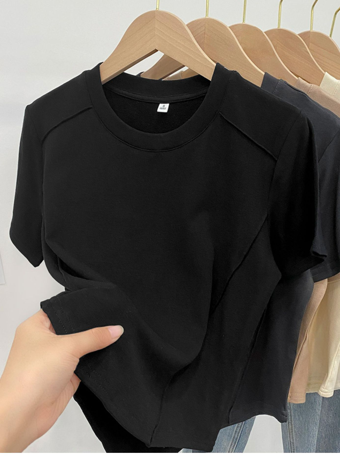 여성을위한 솔리드 컬러 라운드 넥 반팔 슬림 티셔츠 여름과 유럽 스타일의 새로운 스타일 외국 스타일 연령 감소 생선 뼈 짧은 오른쪽 어깨 셔츠스토어 가기