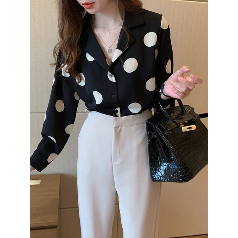 폴로 도트 셔츠 여성용 2023 봄 홍콩 스타일 레트로 탑 디자인 센스 틈새 빛 성숙한 쉬폰 셔츠 베이스 셔츠 트렌디스토어 가기