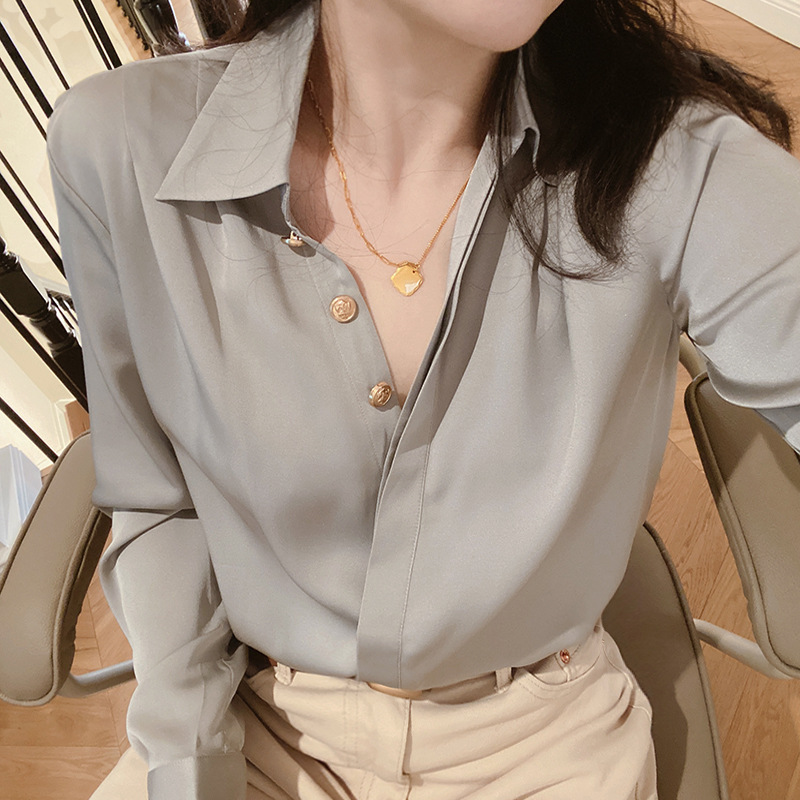 프랑스 레트로 하이 JI 센스 메탈 버클 통근 우아한 그레이 디자인 엘리트 스타일 더블 조 새틴 실크 긴 소매 셔츠