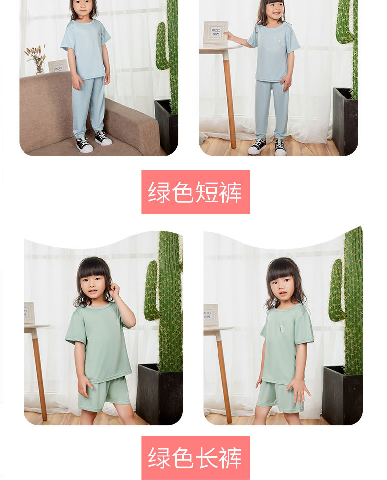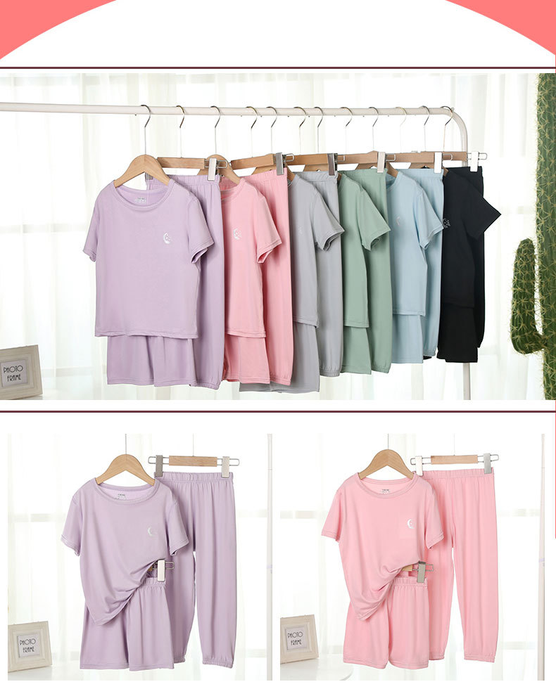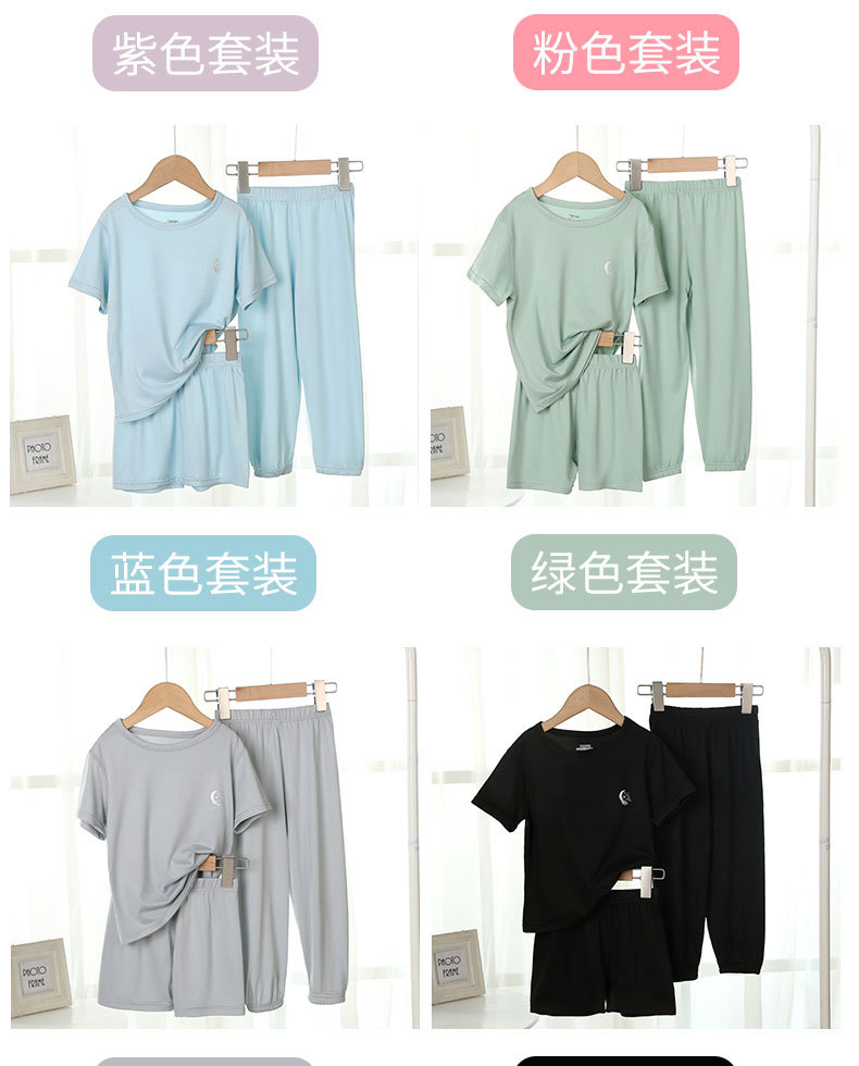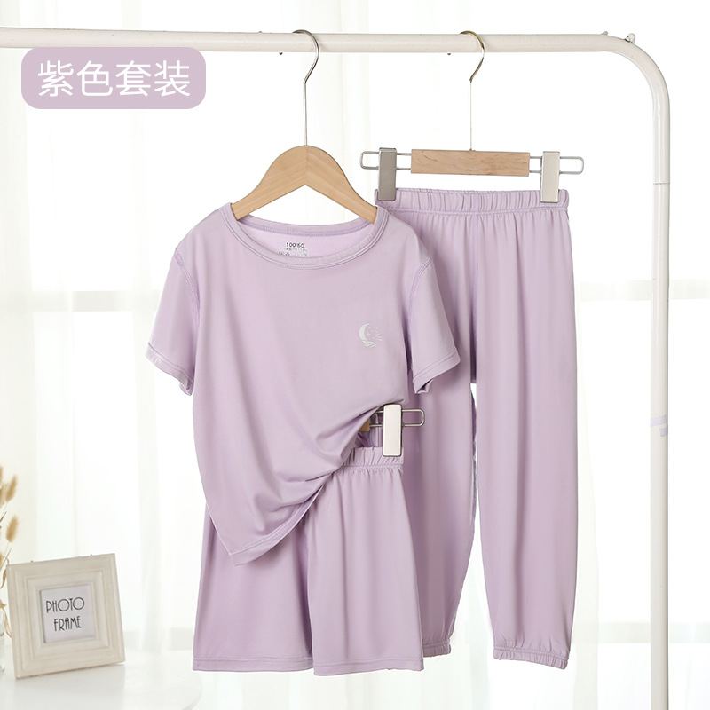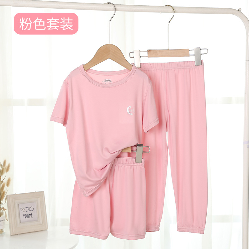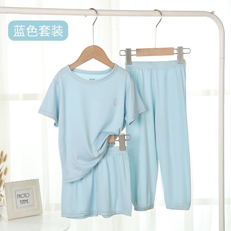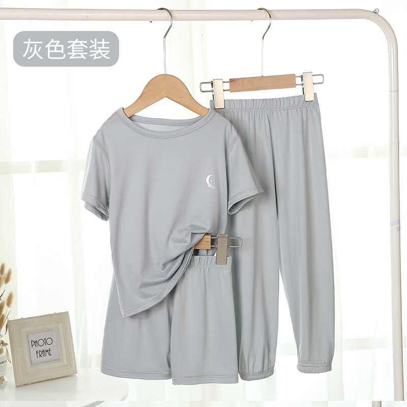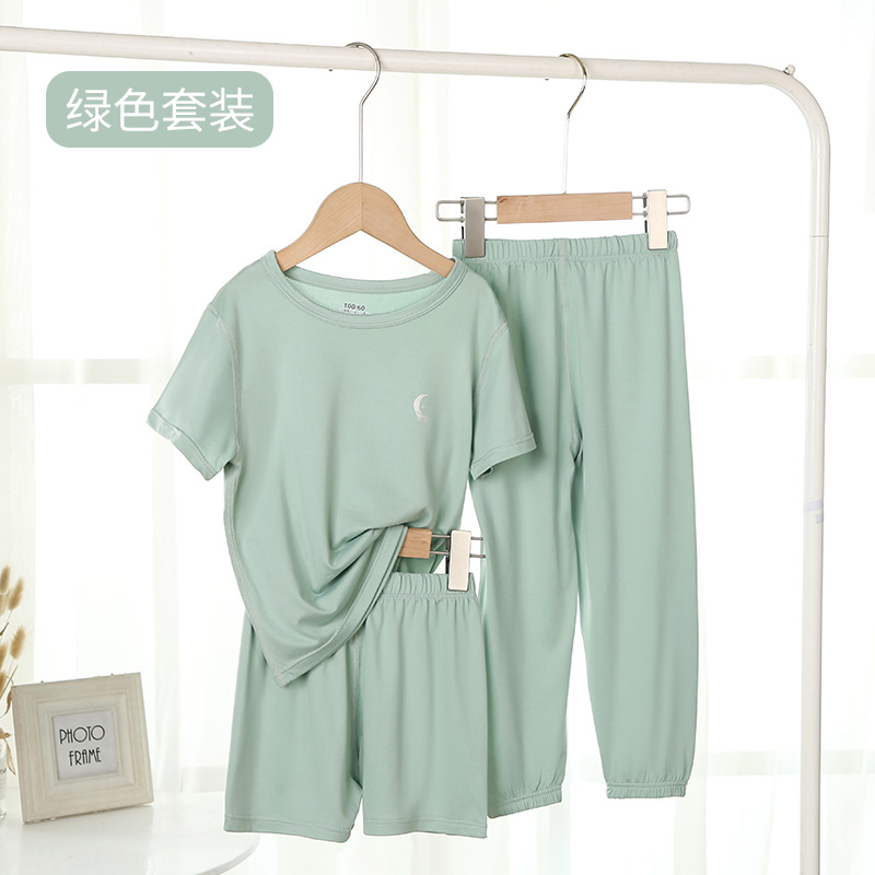 어린이 가정복 3 피스 반팔 반바지 소년 소녀 바지 에어컨 요금 어린이 얇은 잠옷 단색
