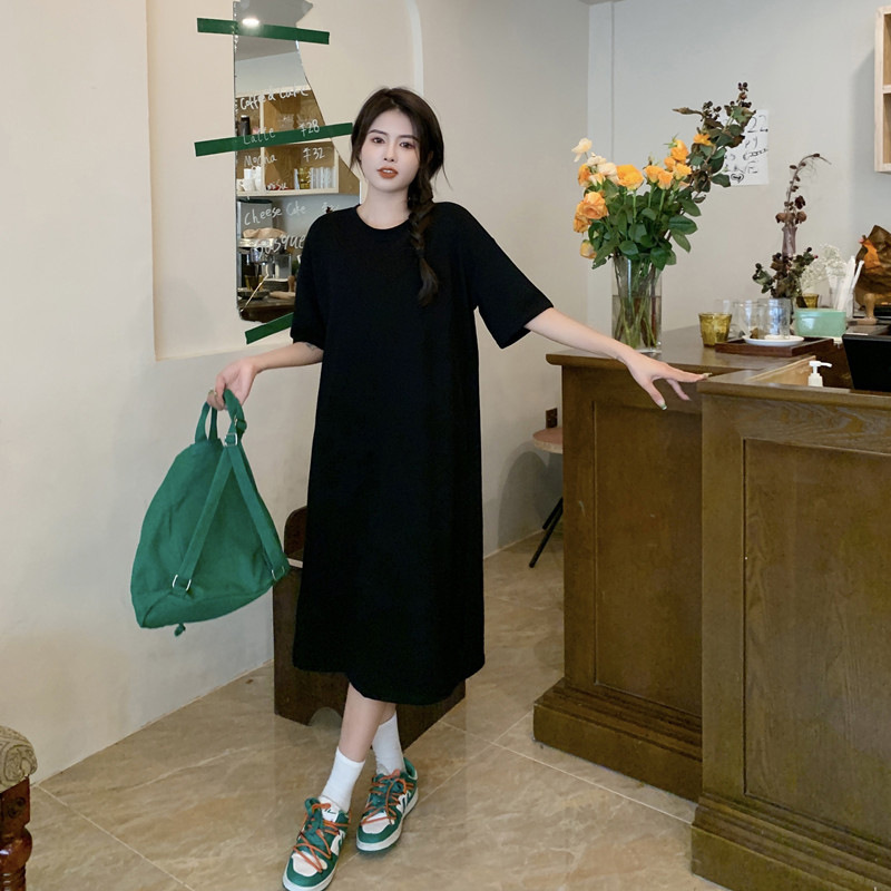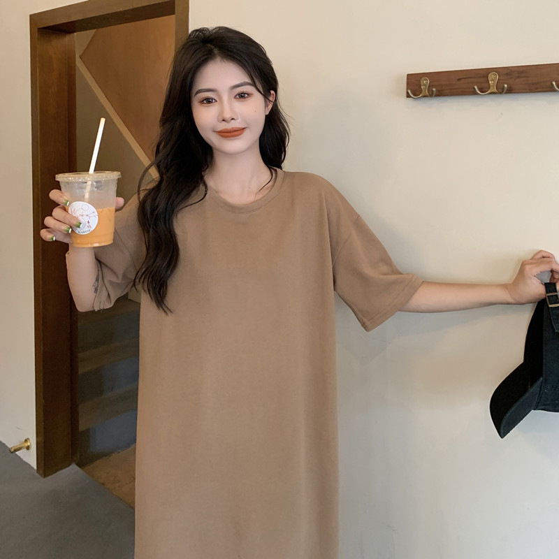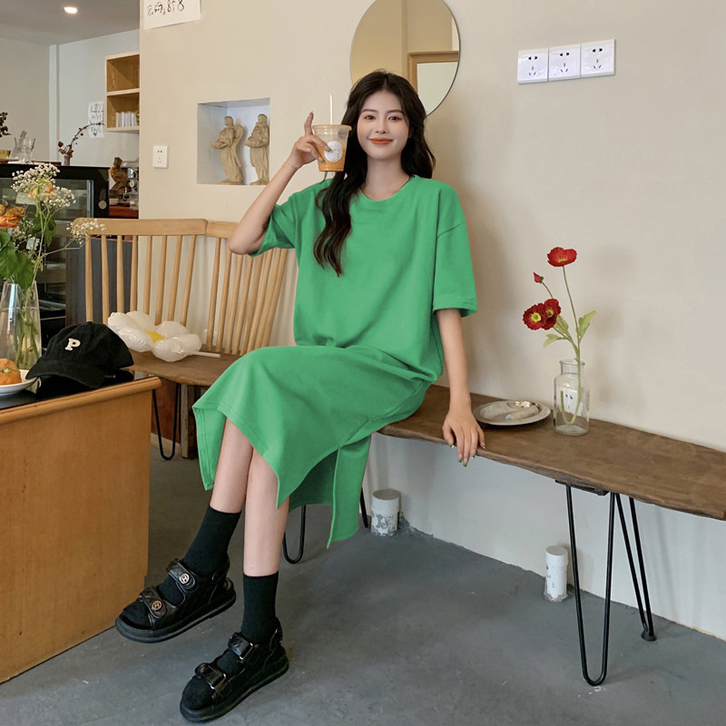 플러스 사이즈 반팔 캐주얼 원피스 여성 여름 2023 새로운 느슨한 단색 중간 길이 오버 무릎 스플릿 티셔츠 원피스스토어 가기