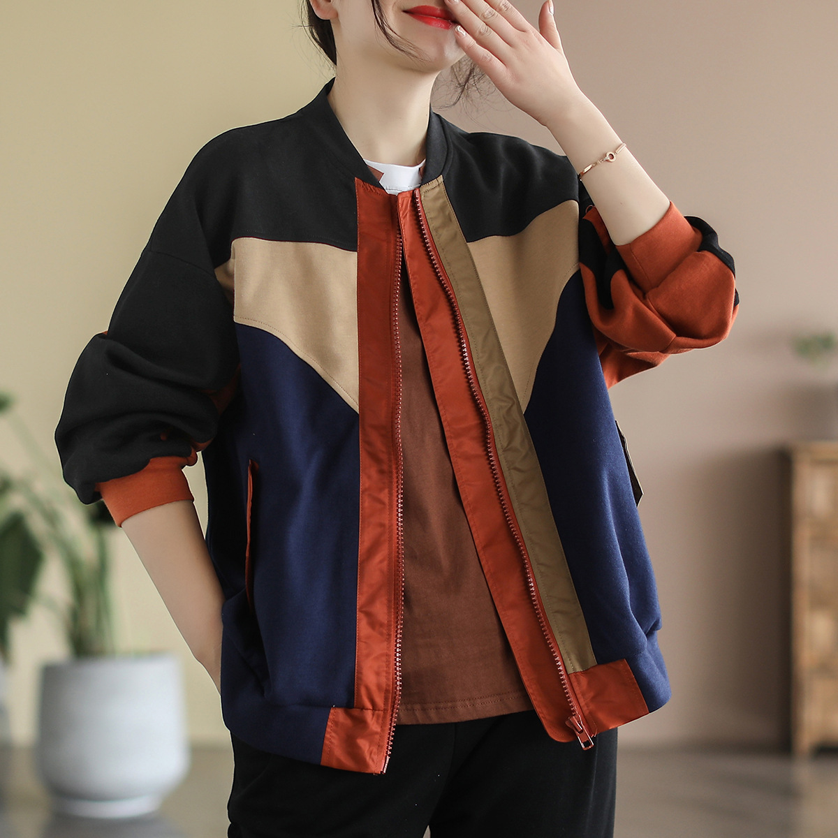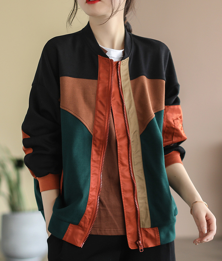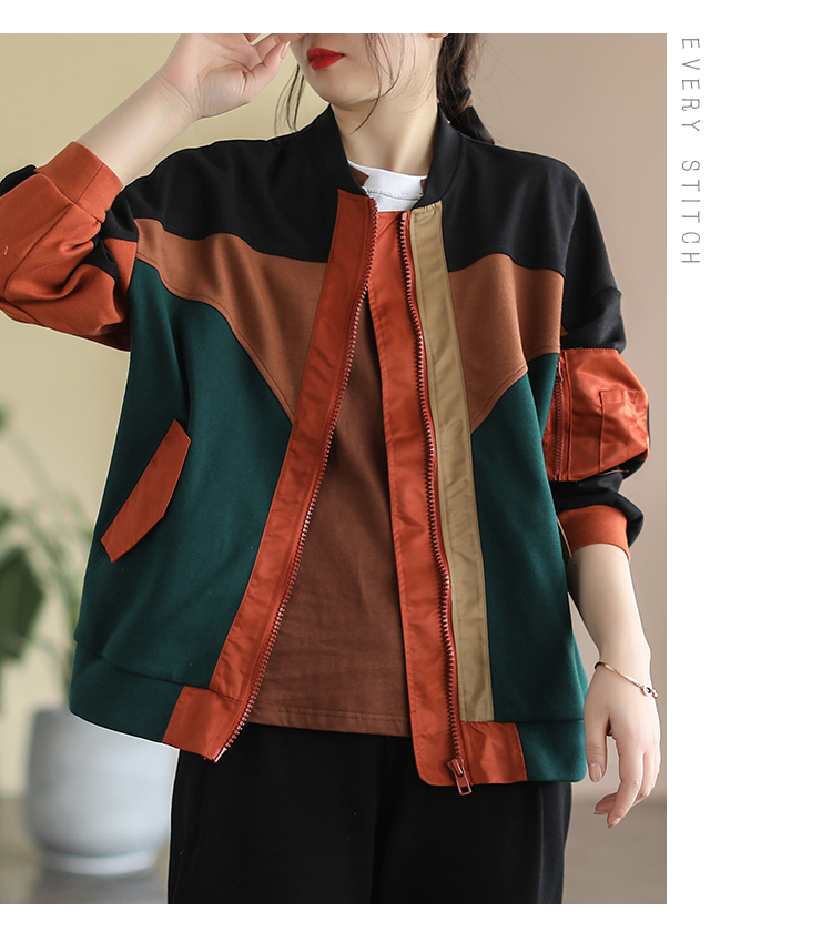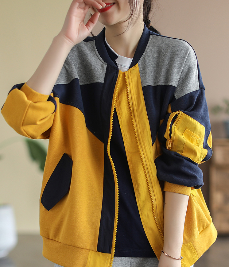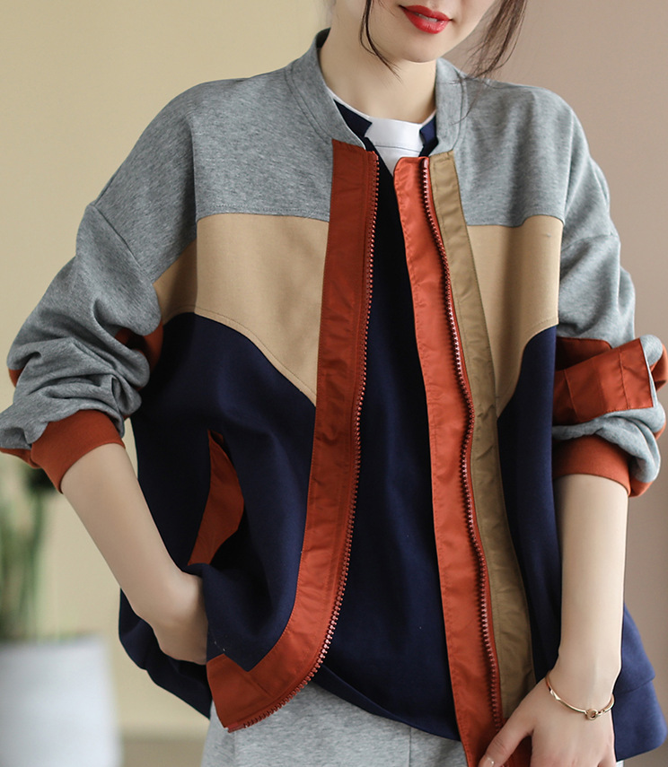 2023 봄 새로운 예술적 스티치 레트로 야구 칼라 컬러 블록 면 짧은 코트 탑 여성