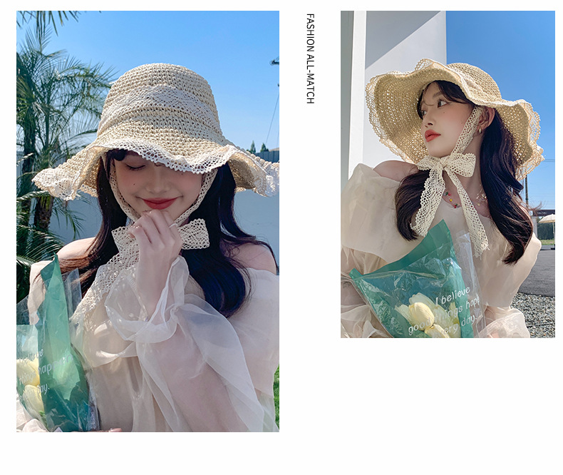 밀짚 모자 한국식 레이스 업 중공 밀짚 모자 여성용 여름 여행 자외선 차단제 비치 태양 모자 레이스 차양 모자스토어 가기