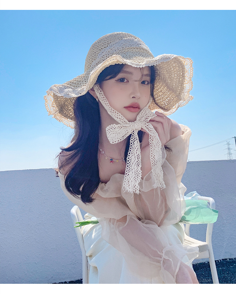 밀짚 모자 한국식 레이스 업 중공 밀짚 모자 여성용 여름 여행 자외선 차단제 비치 태양 모자 레이스 차양 모자