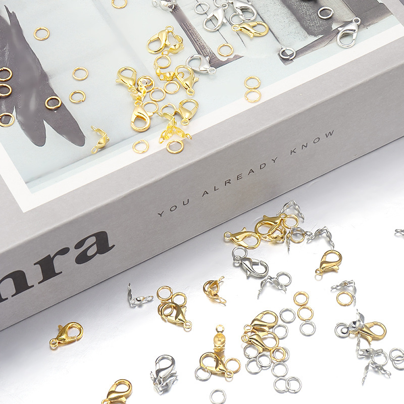 6格圆盒串珠配件,龙虾扣12*6金色银色各25个,单圈5mm各100个,包扣各100个